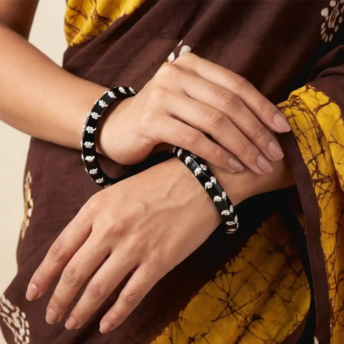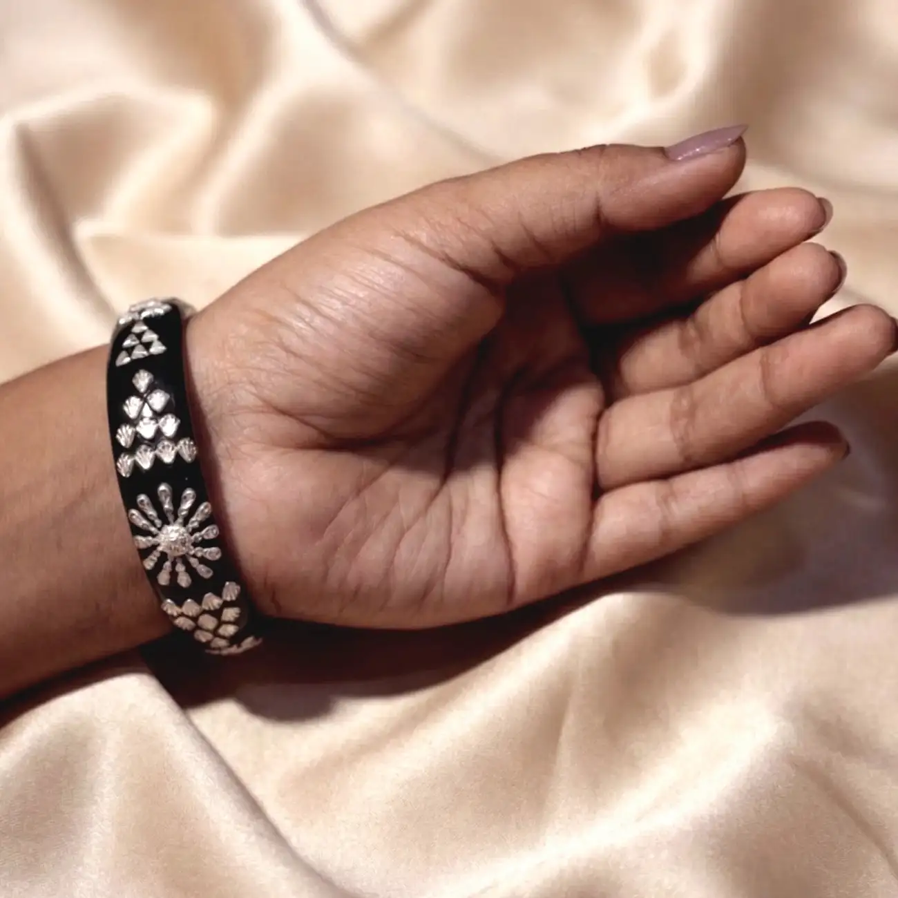 Black Pola Bangle with Silver Floral Work