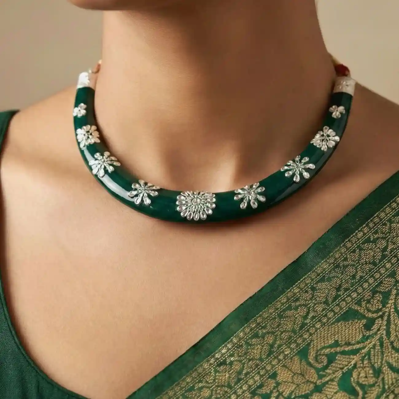 Green Pola Neckpiece & Floral Stud Earrings Set