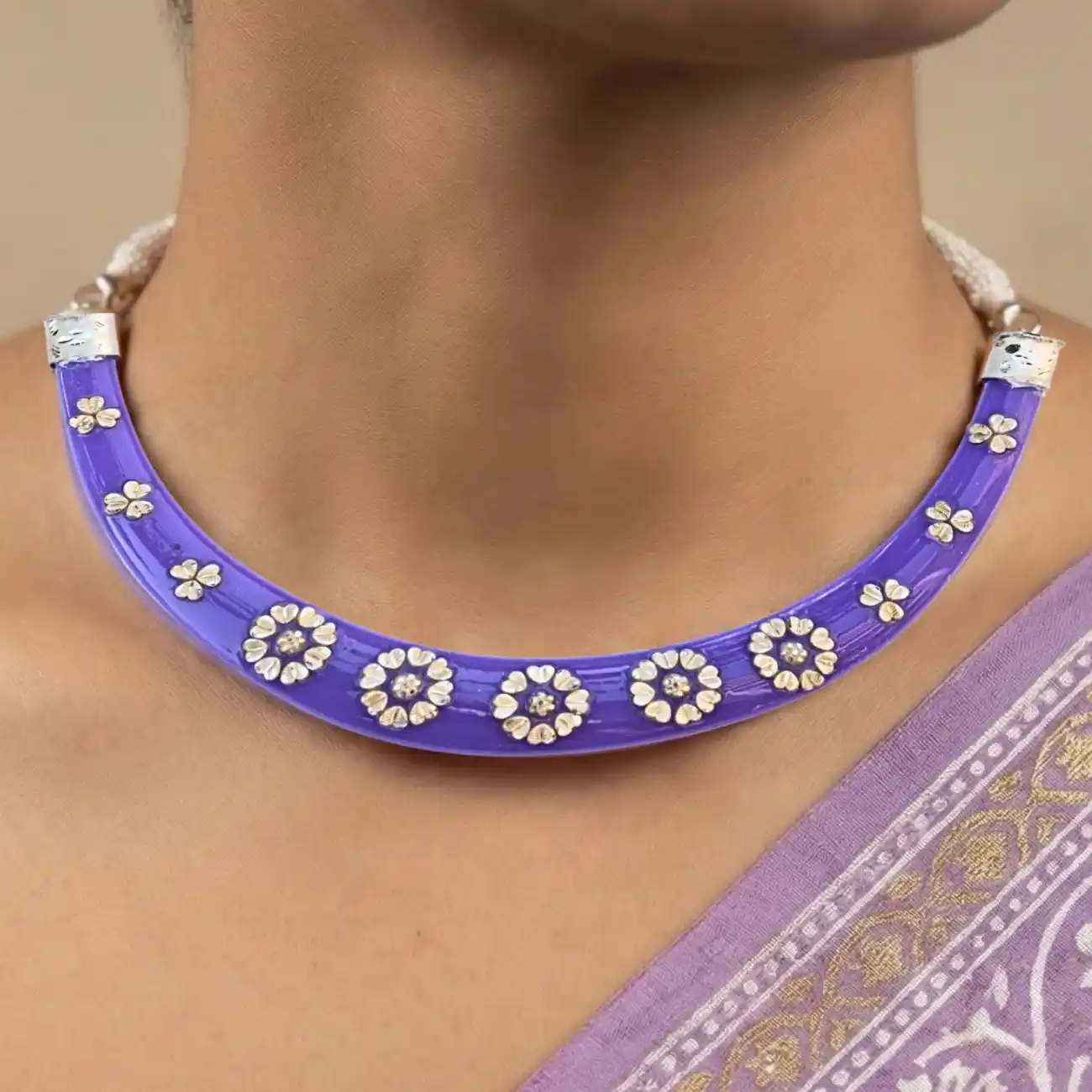Purple Pola Neckpiece & Floral Stud Earrings Set