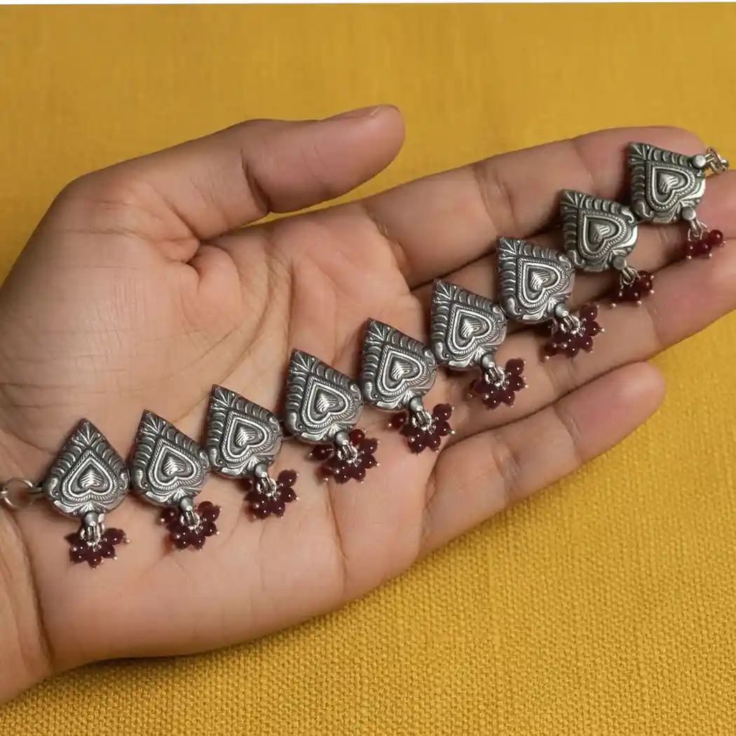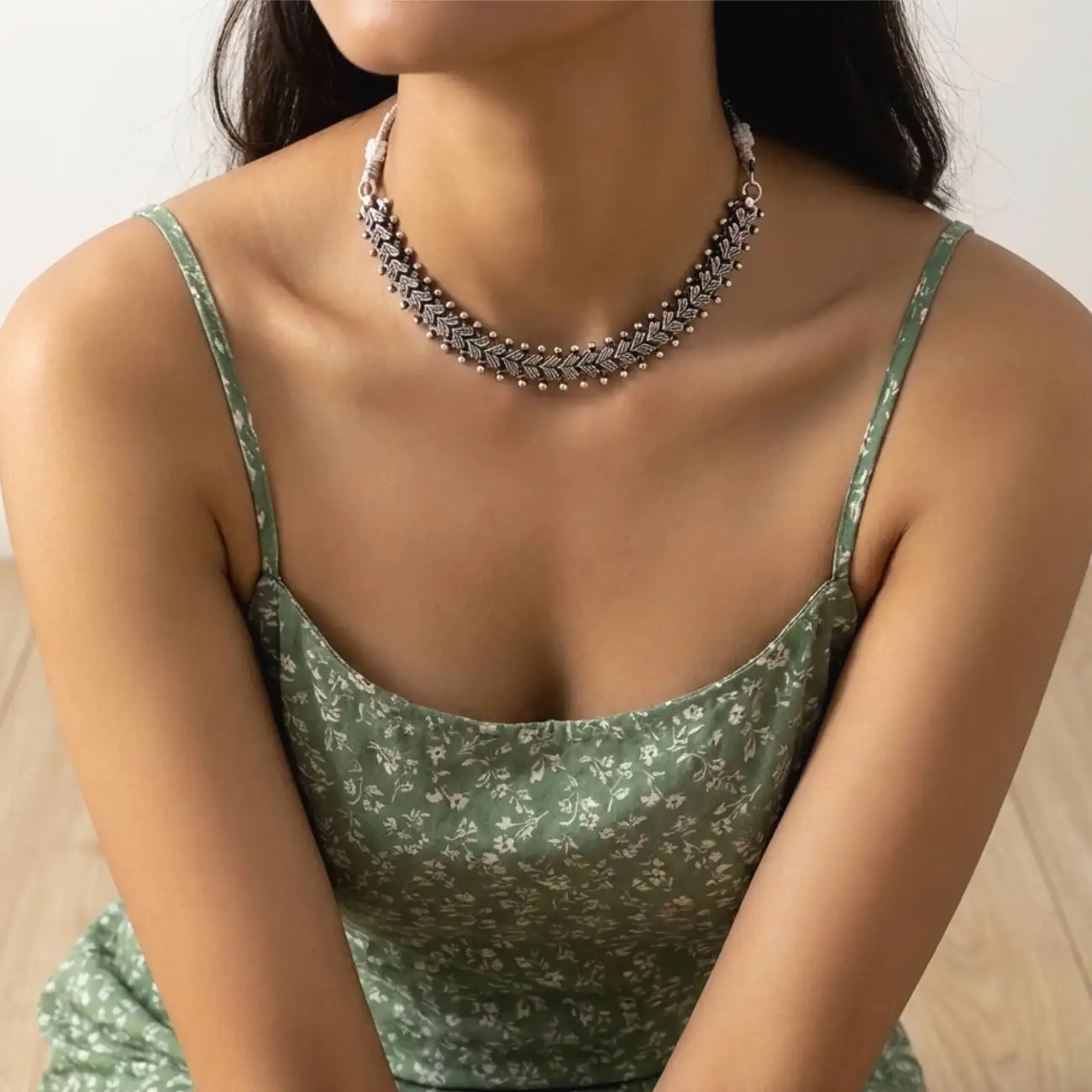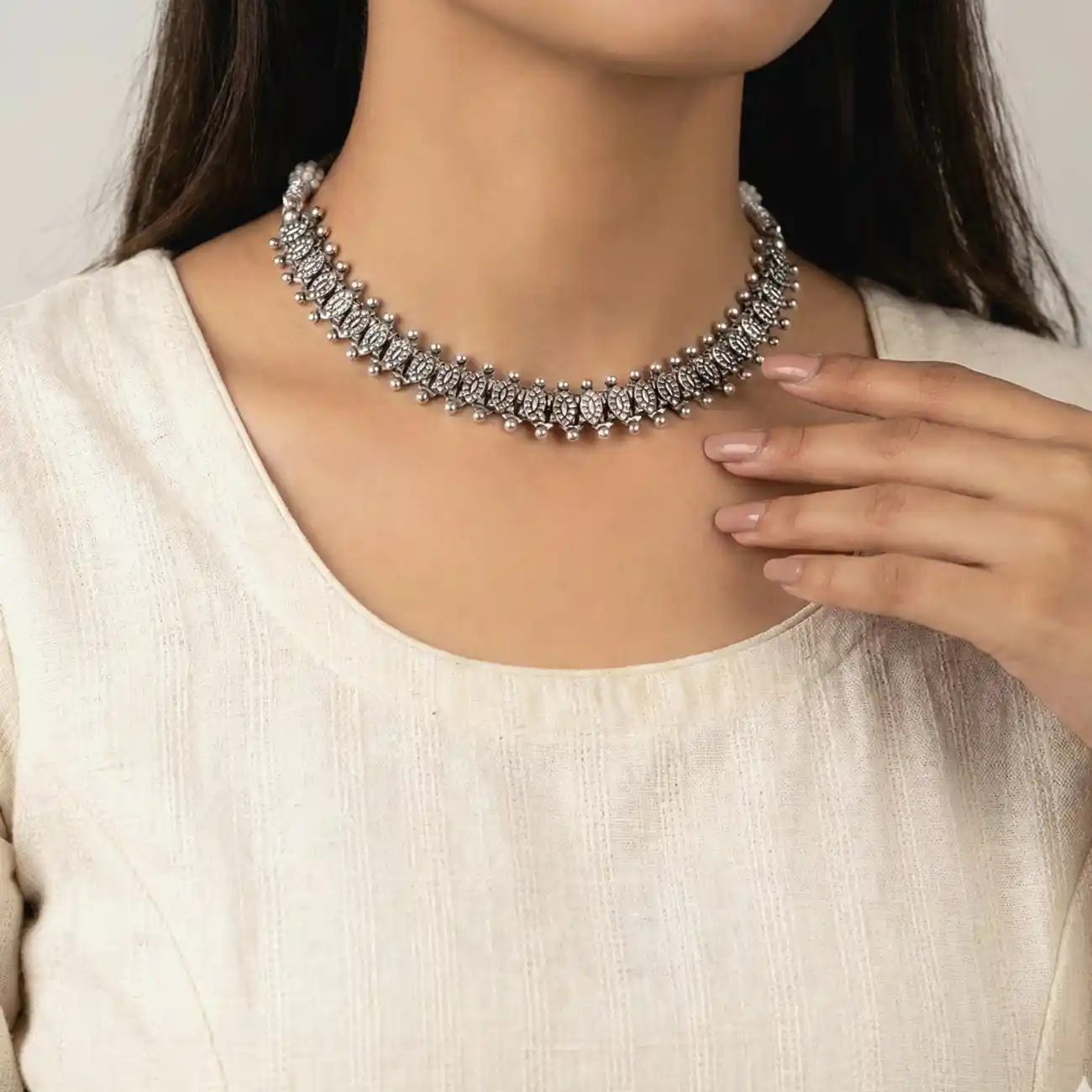 Leaf-Motif Beaded Silver Choker