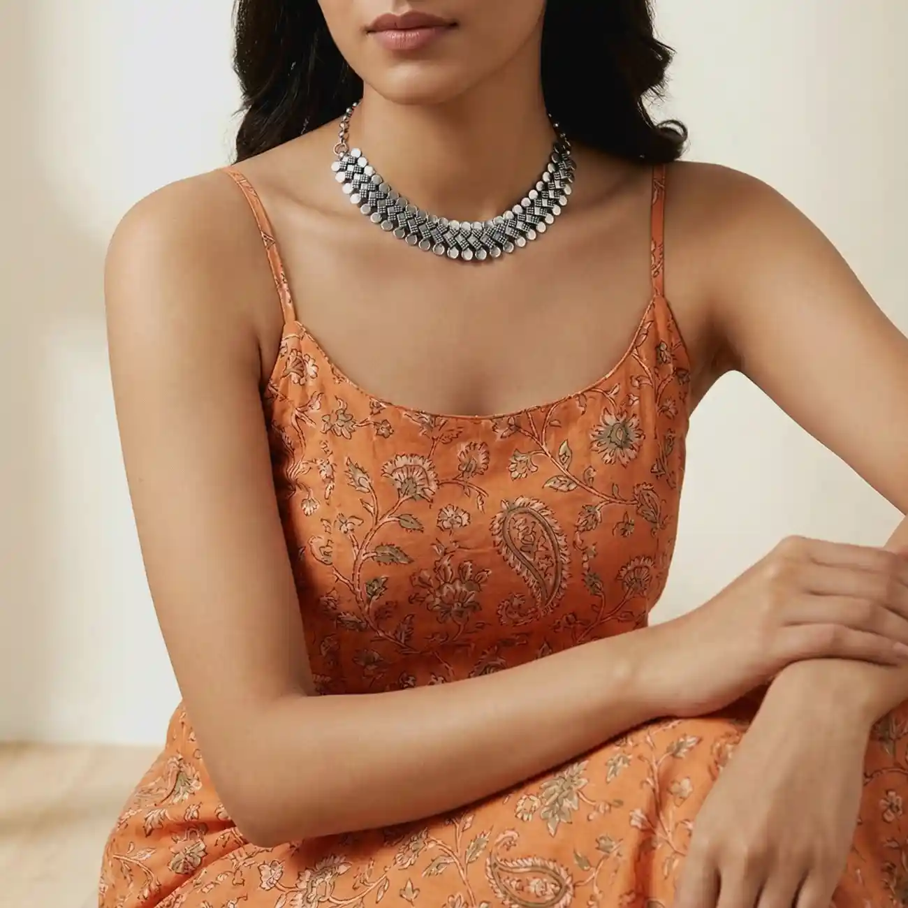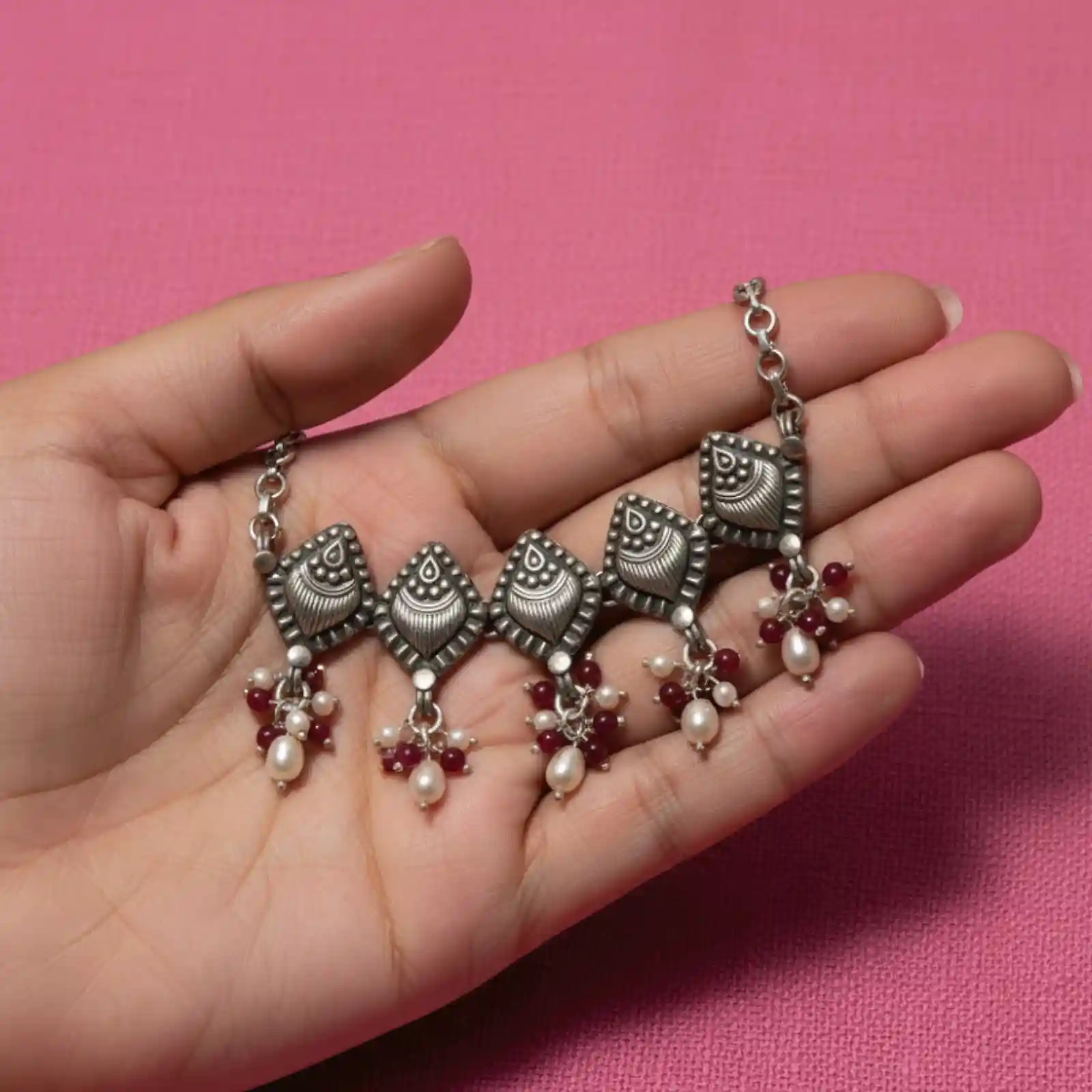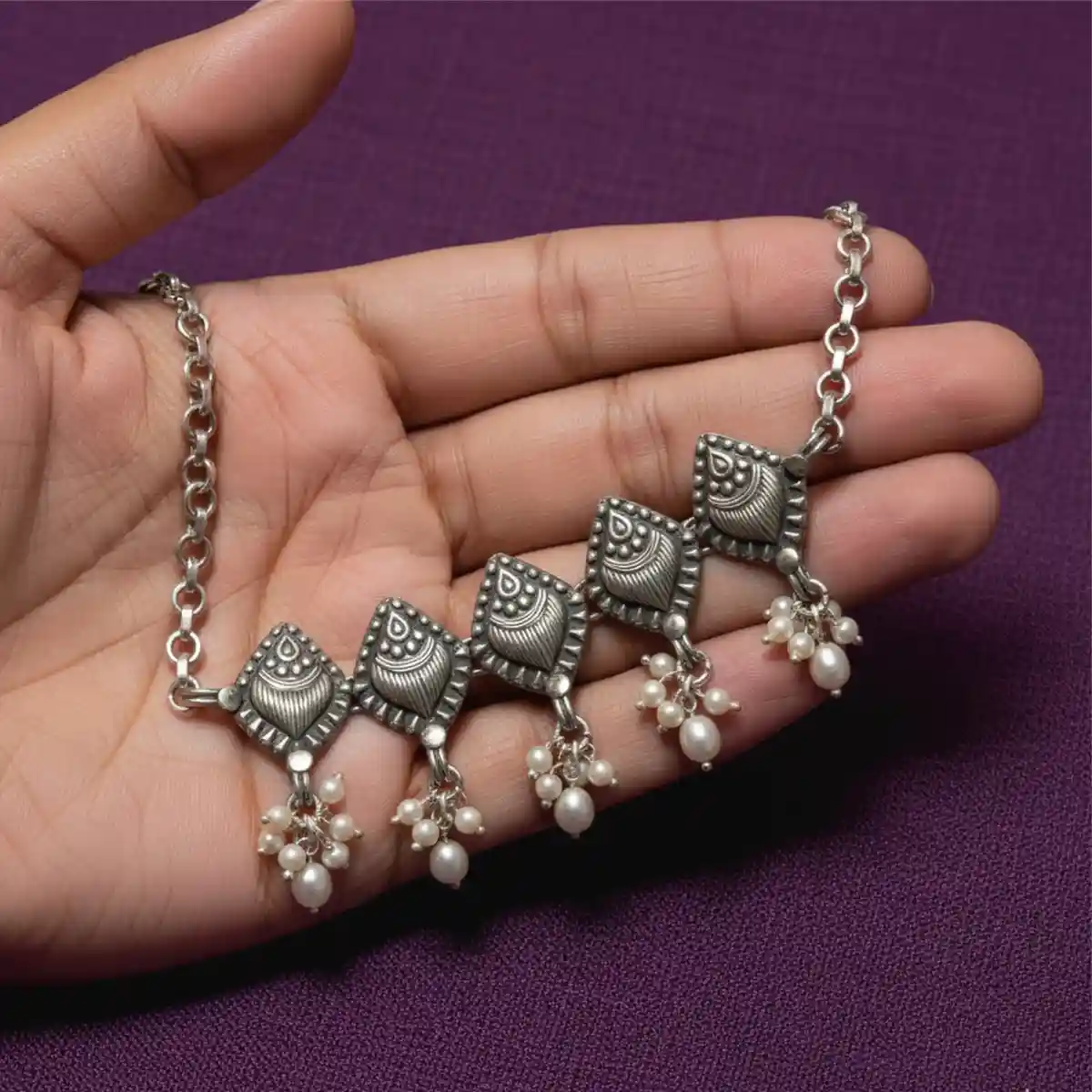 Leaf-Motif Beaded Silver Choker