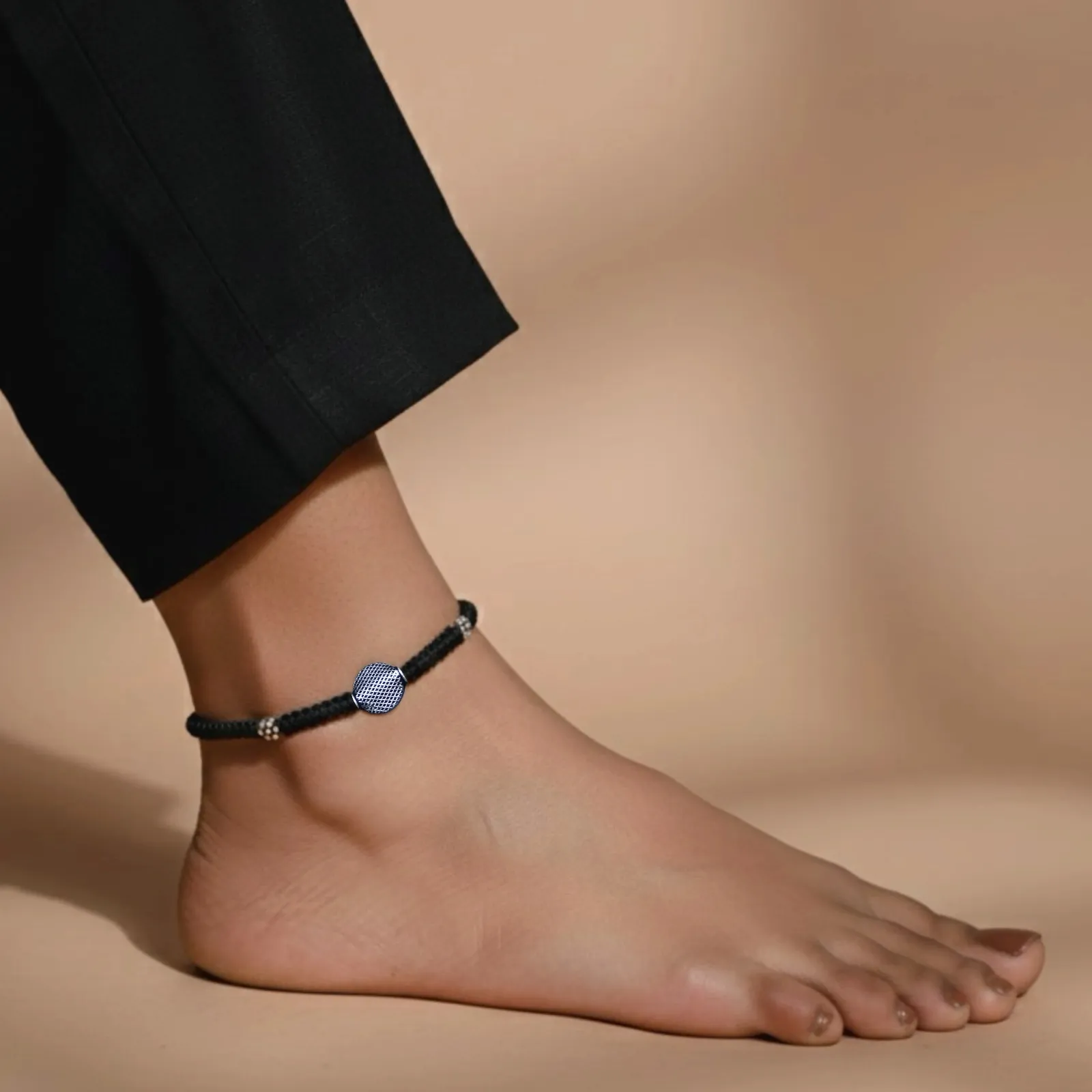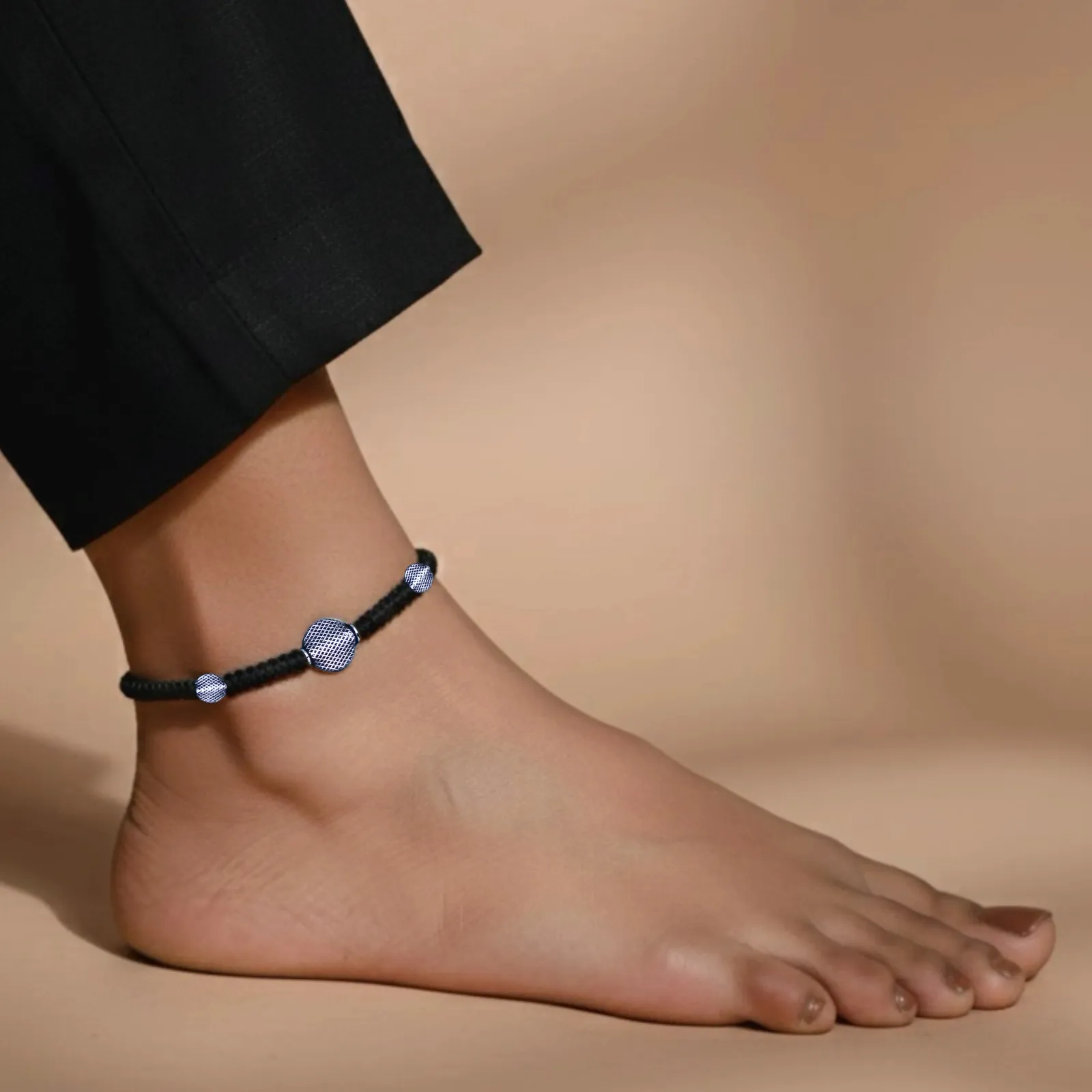 Textured Silver Beads Black Thread Anklet