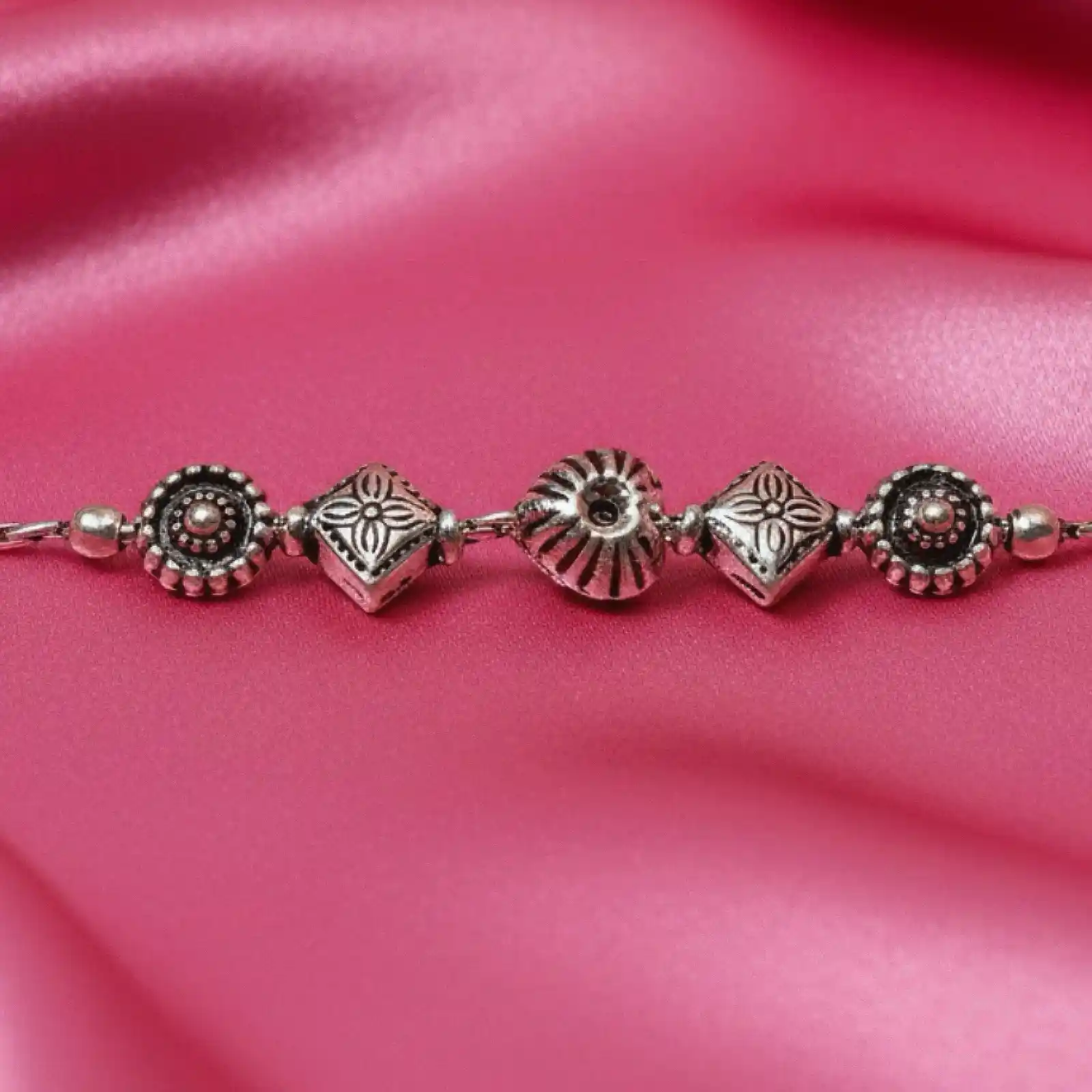 Elevate your elegance with this Antique Floral Silver Bracelet from Mahanam Jewellers. Crafted in oxidized silver, the bracelet features alternating floral and geometric motifs, each intricately detailed with traditional Indian artistry. The adjustable chain ensures a comfortable fit, making it ideal for both casual wear and festive occasions. Its timeless charm captures the essence of handcrafted heritage with a modern twist. Highlights: • Handcrafted oxidized silver bracelet • Detailed floral and geometric engraved motifs • Adjustable chain for perfect fit • Lightweight and durable design • Perfect accessory for ethnic and fusion outfits