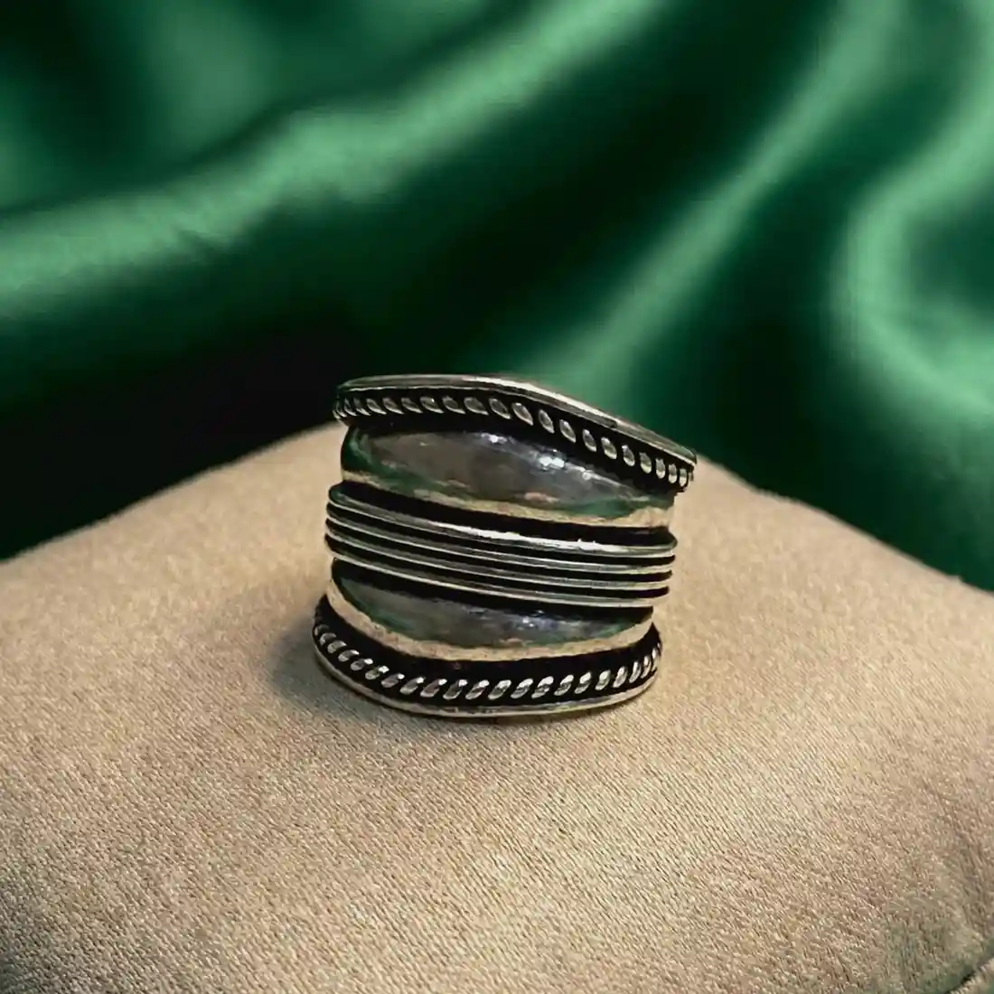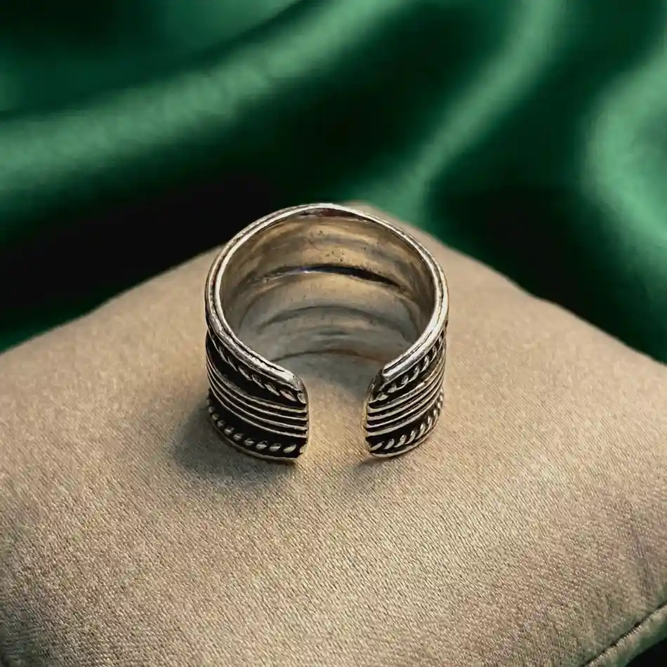 Jewellery Type: Ring Metal: 925 Sterling Silver Size: 10 (Steel Ring Size) Design: Wide band with layered linear texture Occasion: Daily wear, festive styling, statement look A bold silver band ring featuring a layered design with finely detailed ridged lines and rope-patterned borders. The slightly oxidised finish adds depth and a handcrafted vintage character, making this ring a strong yet elegant statement piece. Its balanced width and smooth inner finish ensure comfortable wear while maintaining a striking presence. Dress pairing: • Indian outfits like cotton sarees, linen kurtas, and handloom ensembles • Western looks with dresses, blazers, monochrome outfits, or denim • Works beautifully with earthy tones, deep reds, blacks, and greens • Ideal for office wear, casual styling, or minimal festive looks