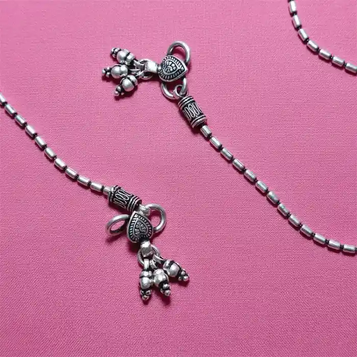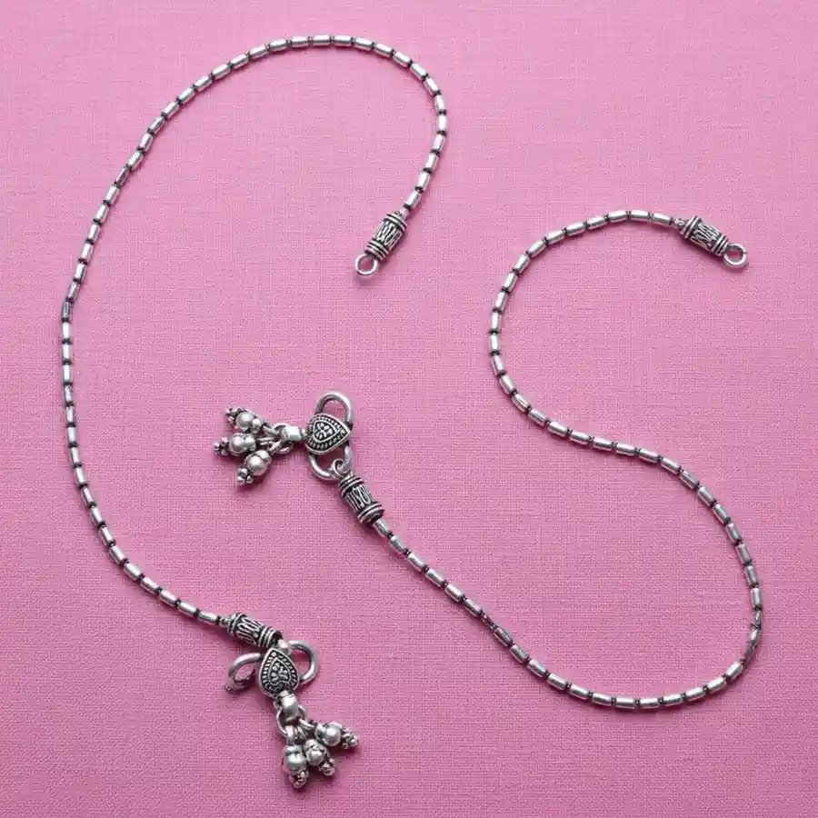 A beautifully handcrafted pair of silver-tone payel featuring fine cylindrical beads and traditional ghungroo drops. The heart-engraved charm adds a touch of old-world charm, making this design both graceful and timeless. Lightweight and delicate, these anklets are perfect for daily wear or festive elegance. Dress pairing: • Cotton sarees, boho skirts, and handloom outfits for an ethnic touch • Casual fits like wide-leg pants, denim with kolhapuris or flowy summer dresses • Bridal mehendi, haldi or pre-wedding looks where subtle silver detailing shines beautifully