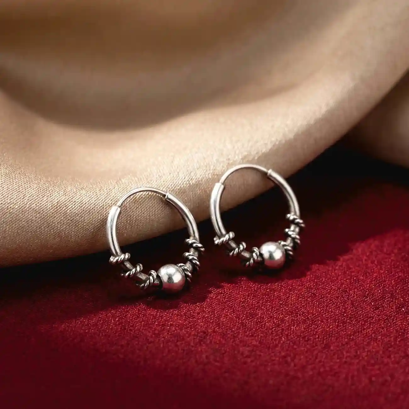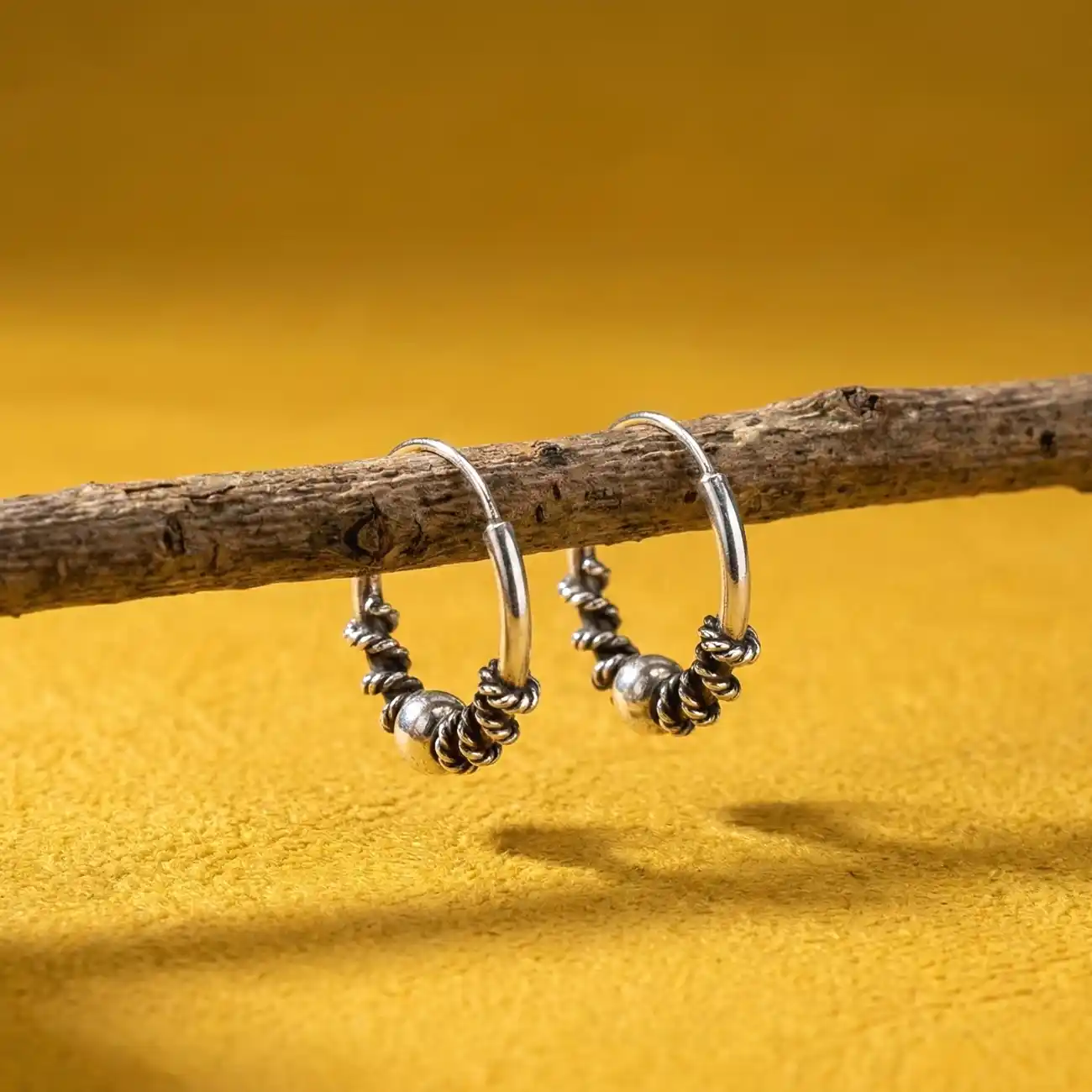 A beautifully handcrafted pair of silver bali hoops highlighted with a smooth central bead framed by delicate twisted wire accents. The rounded bead adds a soft focal point while the surrounding texture brings depth and artisanal charm. Elegant yet easy to wear, these hoops strike a perfect balance between tradition and everyday simplicity. Dress pairing: • Cotton sarees, block-printed kurtas, sleeveless ethnic blouses • Casual dresses, Indo-western tops, everyday workwear • Complements warm tones like maroon, mustard, olive, beige, and classic black for a graceful, understated finish