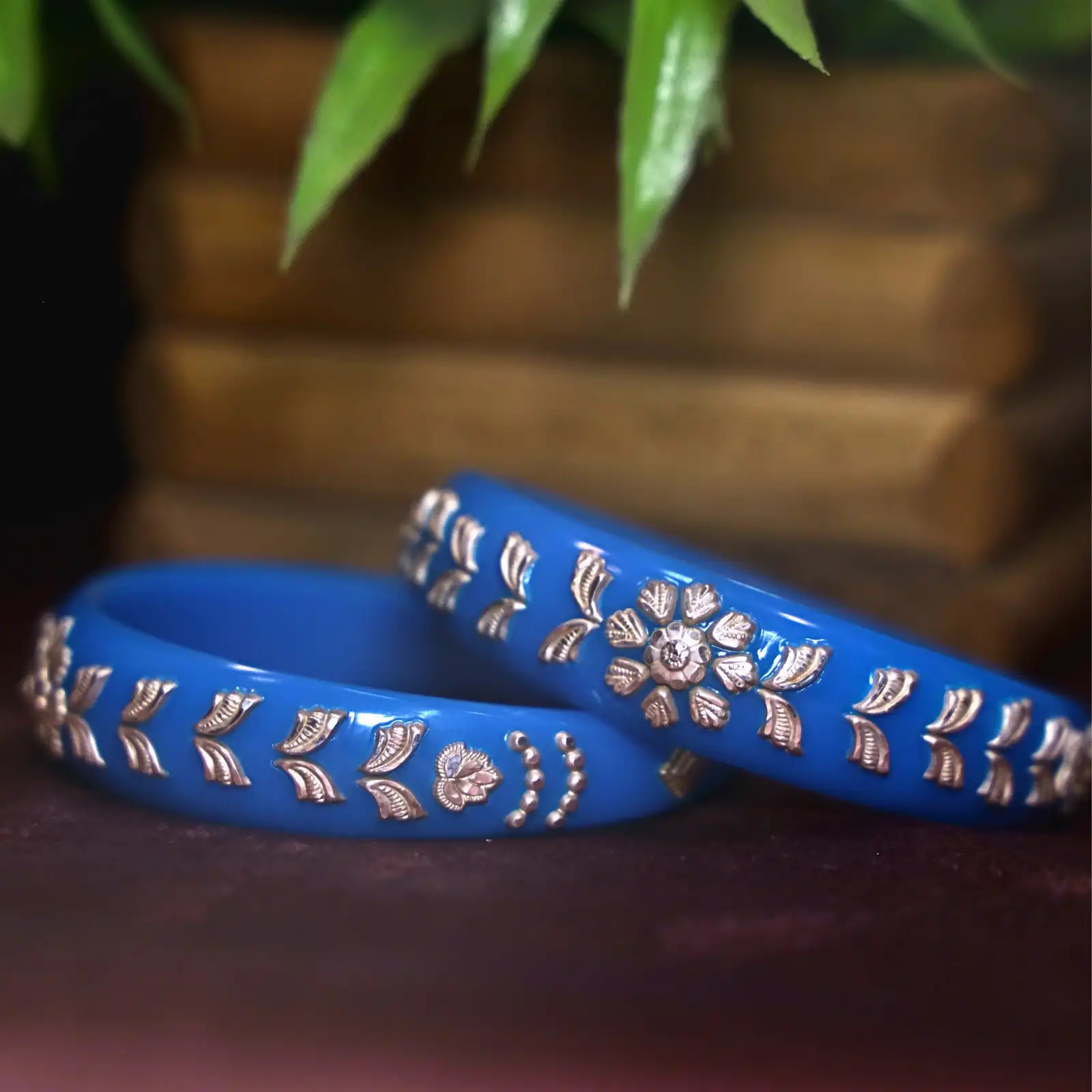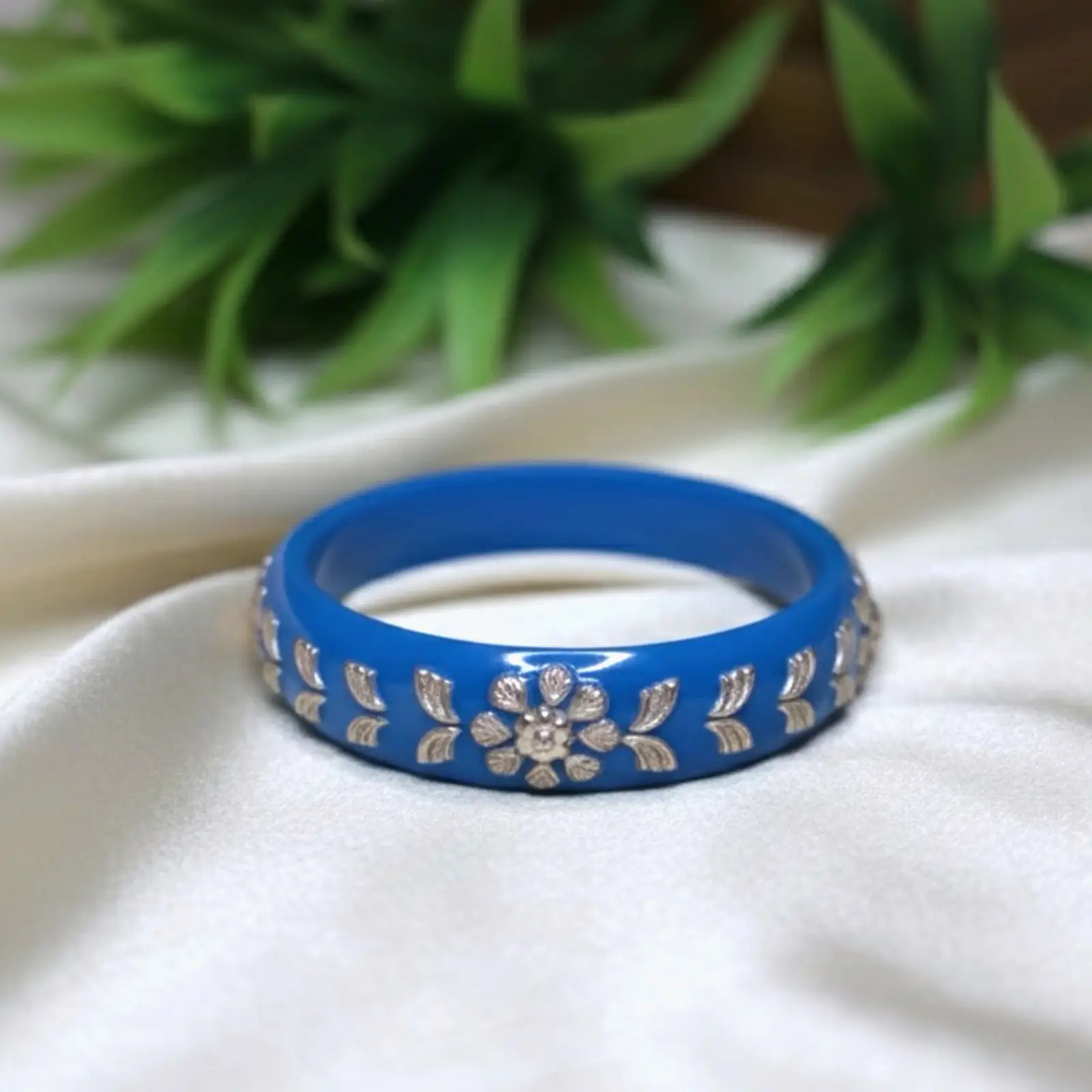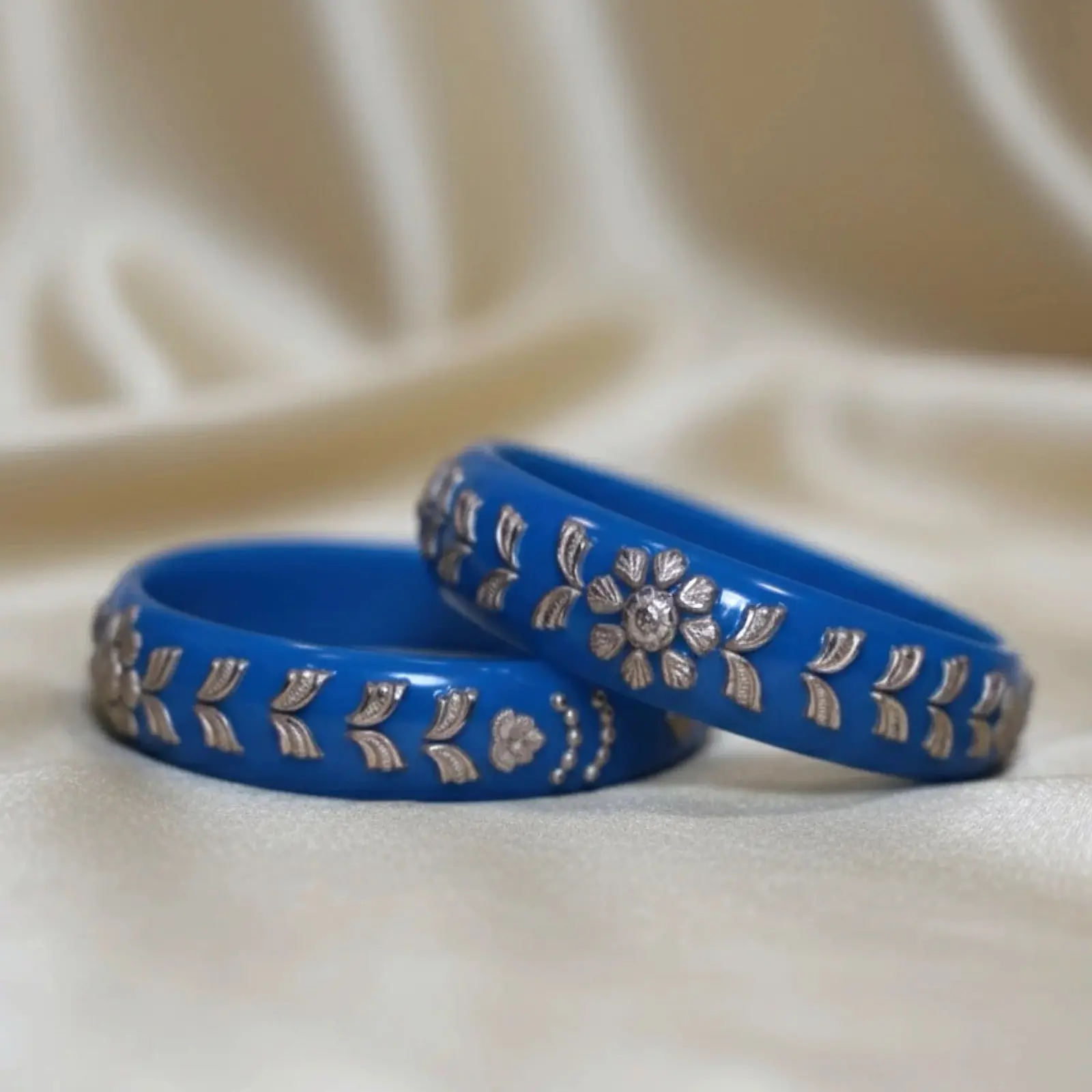 This elegant silver Pola bangle pair features a vibrant blue enamel base adorned with delicate floral and lattice detailing, giving it a refined handcrafted charm. Its bright yet graceful look makes it perfect for pairing with chiffon sarees, pastel lehengas, kurtis, or even a simple white-and-blue kurta set for a polished, festive-ready style.