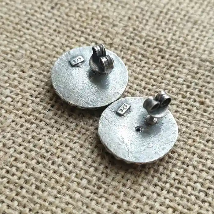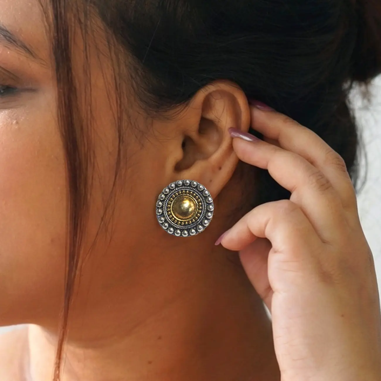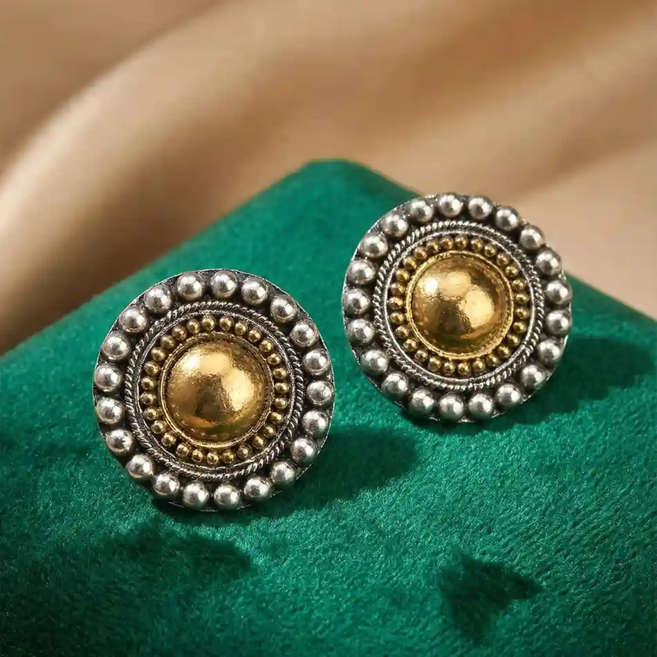 Jewellery Type: Kaan Pasha Metal: 925 Sterling Silver Design: Circular stud with gold-polished dome center and detailed silver beaded border Polish: Gold polish only Occasion: Everyday wear, office wear, festive occasions, gifting A pair of classic round studs featuring a warm gold-polished dome at the center, surrounded by intricate beaded detailing in 925 sterling silver. Inspired by traditional Indian craftsmanship, these studs strike a perfect balance between heritage charm and everyday elegance. Subtle yet striking, they add a refined accent without feeling heavy or overpowering. Dress pairing: • Handloom cotton sarees, linen sarees, silk kurtas, chikankari suits • Festive anarkalis, ethnic co-ord sets, soft banarasi or chanderi outfits • Western looks like solid dresses, linen tops, neutral shirts, or minimal Indo-western wear • Complements earthy tones, ivory, beige, bottle green, rust, and soft gold palettes