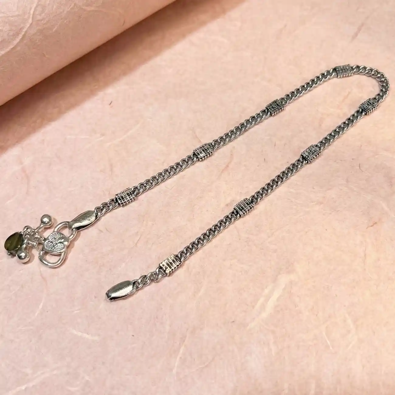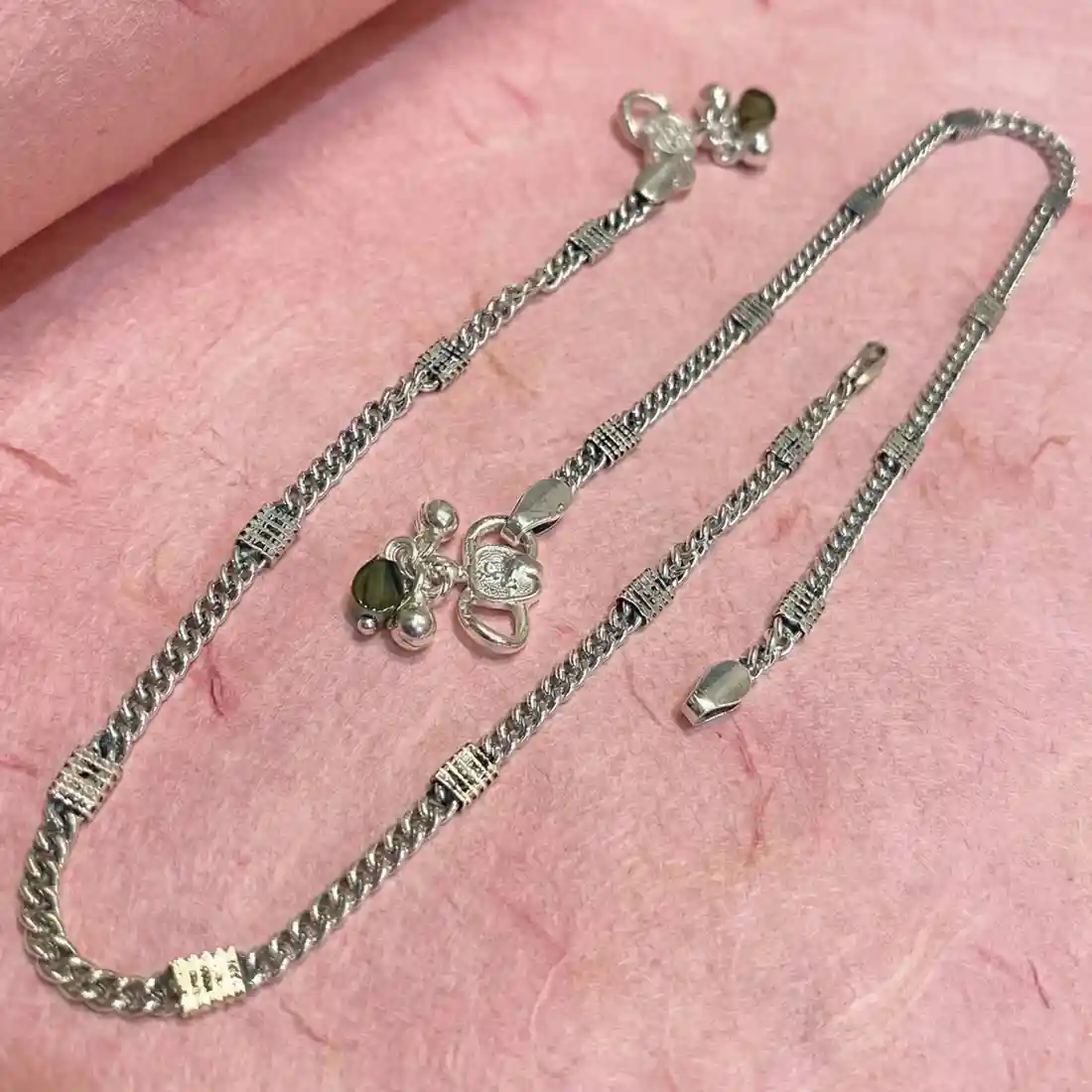 A delicately crafted silver payel featuring a classic curb-style link chain accented with finely detailed textured spacers. Subtle dangling charms at ...