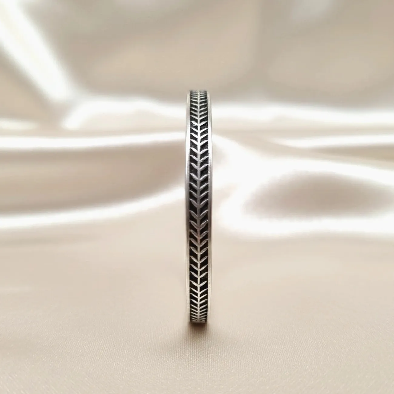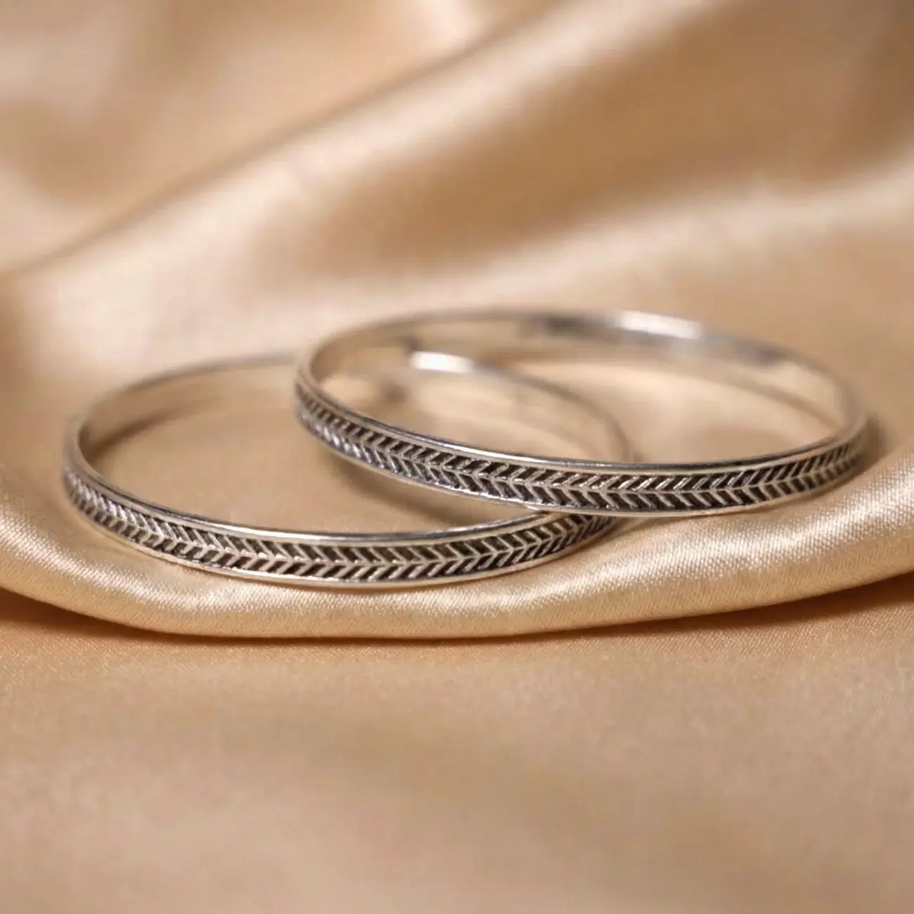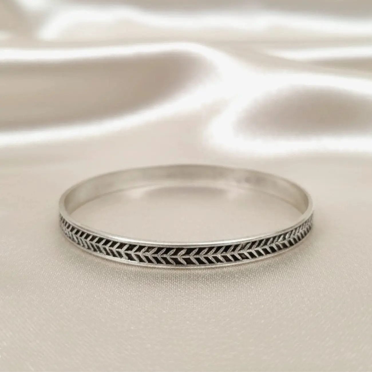 A sleek silver cuff featuring a refined chevron engraving that runs seamlessly around the band. The clean, geometric pattern adds a modern yet timeless charm, making this piece perfect for everyday styling. Lightweight, polished, and beautifully detailed, it offers just the right balance of minimalism and character. Dress pairing: • Casual ethnic wear—printed kurtis, handloom sarees, and cotton sets • Western outfits like tank tops, linen shirts, and solid dresses • Indo-western fusion looks with flowy skirts or co-ord sets • Ideal for office, daily wear, or layering with other silver bangles for a stacked look