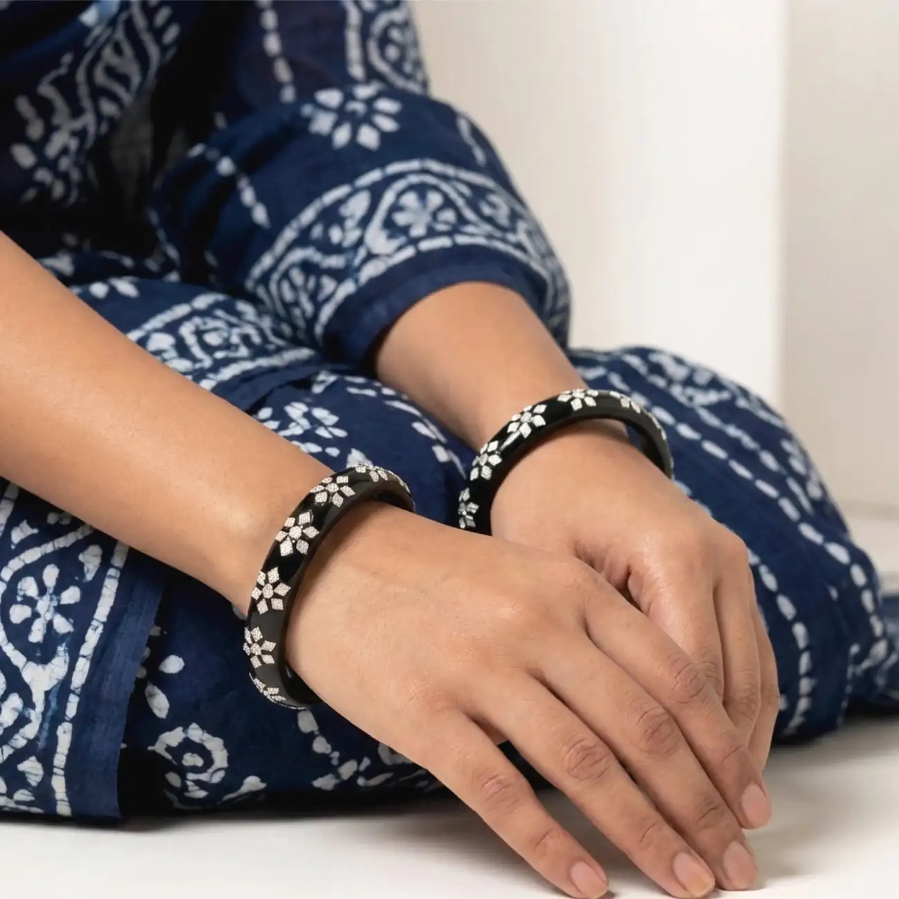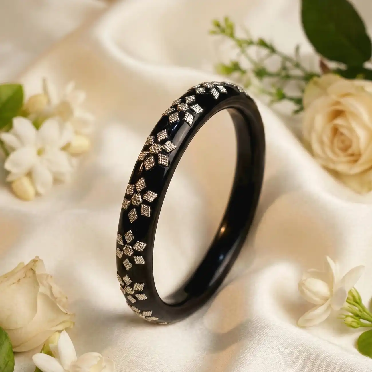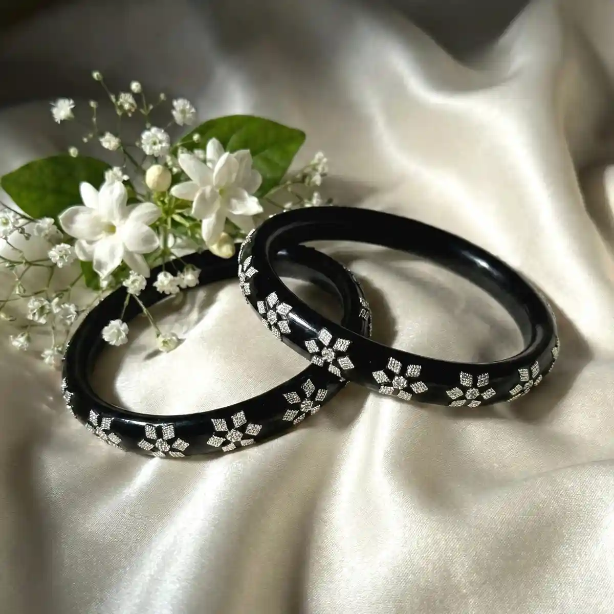 A timeless pair of glossy black Pola bangles embellished with delicate silver floral motifs. The deep black base offers a bold yet elegant contrast to the fine silver detailing, creating a look that is understated, versatile, and rooted in traditional craftsmanship. Ideal for daily wear as well as light festive occasions, this pair blends simplicity with quiet sophistication. Dress pairing: • Indigo and block-printed cotton sarees, handloom kurtas, casual ethnic wear • Black, navy or white salwar suits and kurta sets • Indo-western outfits like solid dresses, co-ord sets, or minimal tunics • Complements monochrome palettes, deep blues, and neutral tones for a polished finish