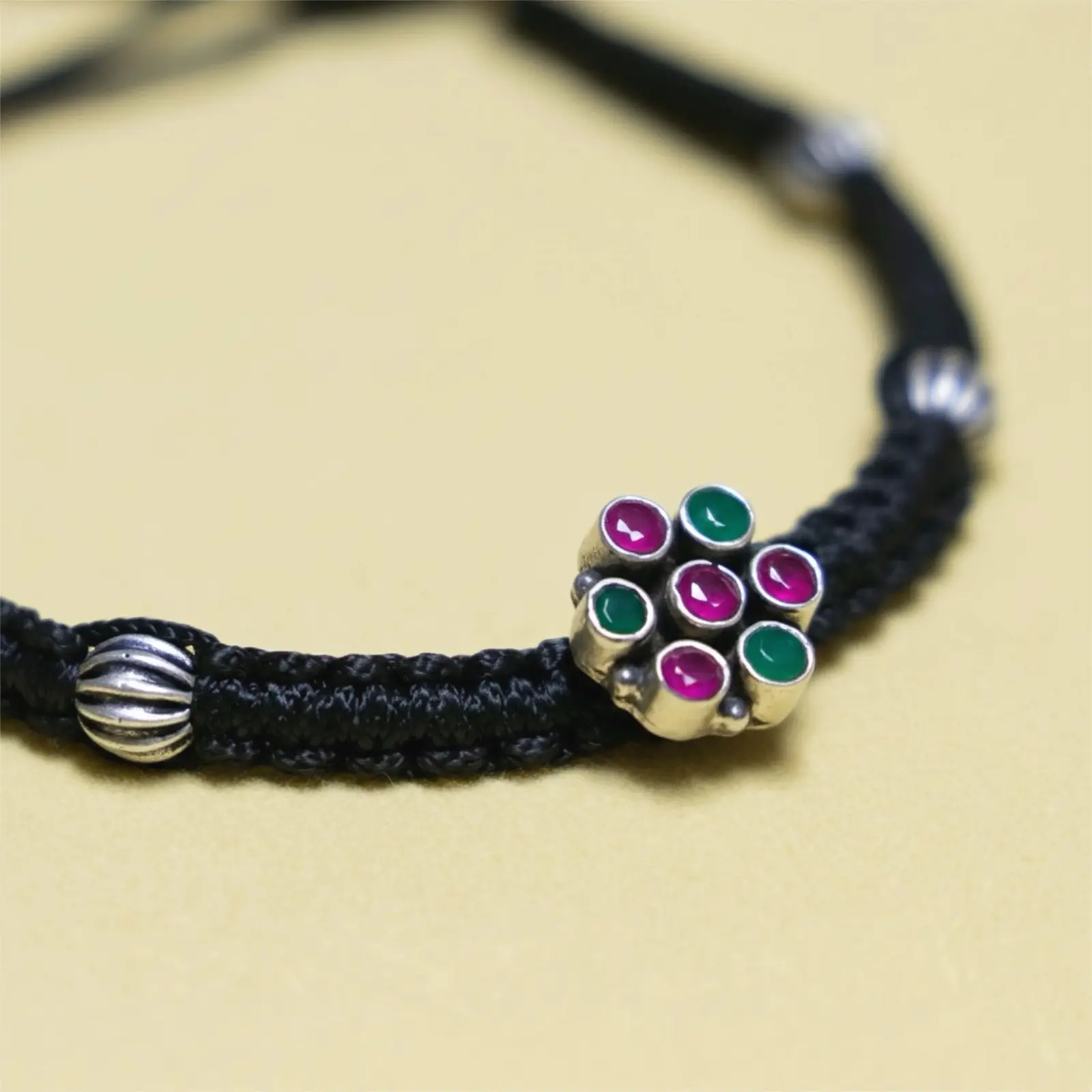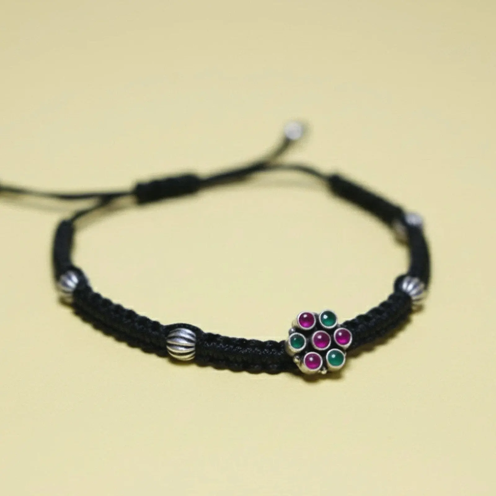 A charming single-piece anklet crafted with sturdy black thread and accented with oxidised silver-style ribbed beads. At the center sits a delicate floral cluster featuring deep pink and green stones, adding a vibrant traditional touch to the minimal design. Adjustable, lightweight and perfect for both daily wear and festive styling. Dress pairing: • Casual wear like denim, cotton pants, oversized tees and summer dresses • Ethnic outfits such as chikankari kurtas, simple salwar suits and handloom sarees • Indo-boho looks with flowy skirts, kaftans or earthy co-ord sets