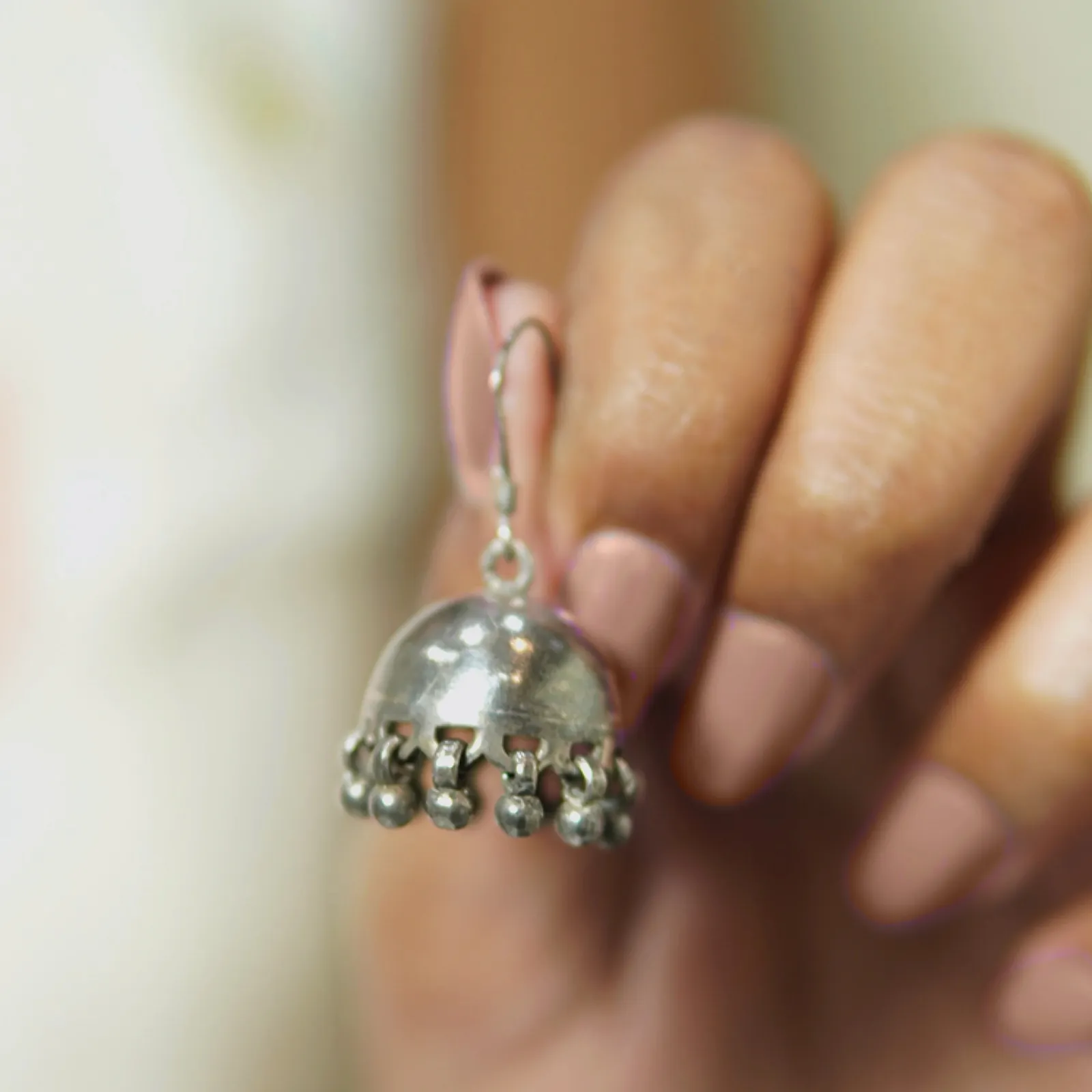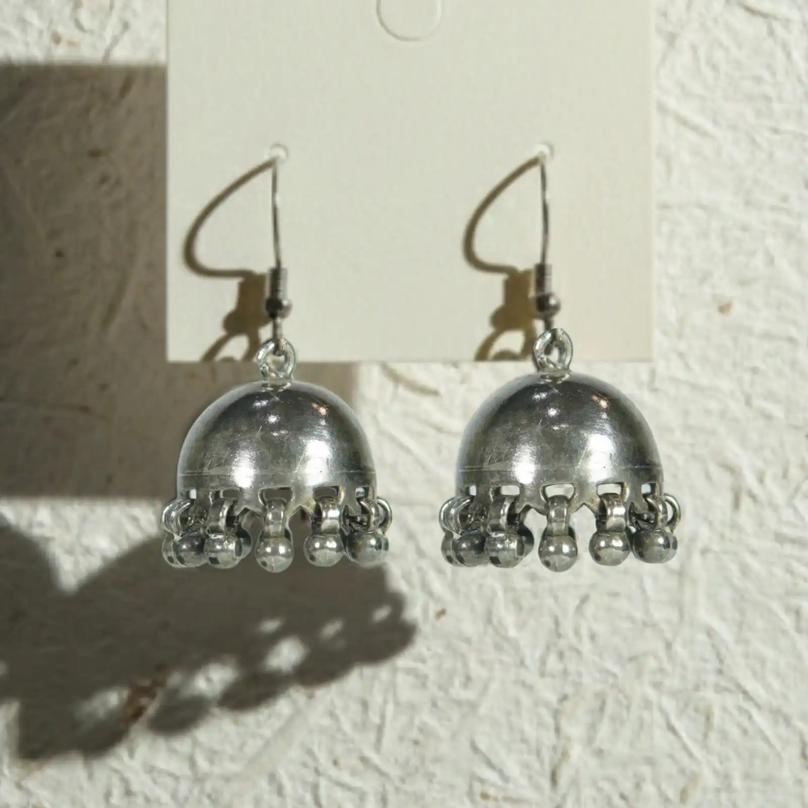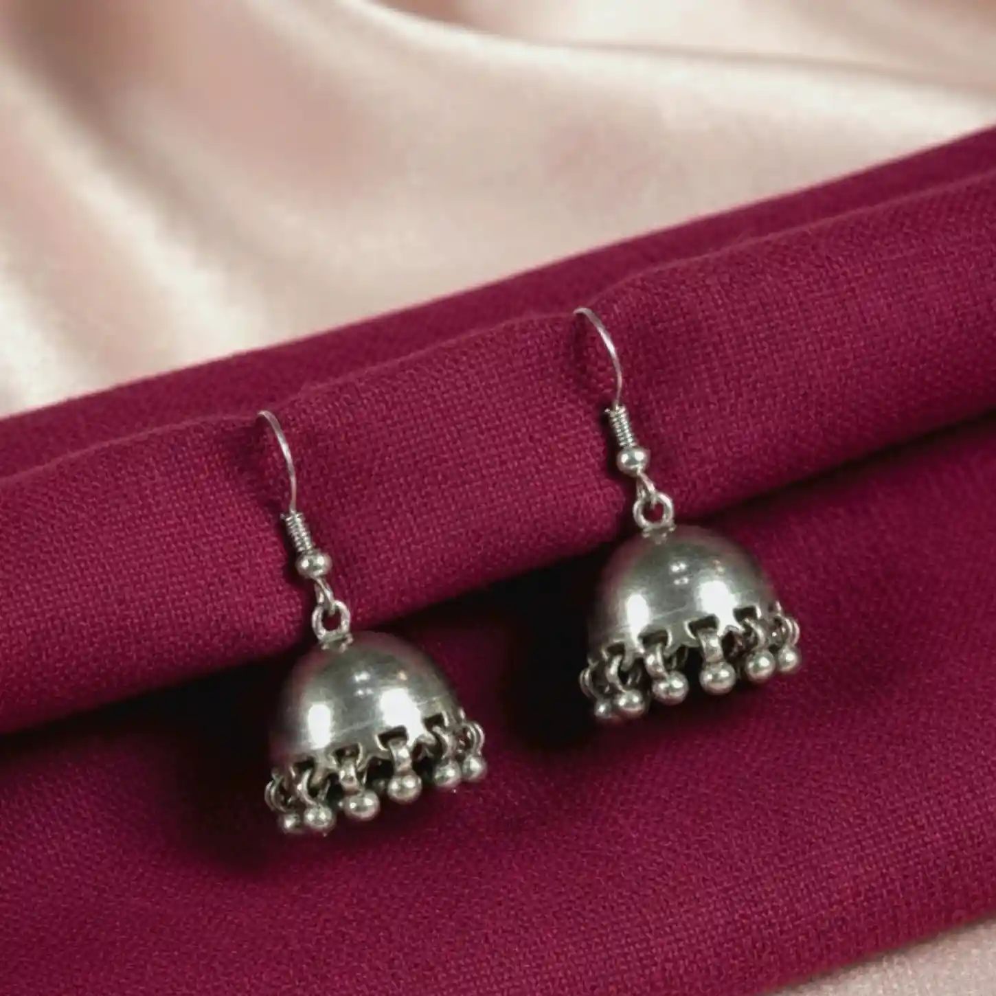 These silver dome-shaped jhumkas feature a smooth dome top with tiny dangling beads along the rim, giving them a classic and minimal ethnic look. the lightweight design makes them easy for all-day wear. Styling suggestion: this pair matches beautifully with simple cotton kurtis, chikankari suits, everyday kurtas, or even an indo-western long skirt and top. they also pair well with a solid saree for a subtle traditional touch.