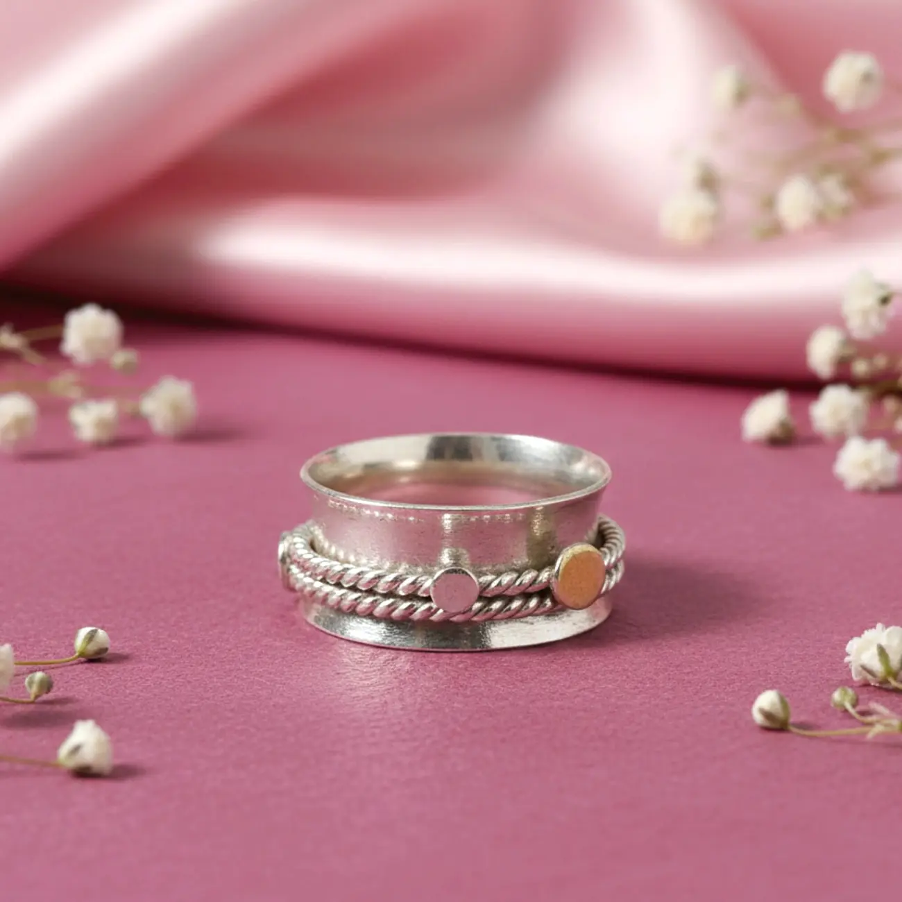 Product Name: Dual Knot Silver Band Ring Jewellery Type: Finger Ring Design Motif: Dual-band form with twisted rope detailing and accent studs Occasion: Daily wear, office wear, gifting, anniversaries A bold yet elegant silver ring featuring a wide matte-finish band accented with a twisted rope detail and subtle gold-toned dot highlights. The layered design adds depth and character, giving the ring a handcrafted, contemporary appeal. Strong in presence yet refined in finish, this piece is perfect for those who love statement jewellery with understated charm. Dress pairing: • Indian wear like linen kurtas, handloom sarees, earthy-toned suits, or Indo-fusion outfits • Western styles such as structured dresses, oversized shirts, neutral co-ords, or smart casual looks • Complements minimal styling and solid colours, making it ideal for everyday wear or effortless statement dressing