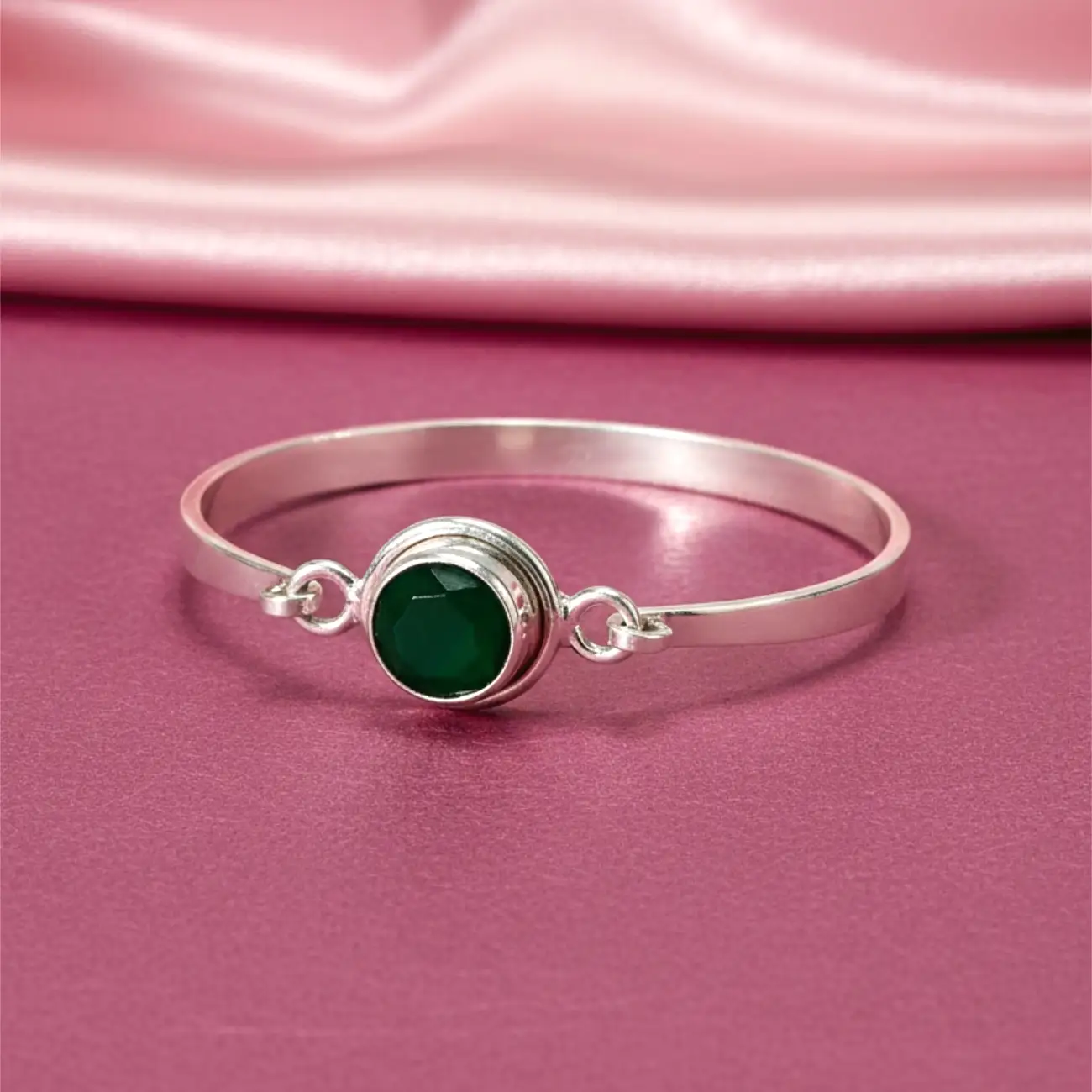 Jewellery Type: Open Kada Bracelet Stone: Faceted Emerald Green Stone Finish: High Polish Silver Finish Closure Type: Open Slip-On Style Occasion:...