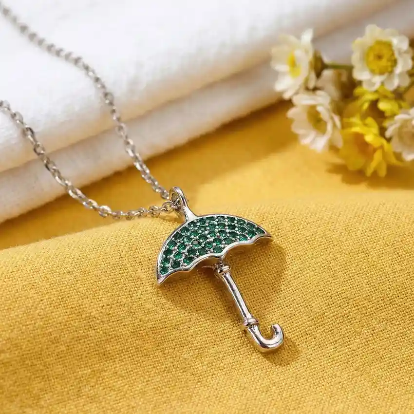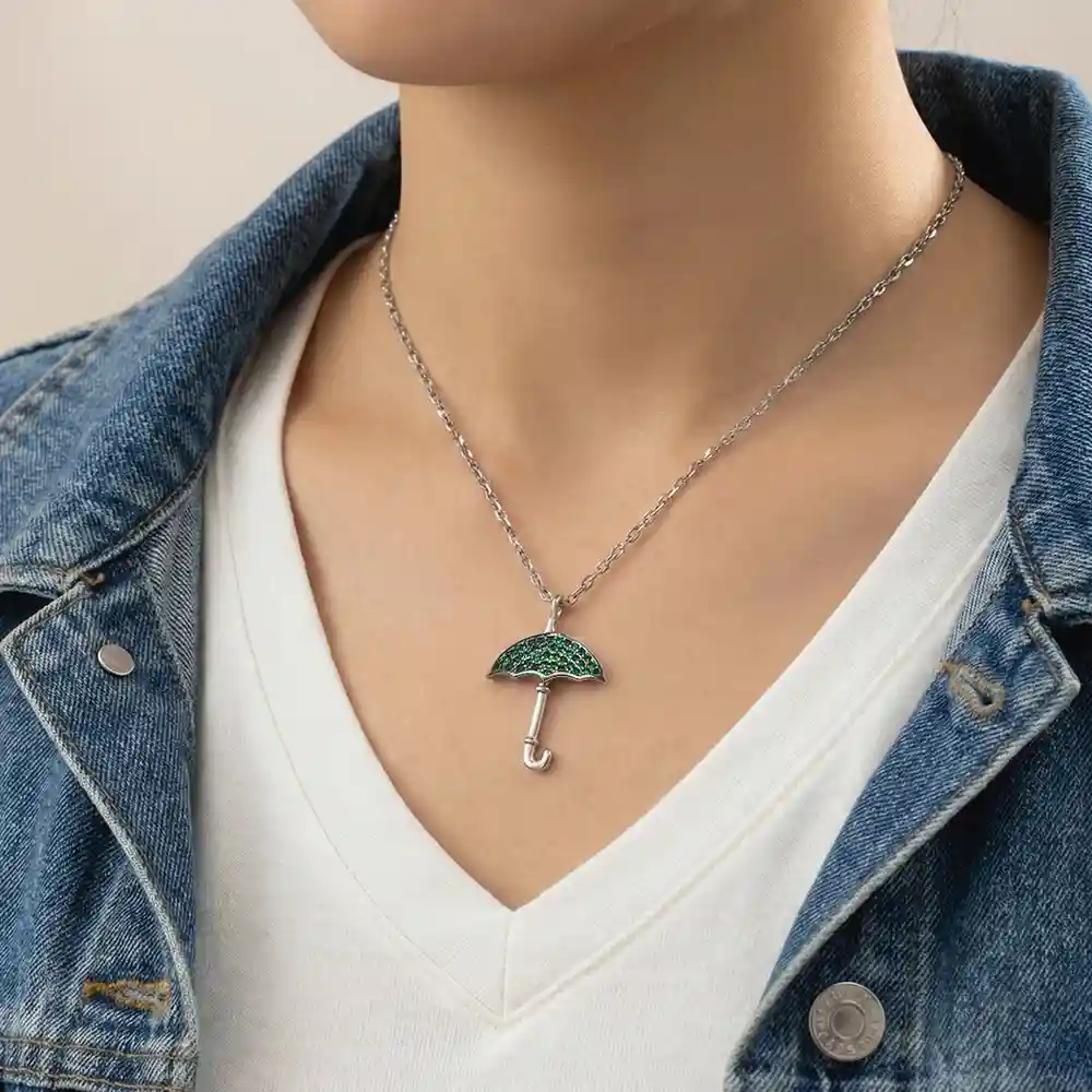Jewellery Type: Pendant with Chain Metal: 925 Sterling Silver Stone: Green crystal / emerald-tone stone detailing Chain Type: Sterling silver chain (included) Occasion: Daily wear, casual outings, gifting, festive styling Style: Minimal, symbolic, contemporary A charming umbrella-shaped pendant adorned with finely set green stone accents on the canopy, paired with a sleek silver-tone chain. The playful yet elegant design symbolises protection, hope, and positivity, making it a unique statement piece for everyday wear. Its polished finish and delicate detailing give it a fresh, youthful appeal that effortlessly complements modern styling. Dress pairing: • Casual looks like solid tops, summer dresses, camisoles, and denim jackets • Indian wear such as simple kurtis, cotton suits, and light festive outfits • Western outfits in white, green, beige, or pastel shades • Perfect for monsoon-inspired styling, daily wear, or thoughtful gifting
