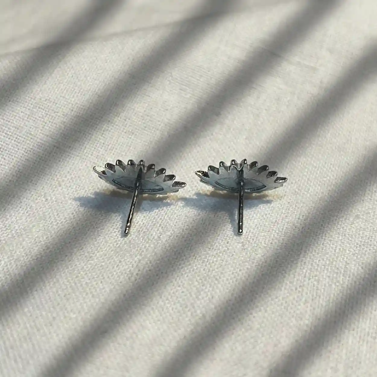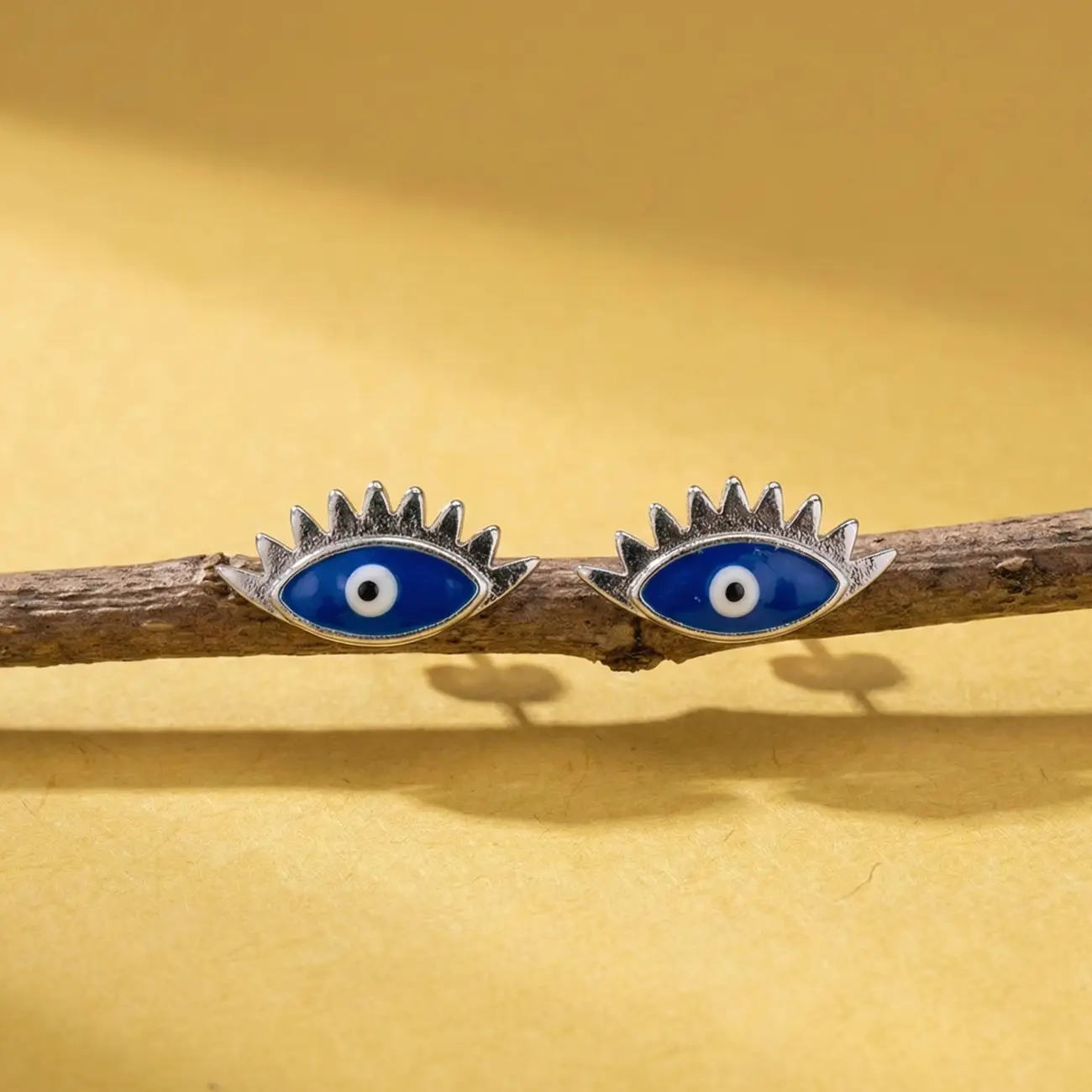 A pair of sleek silver studs shaped in a modern evil-eye motif, featuring a deep cobalt-blue center with a bold eye detail, topped with a crown-like crest. The clean enamel finish and sharp silhouette give these studs a contemporary edge while retaining their symbolic charm. Minimal yet expressive, they are perfect for everyday wear with a touch of individuality. Dress pairing: • Solid kurtas, indigo or cobalt ethnic wear, minimal prints • Casual shirts, denim layers, contemporary Indo-western outfits • Complements blue, white, black, and neutral tones for a confident, modern finish