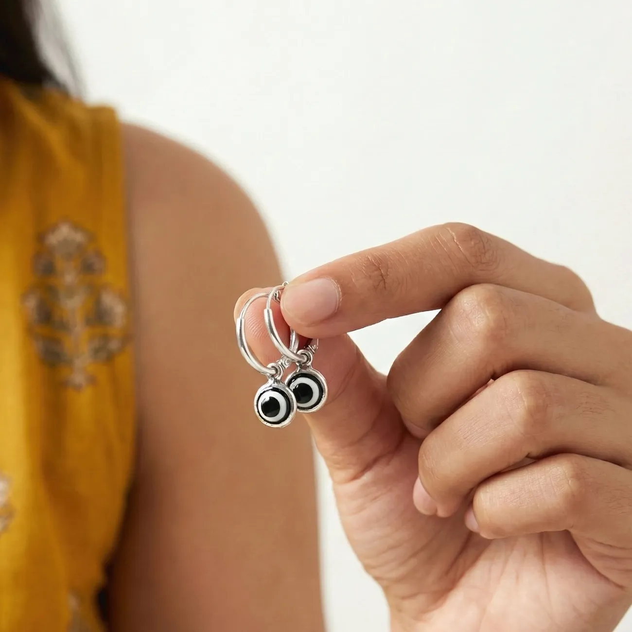 A refined pair of silver hoop earrings featuring a subtle evil-eye charm suspended below. The classic black-and-white eye motif adds a touch of symbolism while the sleek hoop design keeps the look light and contemporary. Minimal yet meaningful, these earrings are perfect for everyday wear and effortless styling. Dress pairing: • Solid kurtas, monochrome ethnic wear, minimal prints • Black or white tops, casual shirts, everyday dresses • Complements neutrals, denim, and soft earthy tones for a clean, modern finish