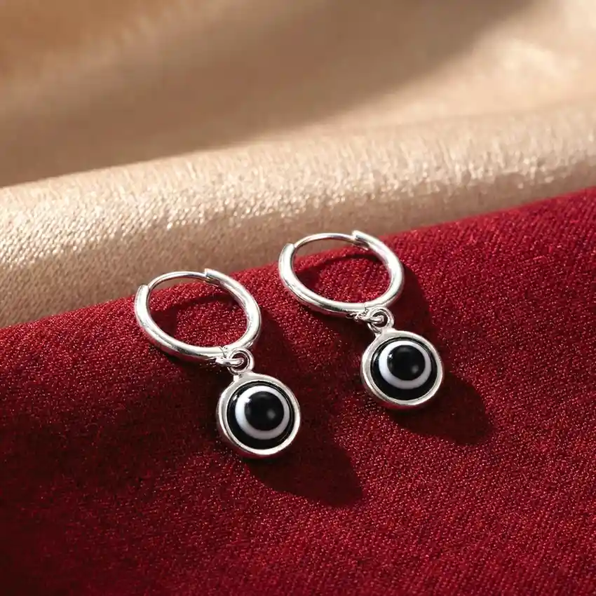 A refined pair of silver hoop earrings featuring a subtle evil-eye charm suspended below. The classic black-and-white eye motif adds a touch of symbol...
