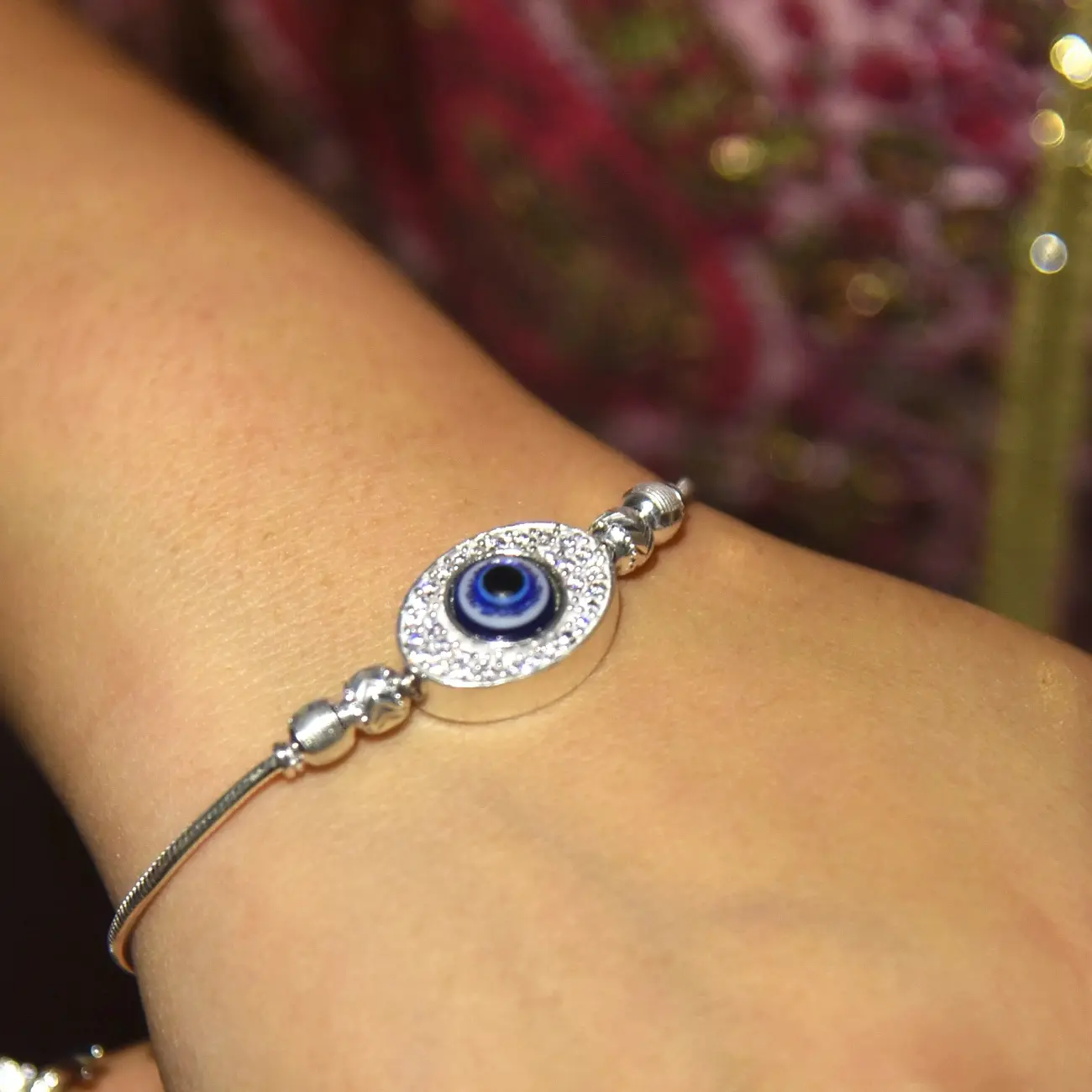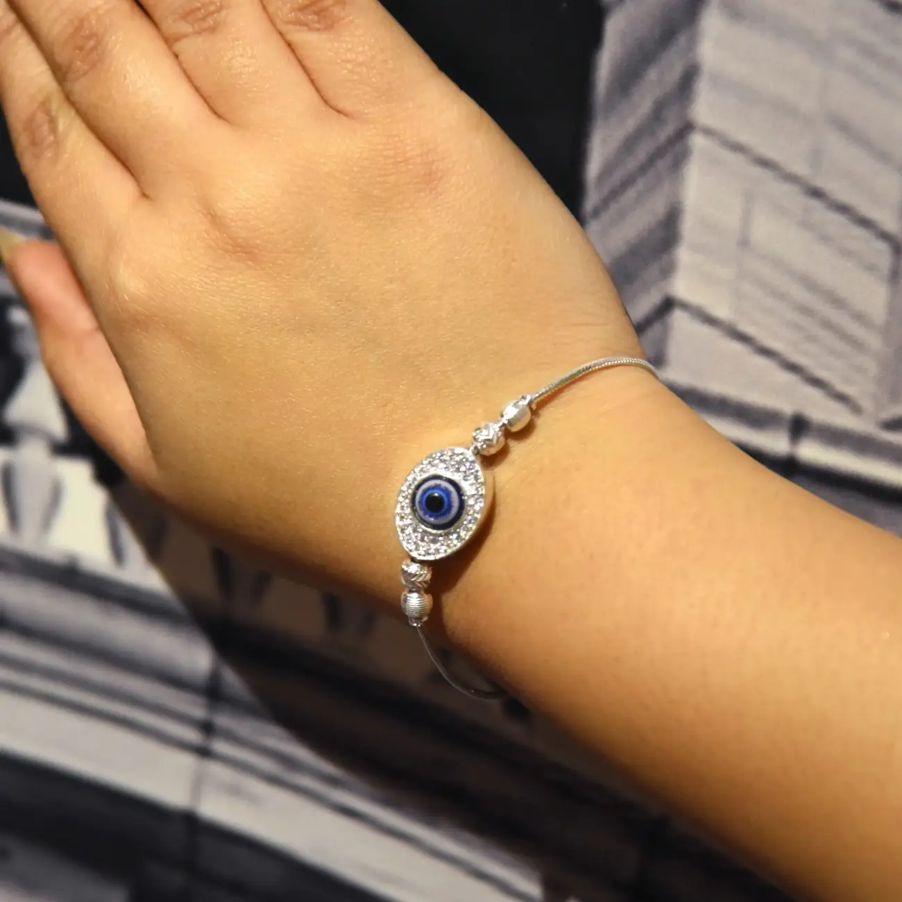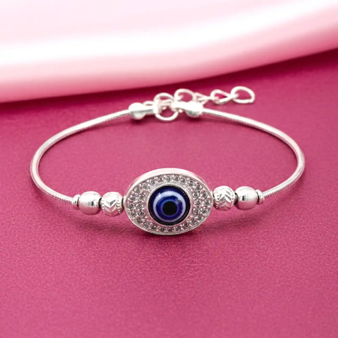 A sleek silver bracelet featuring a central oval evil eye motif, delicately encircled with fine crystal detailing for a subtle shimmer. The smooth snake-style chain and minimal bead accents create a refined silhouette, making this bracelet a perfect balance of modern elegance and timeless symbolism. Designed for everyday wear with a hint of protective charm.