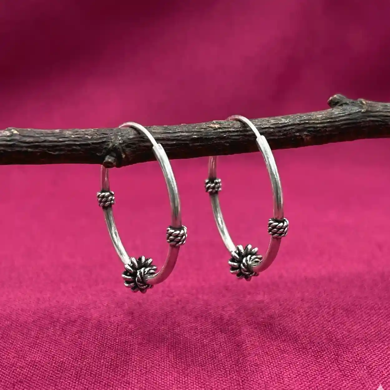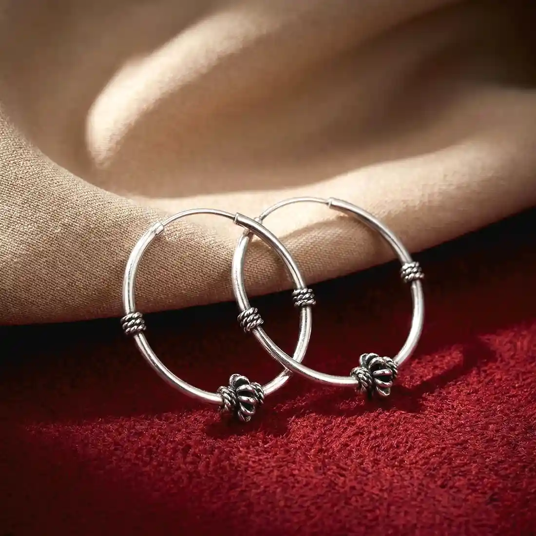 A graceful pair of handcrafted silver bali earrings featuring a slim hoop design accented with delicate coil detailing and a subtle floral motif at the base. The open, airy silhouette keeps the look light and elegant, while the floral accent adds a soft traditional touch. Perfect for everyday wear, these balis transition effortlessly from casual to ethnic styling. Dress pairing: • Cotton kurtas, printed blouses, everyday ethnic wear • Handloom sarees, sleeveless kurtas, fusion outfits • Complements reds, ivories, earthy tones, and classic neutrals for a timeless finish