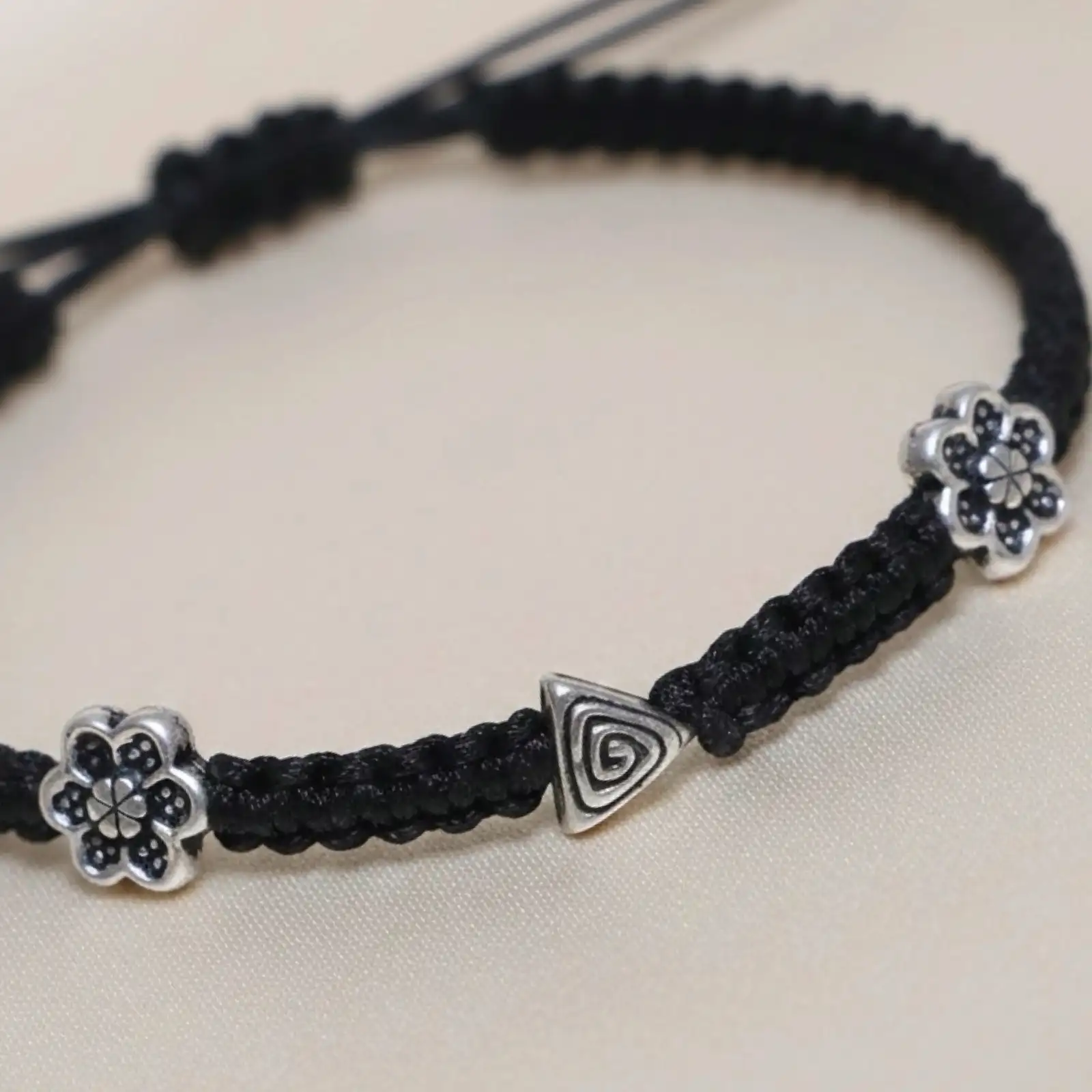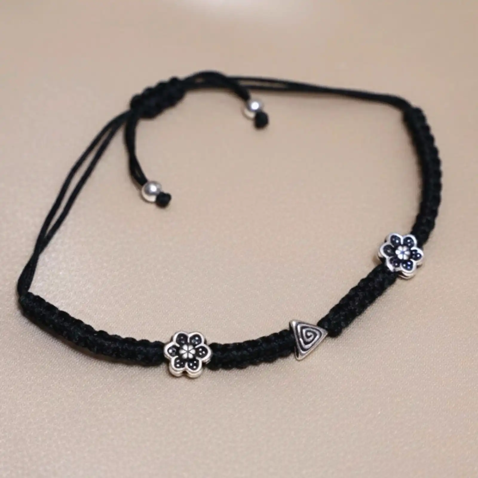 A delicate black macrame single piece anklet adorned with two silver-toned floral charms and a tiny spiral triangle bead at the center. The handcrafte...