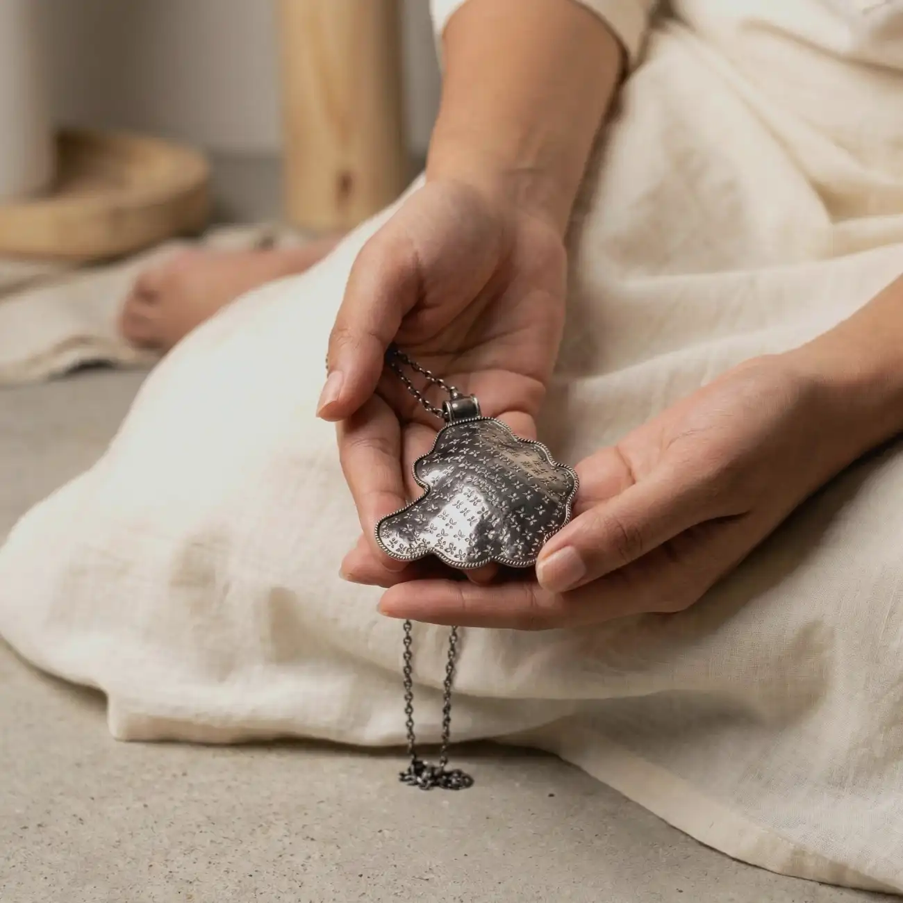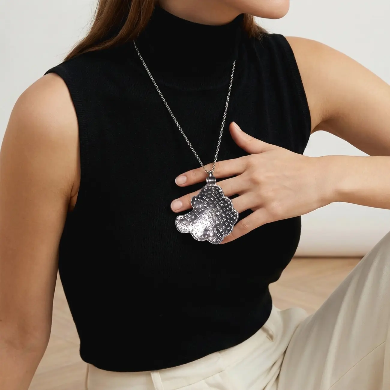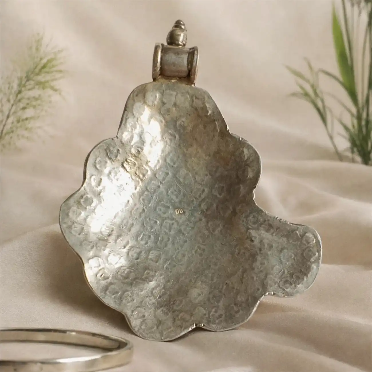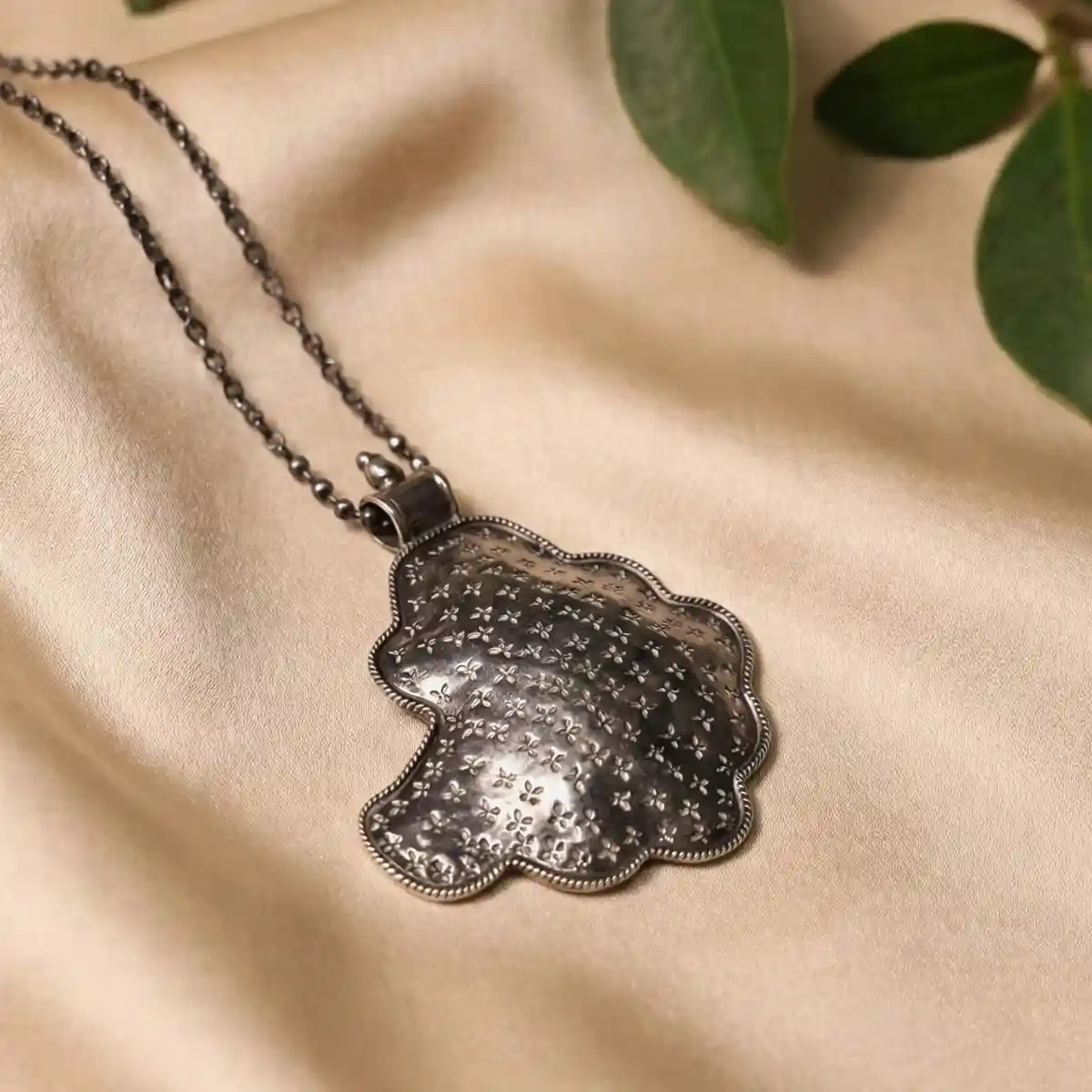A beautifully sculpted silver pendant featuring an organic shield-like silhouette, delicately etched with tiny floral motifs across its softly textured surface. The scalloped edges and fine dotted border add depth and dimension, giving the piece a handcrafted, heirloom-inspired character. Elegant yet distinctive, this pendant blends traditional detailing with a contemporary form, making it a versatile statement for everyday wear. Dress pairing: • Handloom sarees in black, charcoal, ivory, or deep jewel tones • High-neck blouses, sleeveless kurtas, and minimal ethnic silhouettes • Indo-western outfits and monochrome ensembles where the pendant stands out as the focal piece