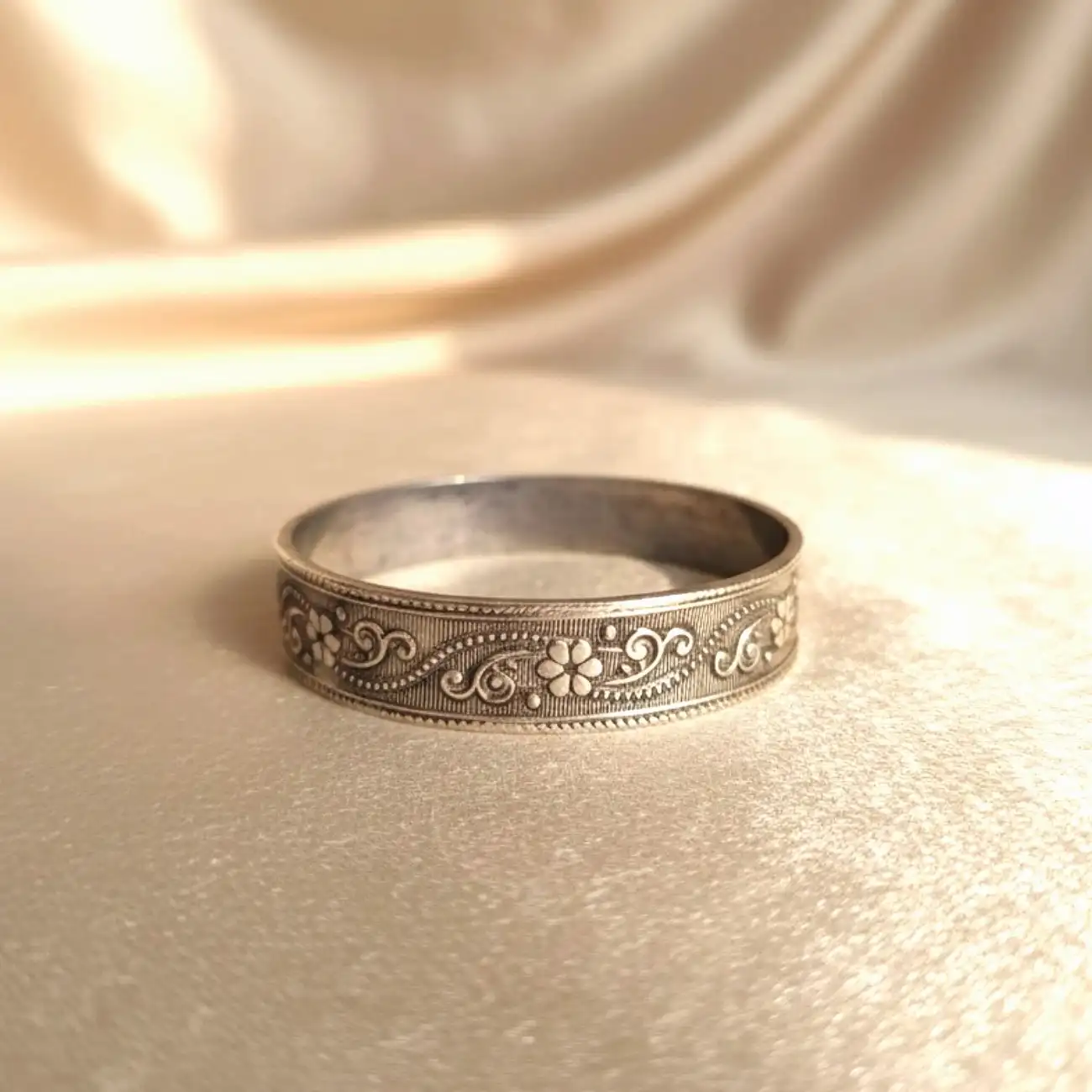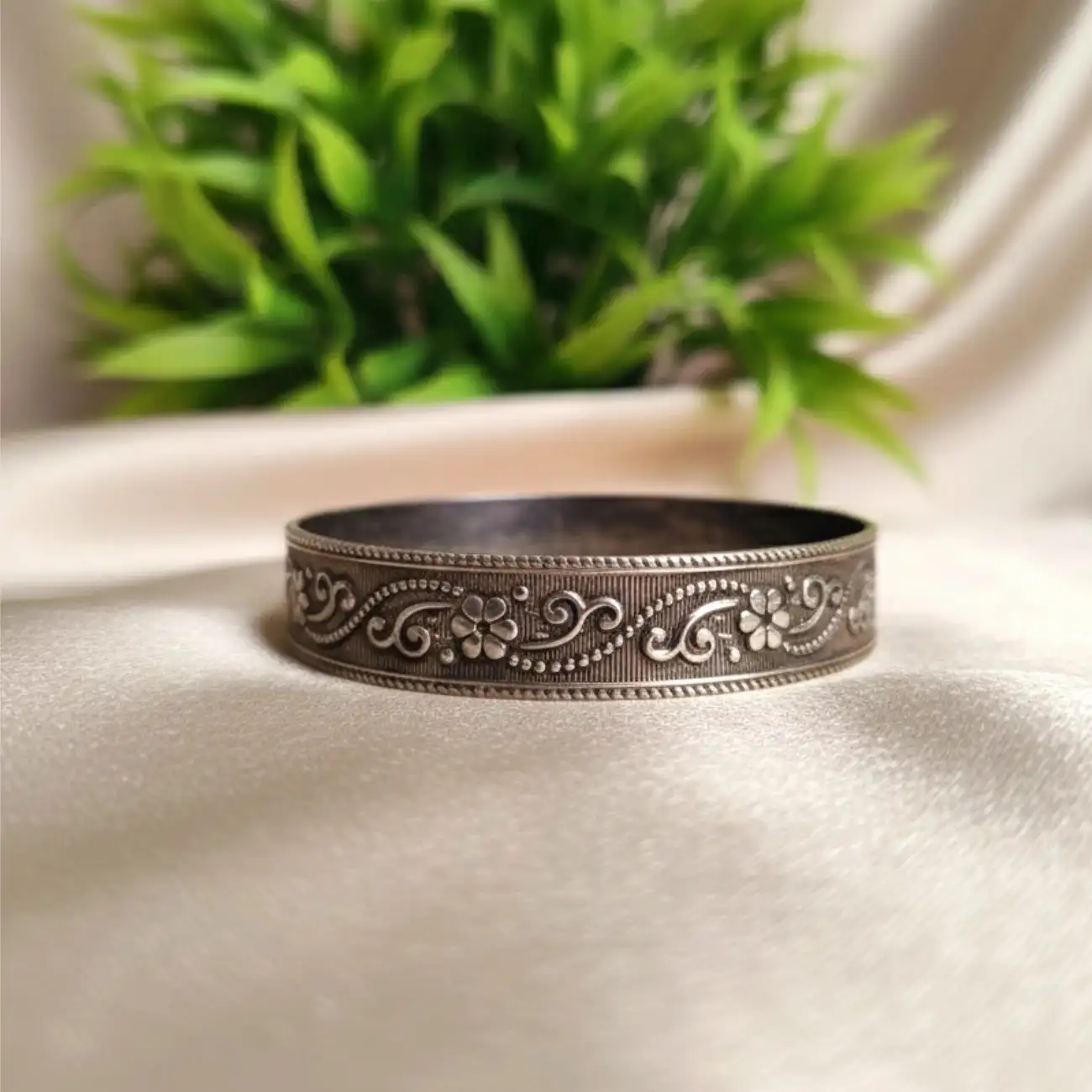 A beautifully detailed silver cuff featuring intricate floral and vine etchings framed with fine beaded edges. The handcrafted texture adds a touch of...