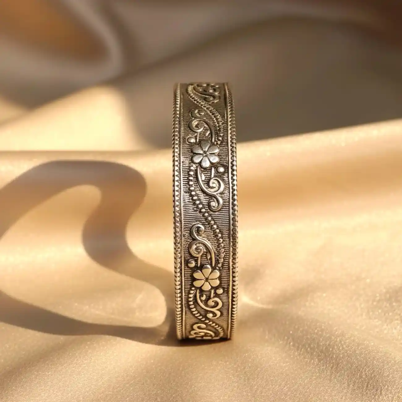 A beautifully detailed silver cuff featuring intricate floral and vine etchings framed with fine beaded edges. The handcrafted texture adds a touch of old-world charm, making this piece a timeless accessory that stands out effortlessly. Its structured design ensures a comfortable fit while giving your wrist a refined, elegant statement. Dress pairing: • Ethnic wear like cotton sarees, block-printed kurtas, and handloom outfits • Indo-western looks—flowy skirts, solid dresses, and earthy-tone co-ords • Festive ensembles with oxidised silver sets or minimal jewellery • Casual everyday looks when you want a subtle yet artistic accent
