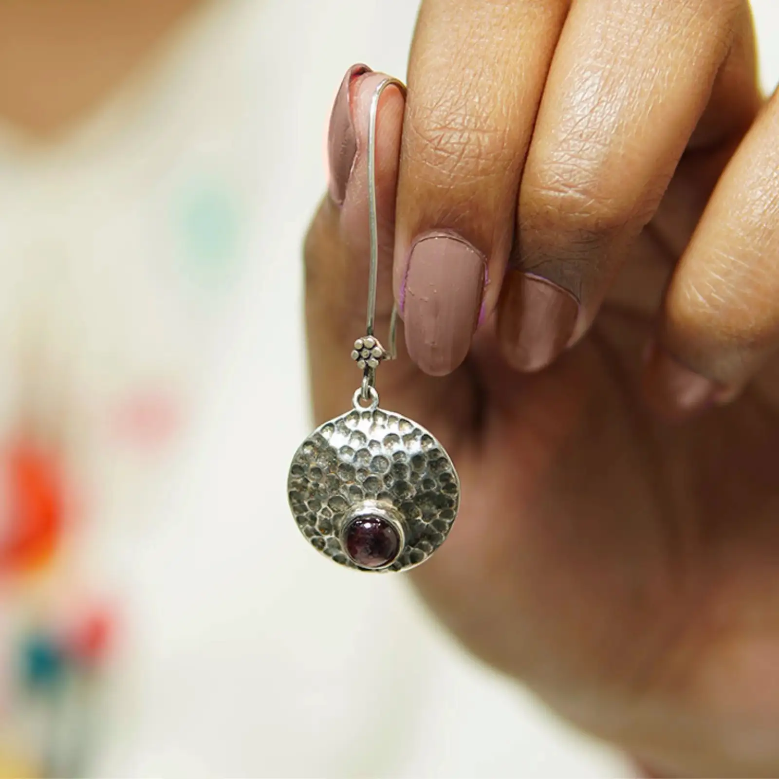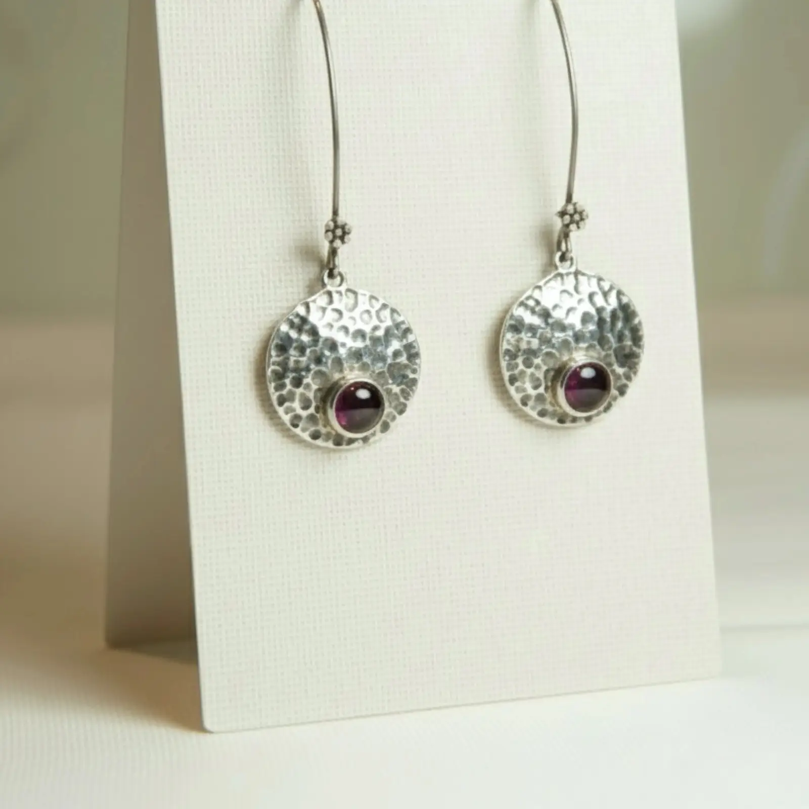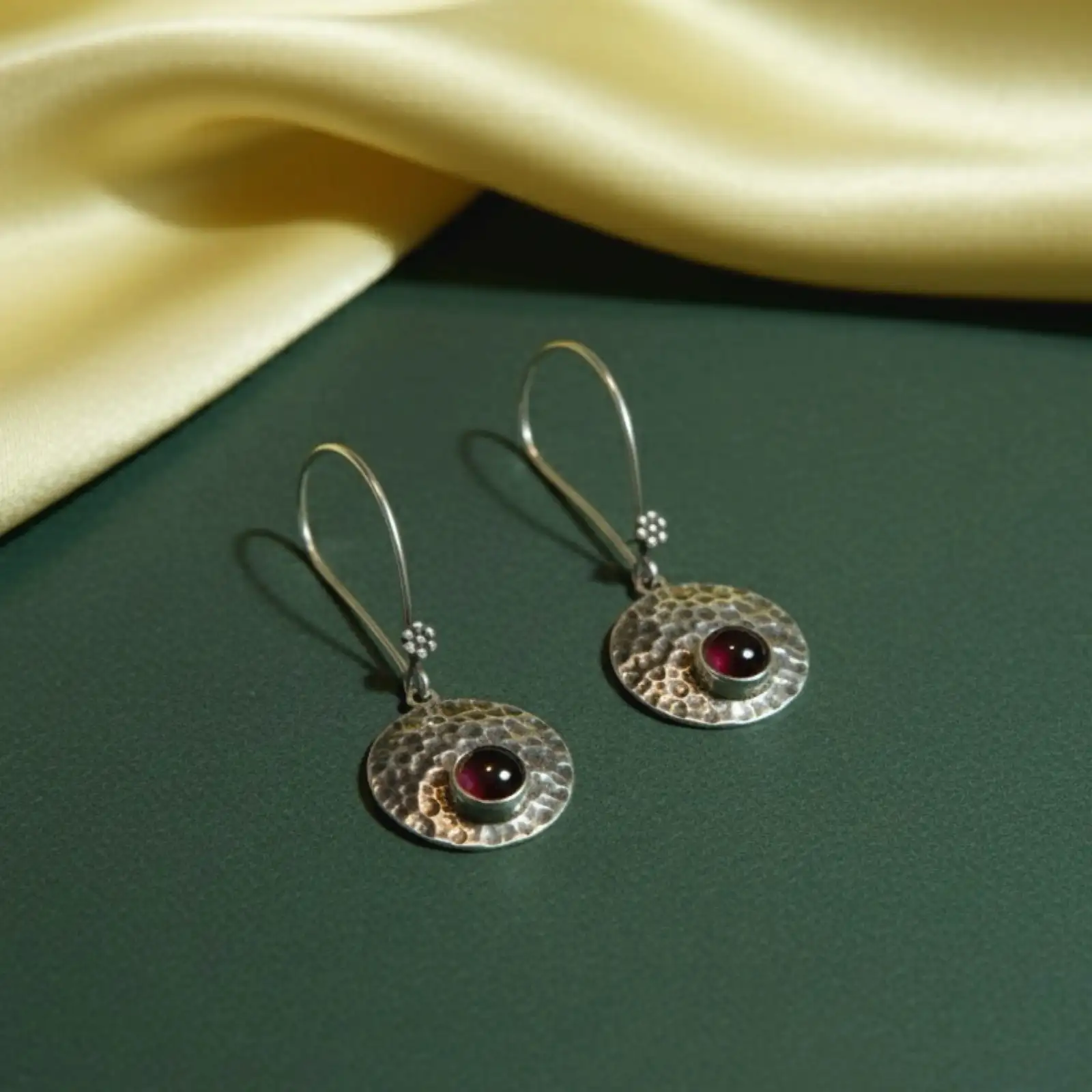 These handcrafted earrings blend raw texture with refined beauty. The hammered silver discs catch light beautifully, giving each piece a unique artisanal character. At the center lies a deep garnet gemstone, radiating warmth and strength — a perfect symbol of grounded elegance. Designed for women who love subtle statement pieces, these earrings add a hint of sophistication to casual, work, or evening wear. Each pair celebrates craftsmanship, texture, and timeless charm.
