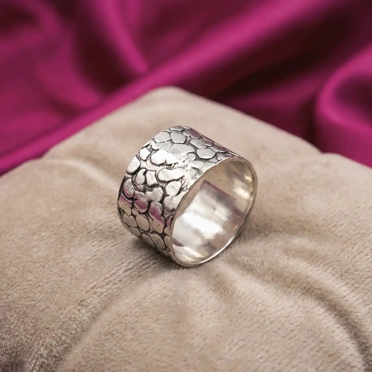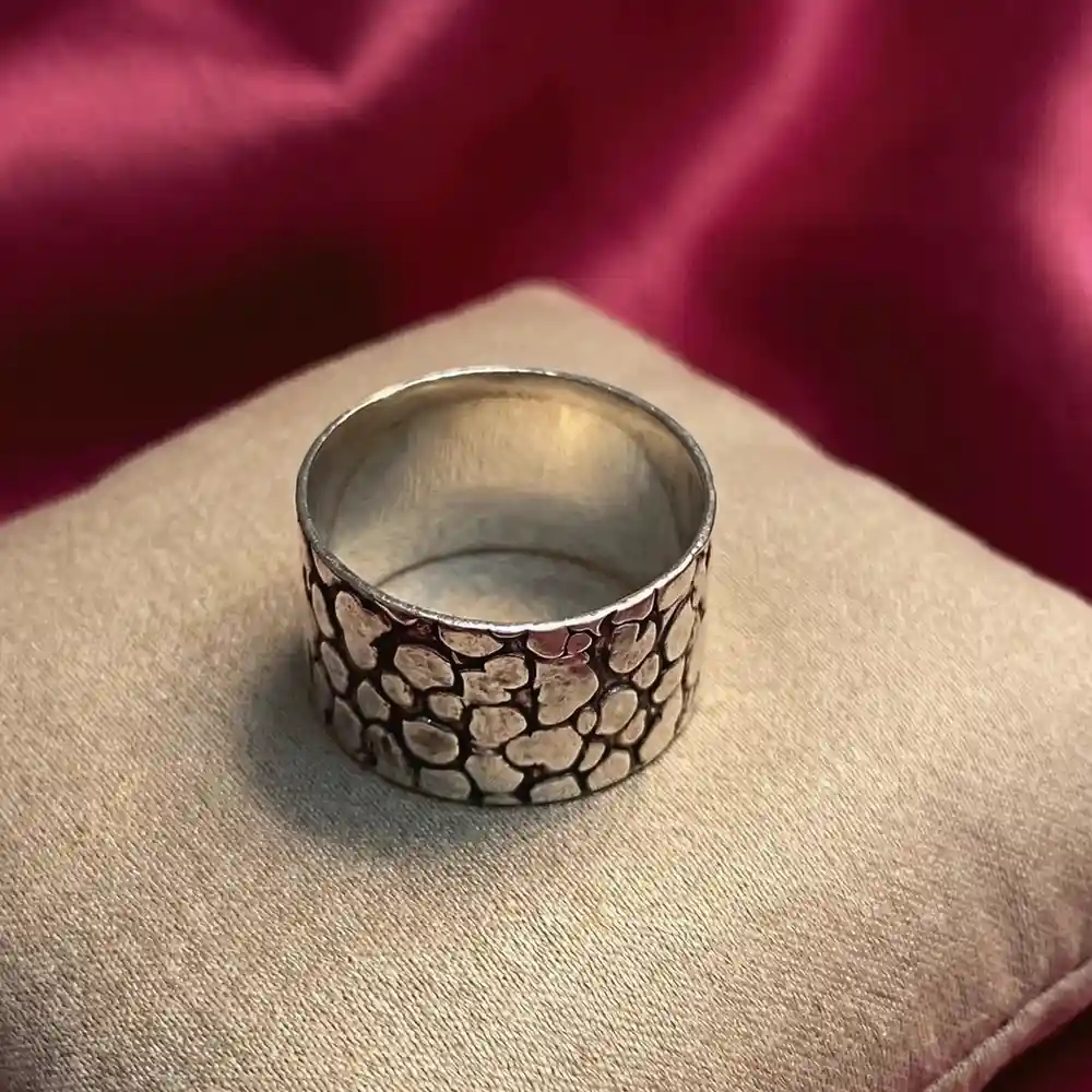 Jewellery Type: Ring Metal: 925 Sterling Silver Size: 14 (Steel Ring Size) Design: Wide band with organic, stone-like pattern Occasion: Daily wear, festive styling, statement looks A bold silver band ring crafted with an organic hammered texture that creates a beautifully irregular, stone-like surface. The wide band design reflects a raw, artisanal character while maintaining a refined silver sheen. Strong yet understated, this ring is perfect for those who appreciate handcrafted details and timeless minimalism. Dress pairing: • Indian wear like linen sarees, cotton kurtas, and handloom outfits • Western looks with monochrome dresses, shirts, blazers, or denim • Complements earthy tones, jewel shades, deep greens, maroons, and neutrals • Ideal for everyday wear, office styling, or contemporary festive looks