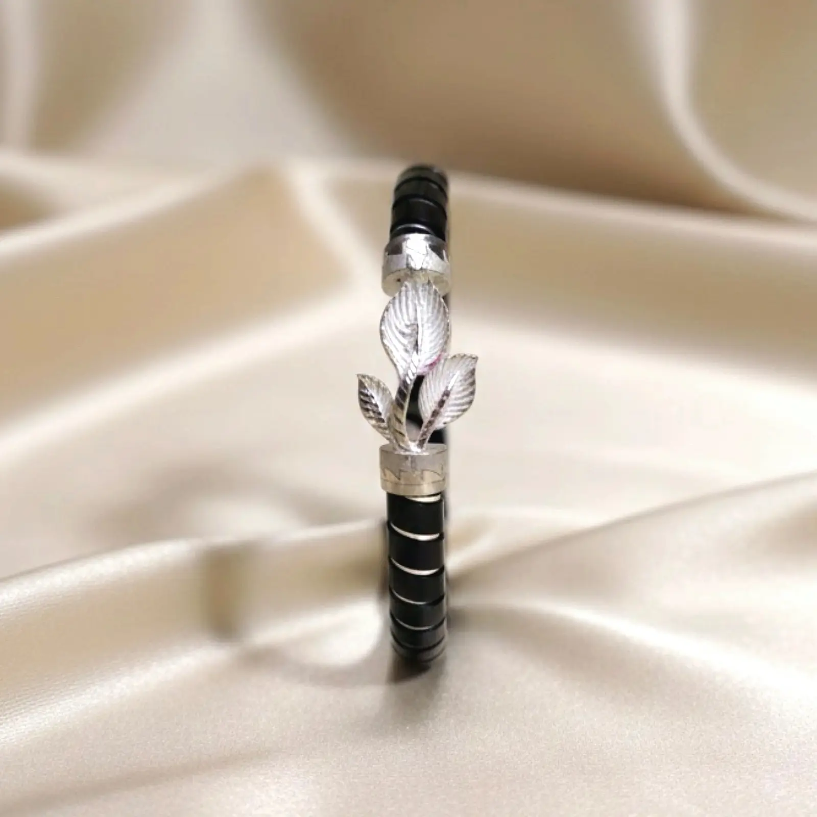 This elegant black Pola bangle features a finely carved silver-tone cluster of leaves, adding a soft, organic charm to its sleek and polished look. Th...