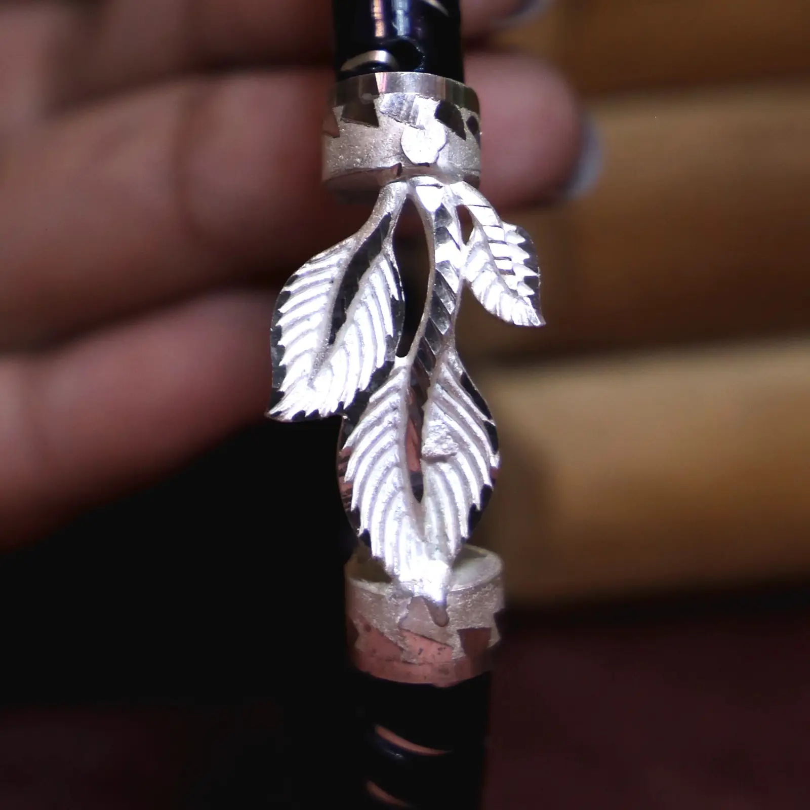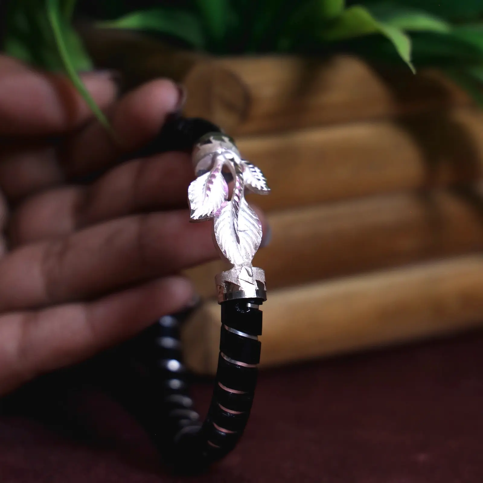 This elegant black Pola bangle features a finely carved silver-tone cluster of leaves, adding a soft, organic charm to its sleek and polished look. The deep black finish creates a striking contrast against the detailed leaf motif, making it perfect for both everyday elegance and festive wear. It pairs beautifully with traditional sarees—especially white, red, black, gold, and deep green—or with simple kurtis and salwar suits for a refined, graceful touch.