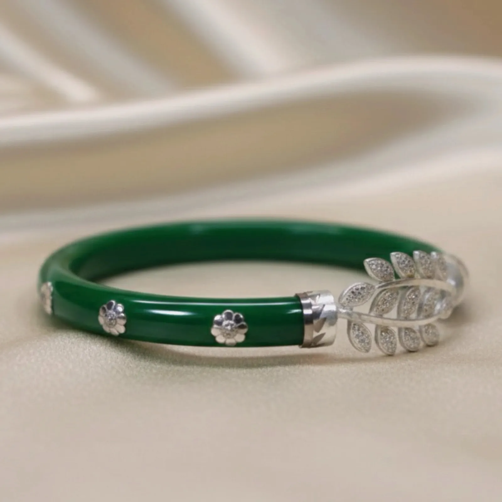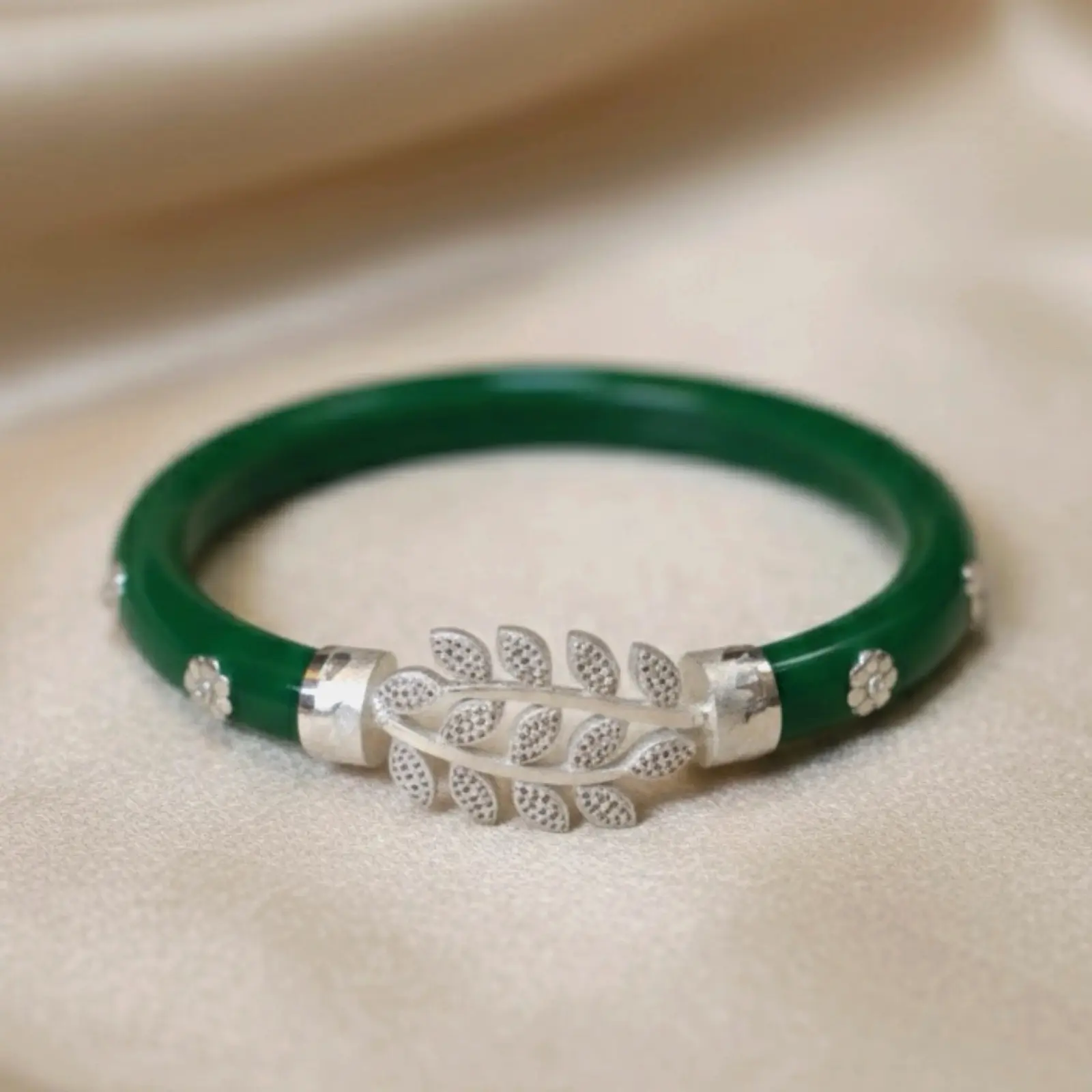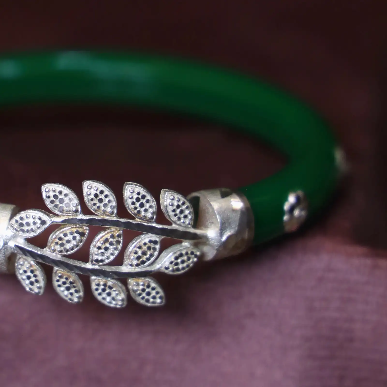 This vibrant green Pola bangle is adorned with a beautifully detailed silver-tone leaf motif, giving it a graceful and nature-inspired charm. The smoo...