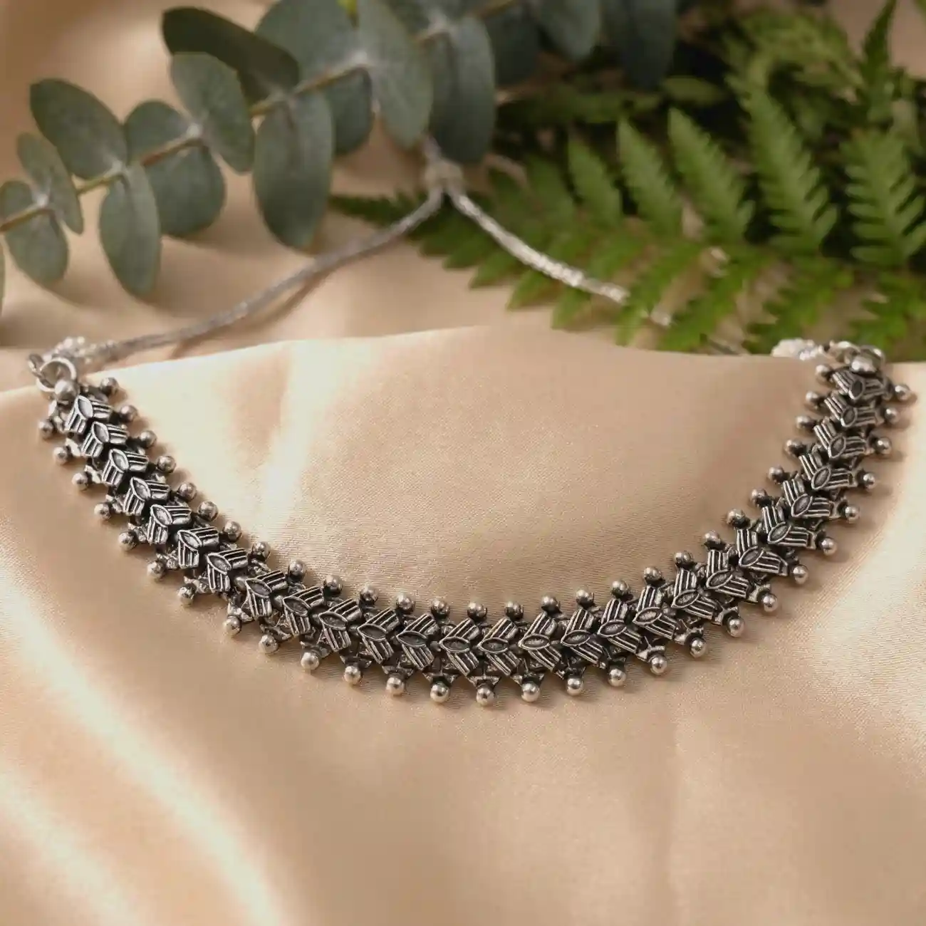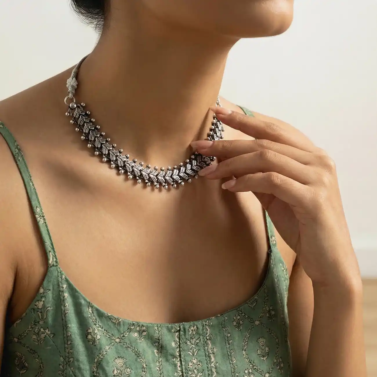 A delicately crafted silver choker featuring a repeating leaf-inspired pattern, highlighted with fine textural detailing and tiny silver bead accents along the edges. The design flows organically around the neckline, offering a soft yet structured look that feels rooted in nature-inspired craftsmanship. Elegant and lightweight in appearance, this piece is perfect for those who prefer understated statement jewellery. Dress pairing: • Floral cotton dresses, strappy summer outfits, and soft-toned kurtas • Handloom sarees in sage, ivory, powder green, or muted pastels • Minimal Indo-western looks and solid co-ord sets for a graceful, everyday finish