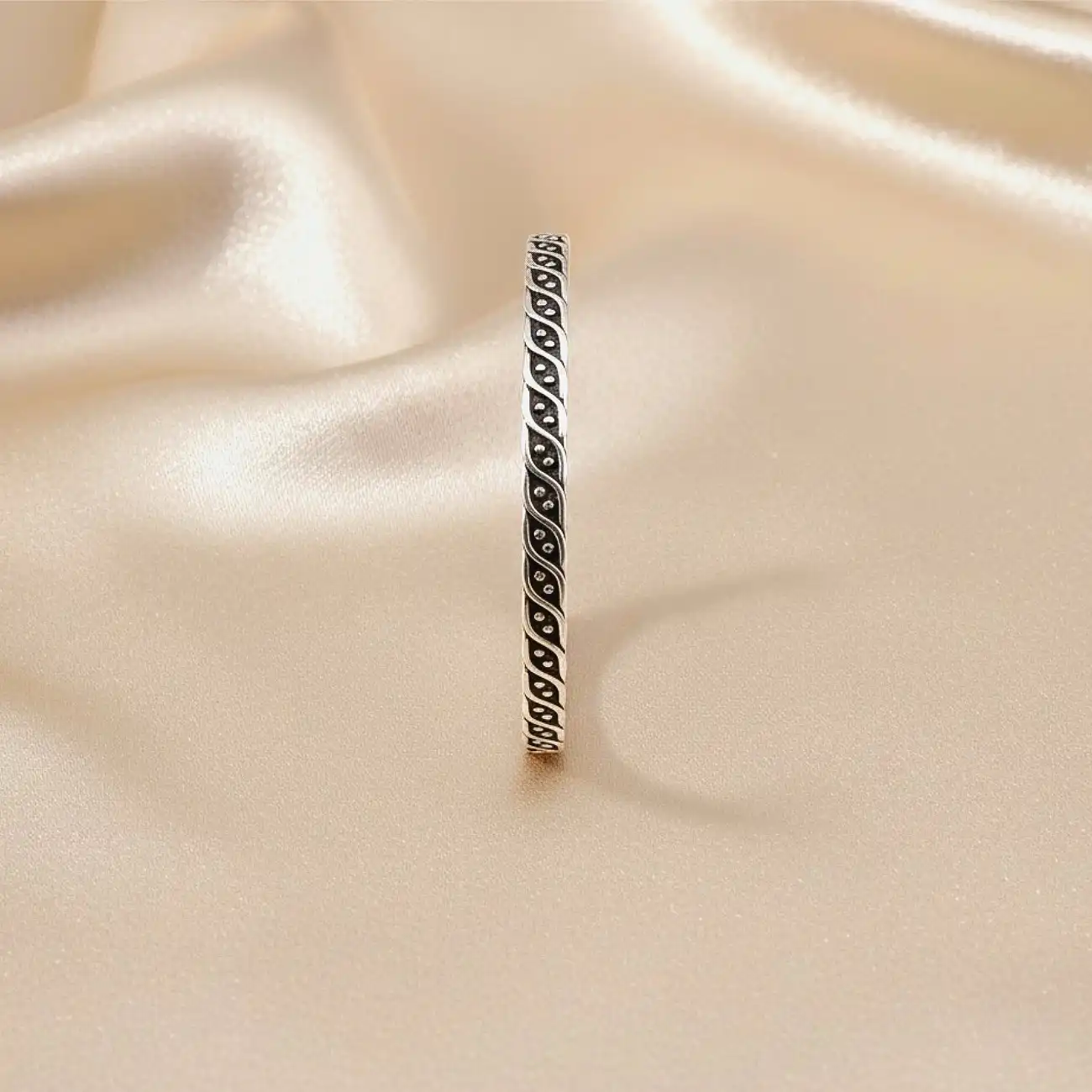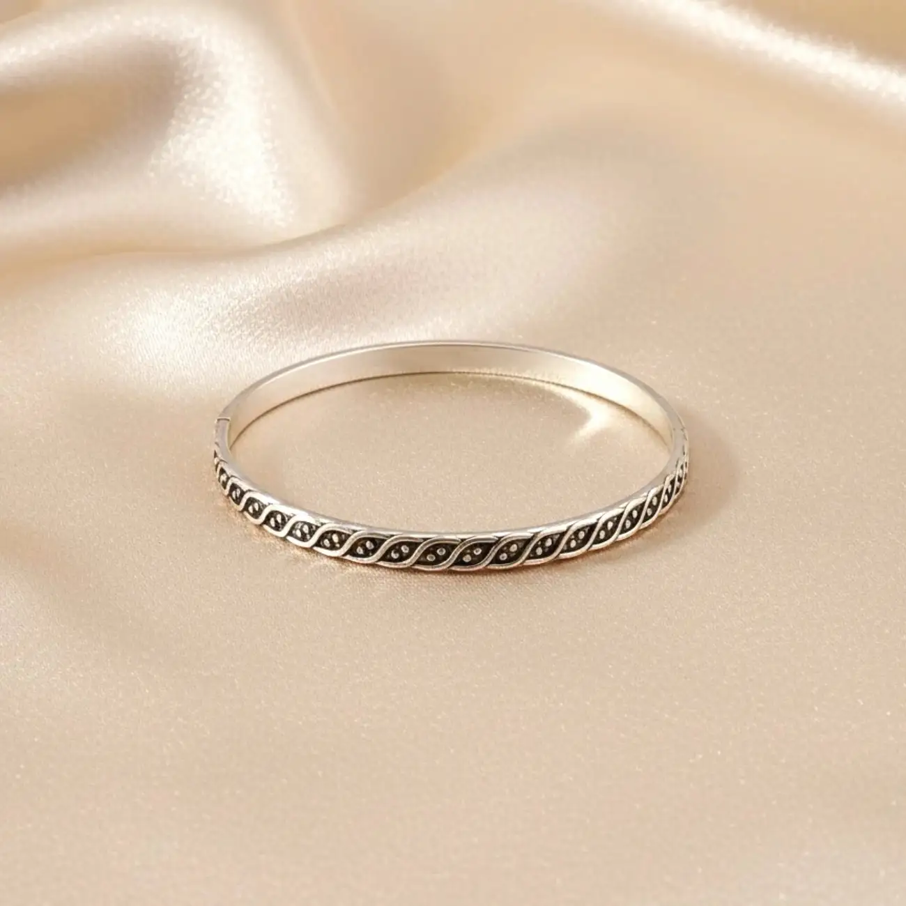 A slim and elegant silver cuff featuring a continuous leaf-inspired pattern with fine dotted detailing. The delicate design wraps gracefully around the wrist, creating a timeless accessory that blends simplicity with artistic charm. Lightweight, polished, and perfect for everyday wear, this cuff offers a subtle yet stylish statement. Dress pairing: • Everyday ethnic wear—printed kurtas, cotton sarees, and salwar suits • Western basics—solid dresses, tank tops, linen shirts • Indo-western looks—boho dresses, fusion sets, and skirts • Ideal for office wear or stacking with other thin bangles for a layered style