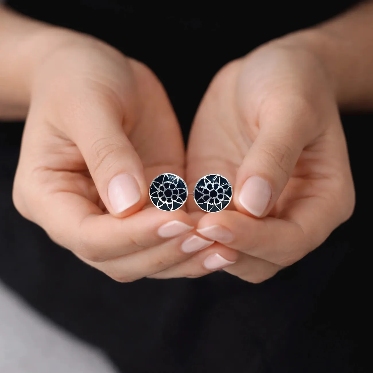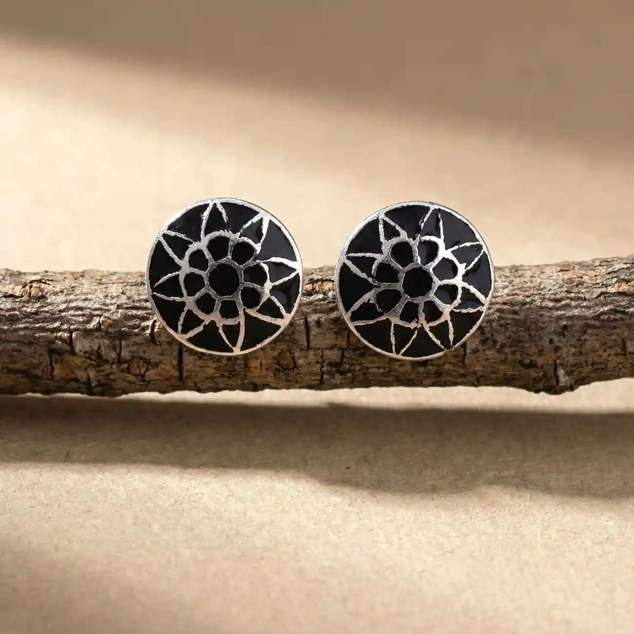 A pair of round antique-style studs featuring a deep black center highlighted by an intricate silver floral lattice pattern. The contrast between the ...