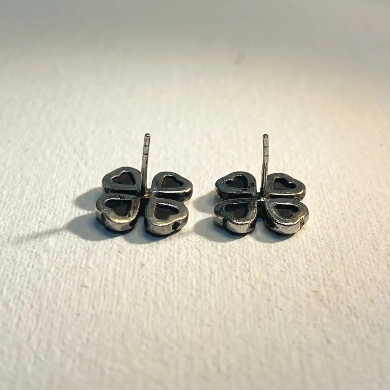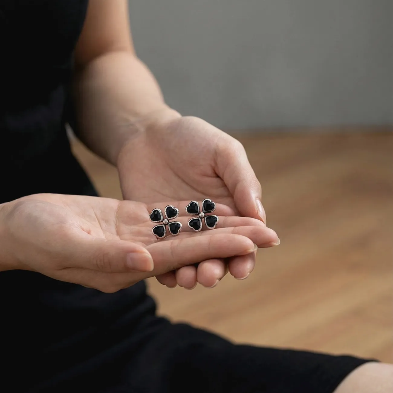 A pair of delicate silver studs crafted in a four-petal floral form, each petal set with a deep black heart-shaped stone and finished with a subtle si...