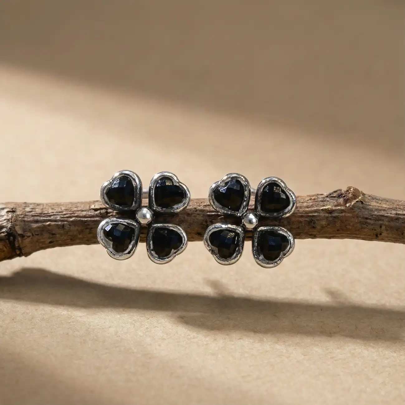 A pair of delicate silver studs crafted in a four-petal floral form, each petal set with a deep black heart-shaped stone and finished with a subtle silver bead at the center. The compact design blends softness with contrast, making these studs quietly elegant yet visually striking—perfect for everyday wear with a refined edge. Dress pairing: • Solid cotton kurtas, monochrome ethnic wear, minimal prints • Black dresses, white shirts, structured tops • Complements black, ivory, grey, and muted jewel tones for a clean, polished finish