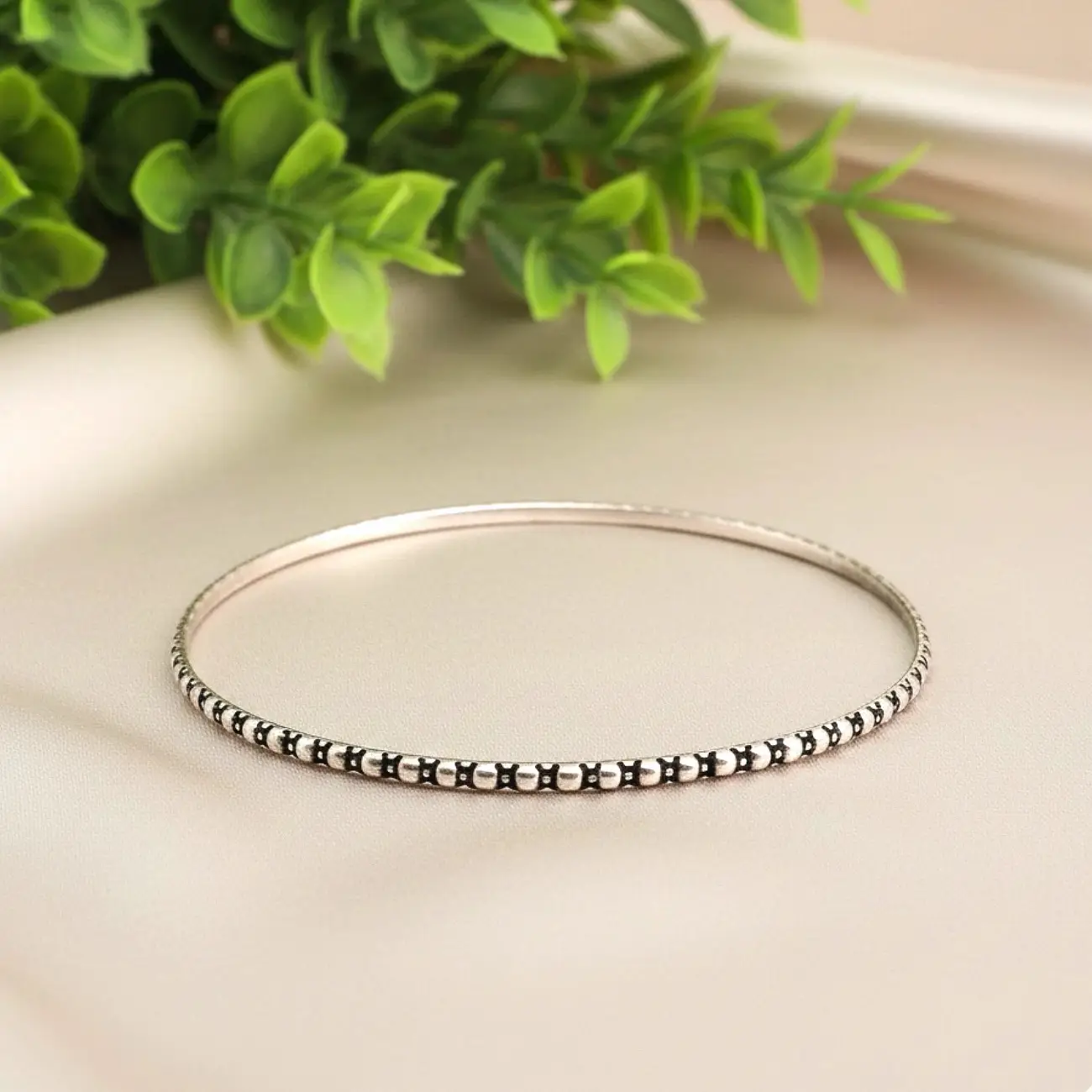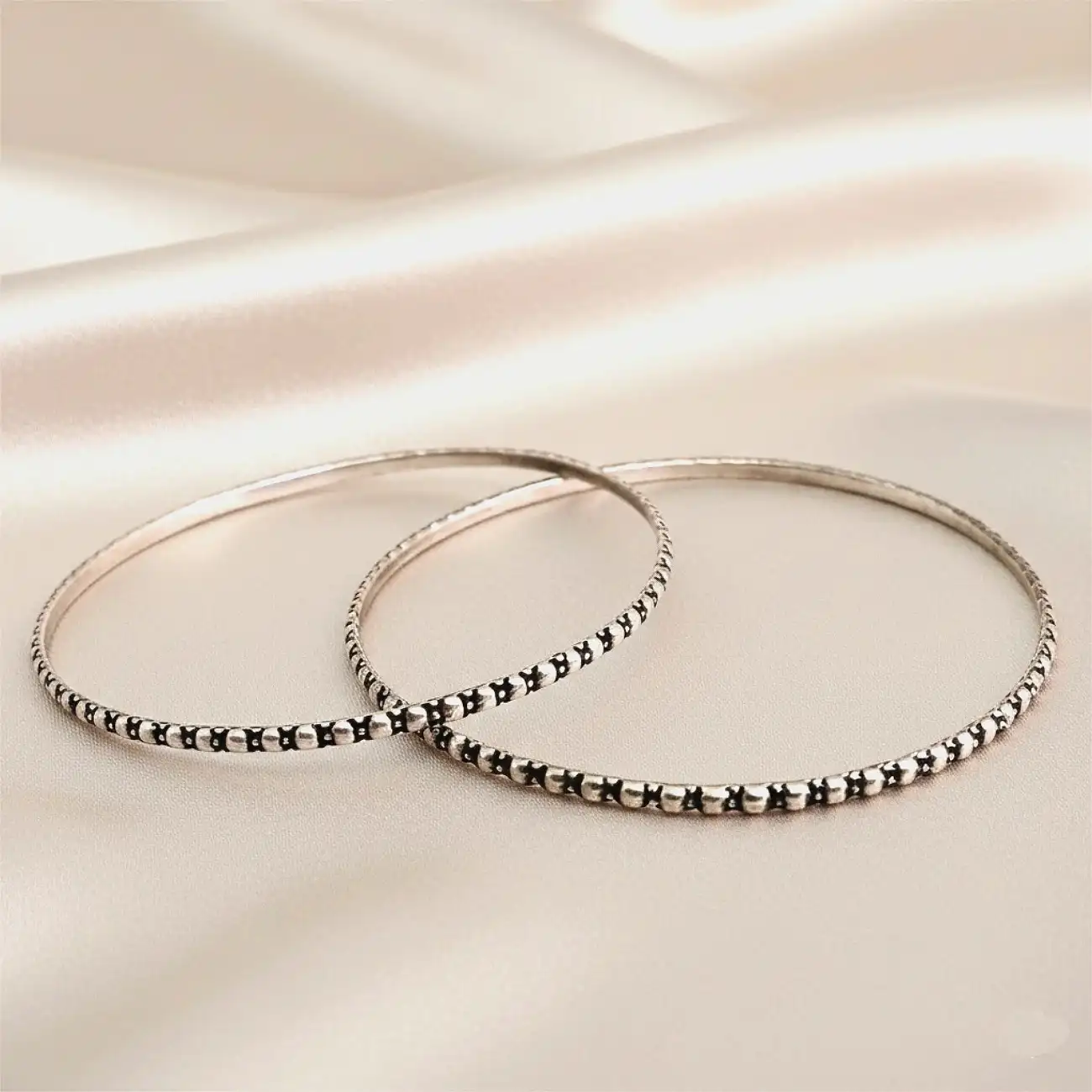 A delicate pair of silver bangles crafted with a fine row of mini bead detailing around the entire circumference. Their slim, minimal design makes them perfect for everyday wear, while the textured oxidised finish adds a touch of handcrafted charm. Lightweight, stackable, and versatile, these bangles complement both simple and ornate looks with ease. Dress pairing: • Daily wear—cotton kurtas, printed dresses, and soft pastel outfits • Traditional attire—handloom sarees, salwar suits, and festive kurtas • Western casuals—denim, tank tops, linen shirts for a chic fusion touch • Beautiful for stacking with broader silver cuffs or multiple thin bangles