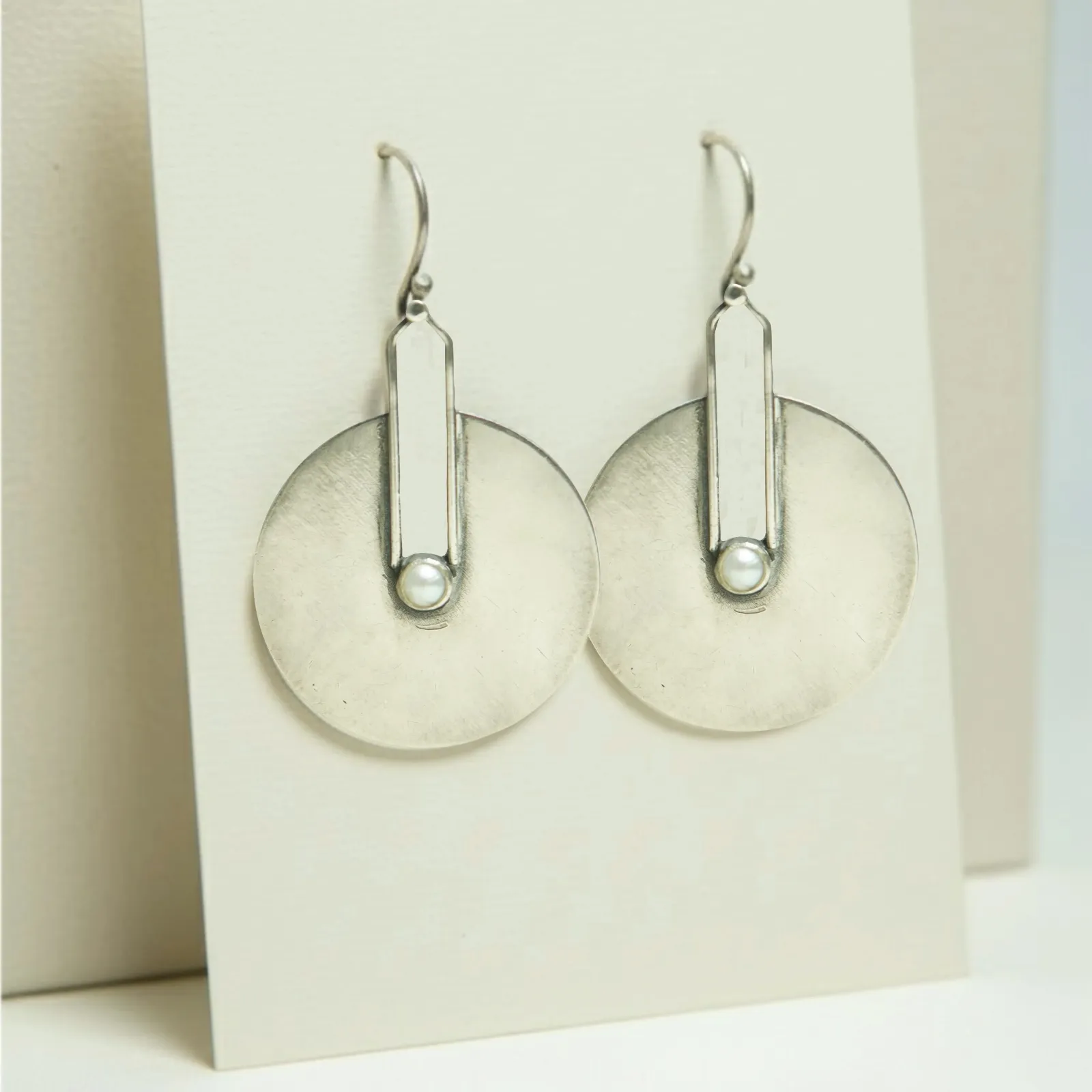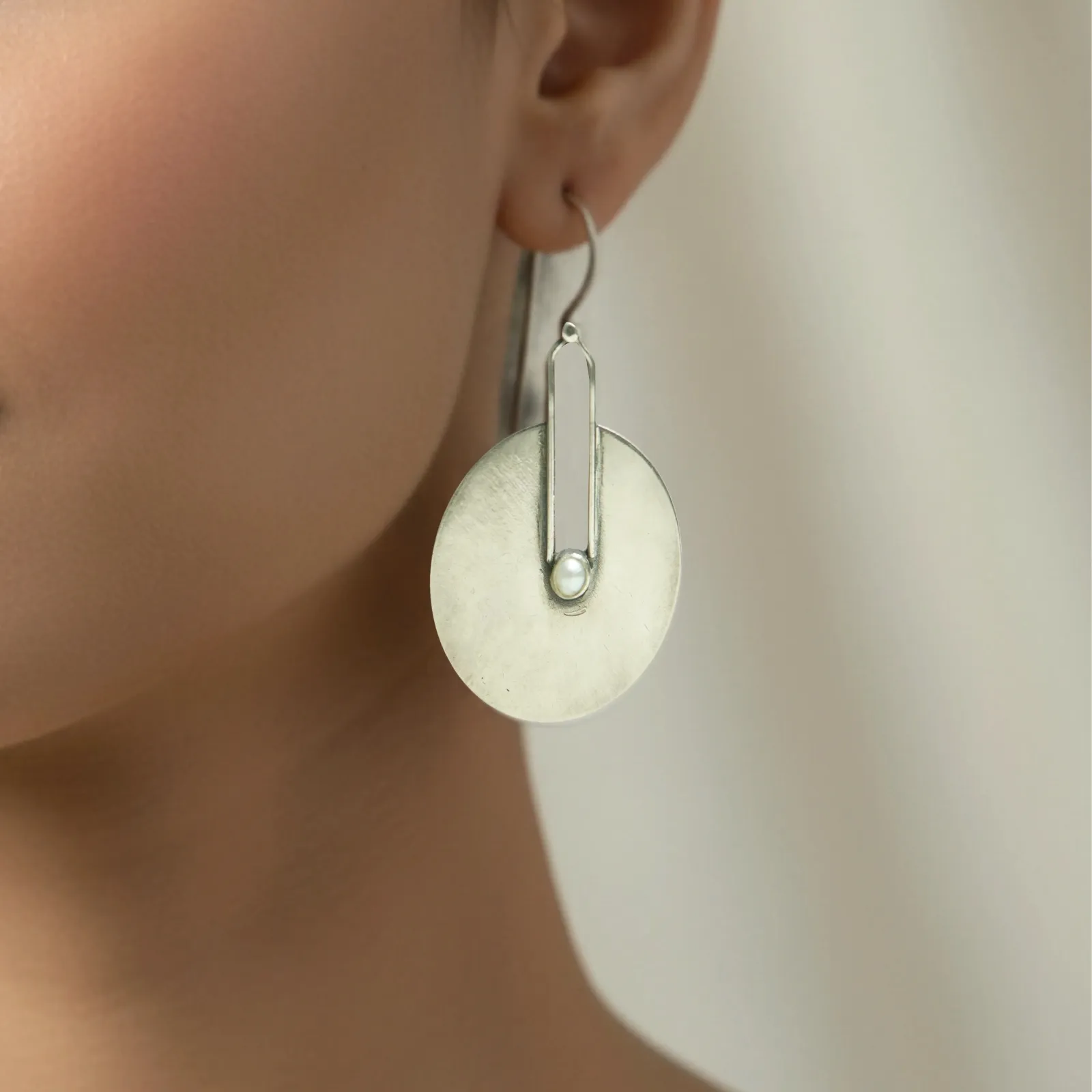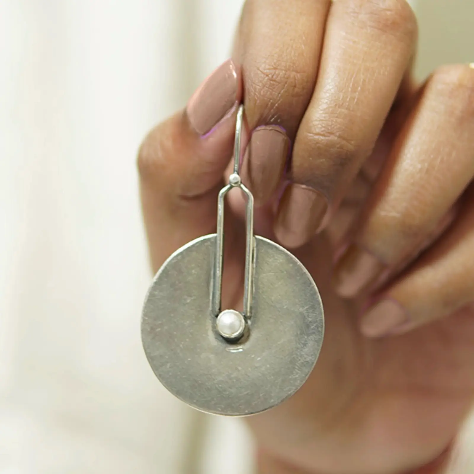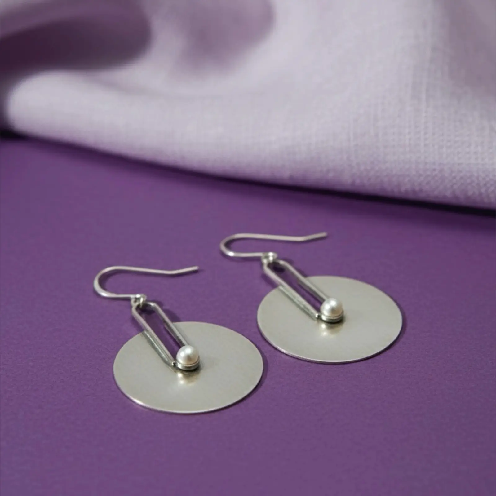 Sleek, modern, and effortlessly stylish — these handcrafted silver earrings redefine minimalism. Featuring a brushed circular disc design paired with a delicate pearl accent, they strike the perfect balance between simplicity and sophistication. The clean geometric silhouette makes them ideal for both workwear and evening looks, adding a touch of refined charm to any outfit. Lightweight and versatile, these earrings are a timeless addition to every jewelry lover’s collection.