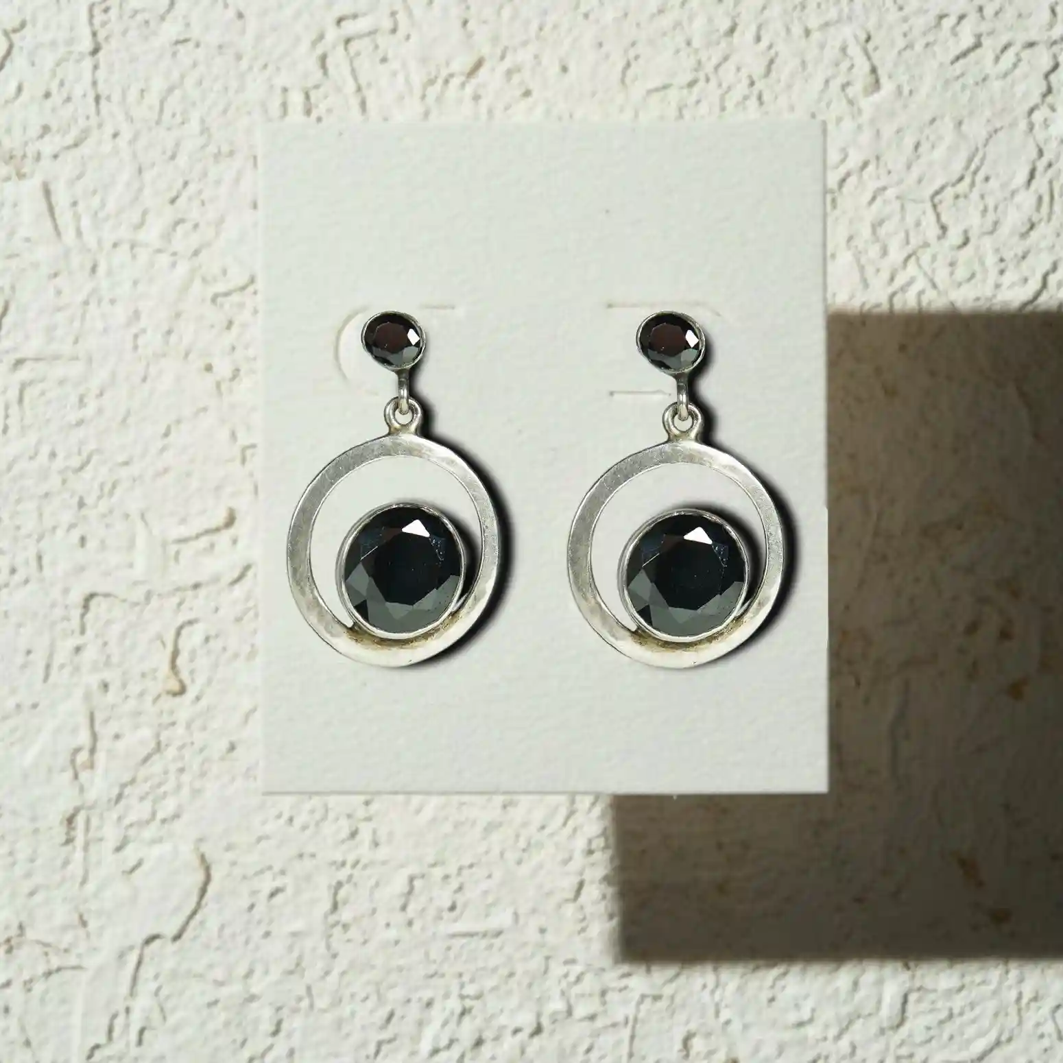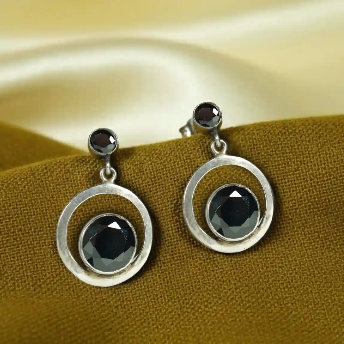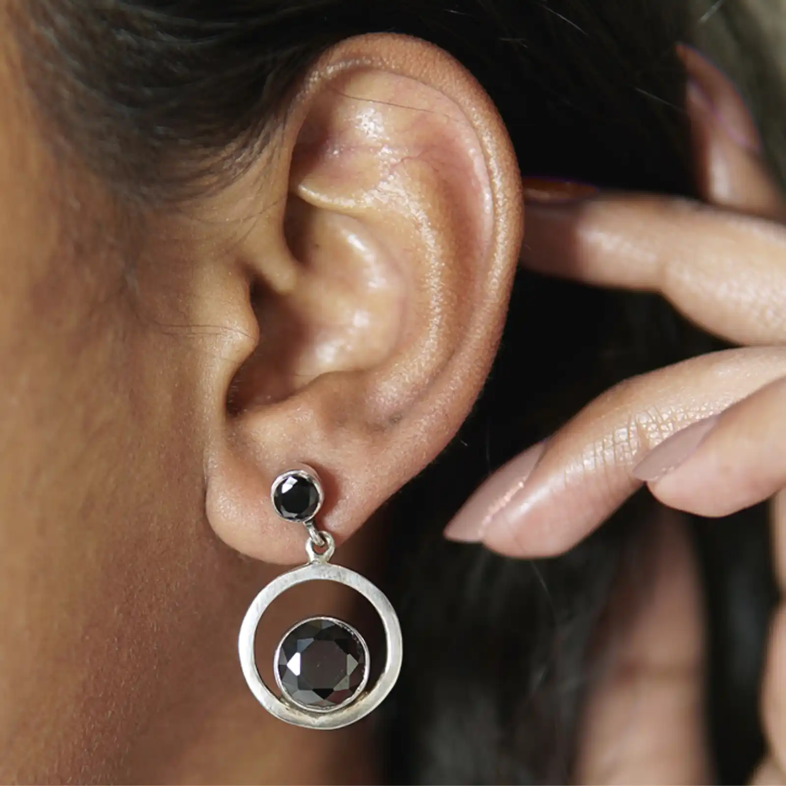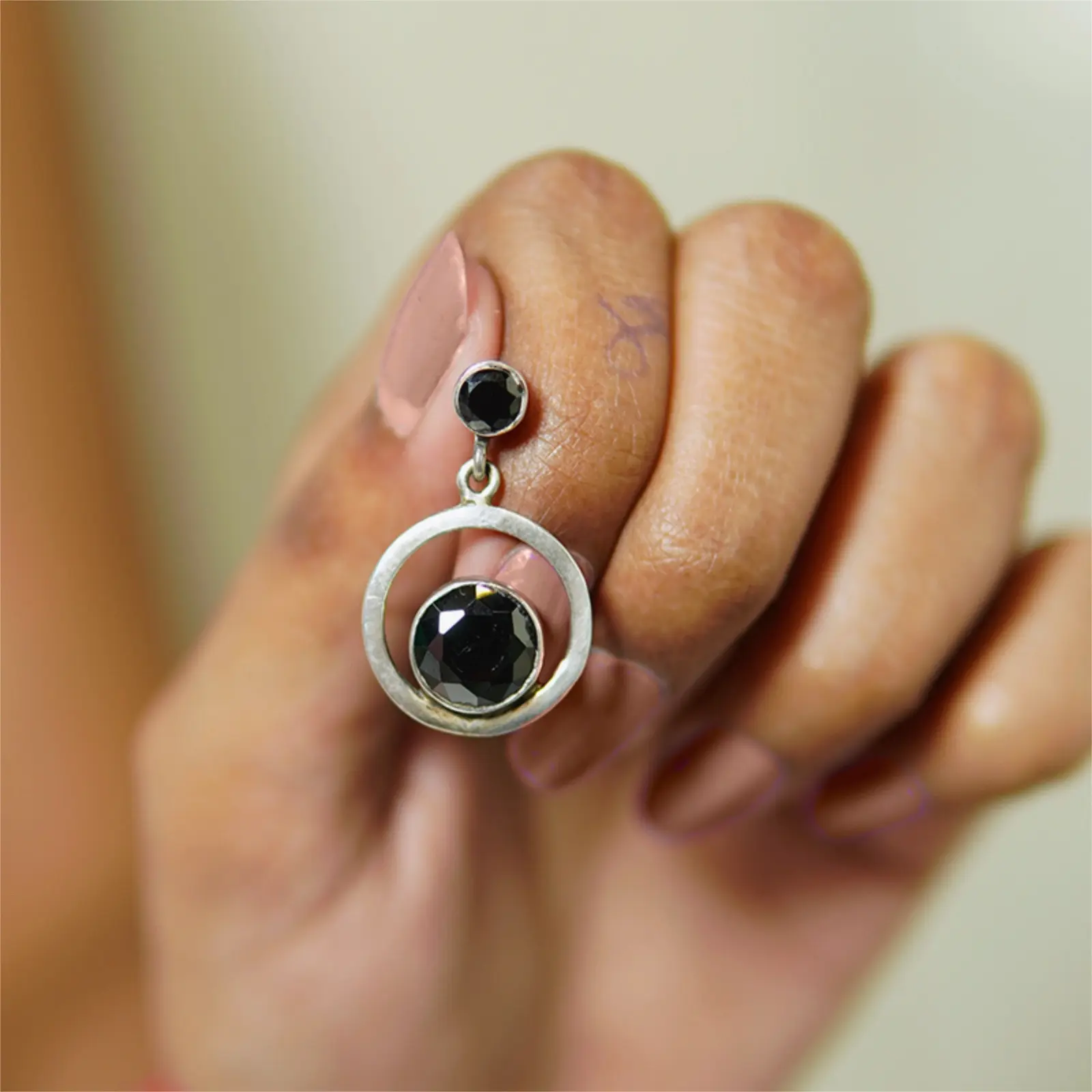 A sleek pair featuring glossy black stones set within open circular frames, creating a modern orbit-inspired silhouette. The upper stud stone adds a refined touch, while the floating central stone gives the design a graceful, balanced look. These earrings offer a contemporary charm that works beautifully for both casual and dressed-up occasions. Dress-Pairing Suggestions • Pair with a black satin slip dress for an elegant evening look. • Style with a white shirt and tailored trousers for a clean, modern office outfit. • Combine with a deep jewel-toned kurta or anarkali for a striking Indo-western blend.