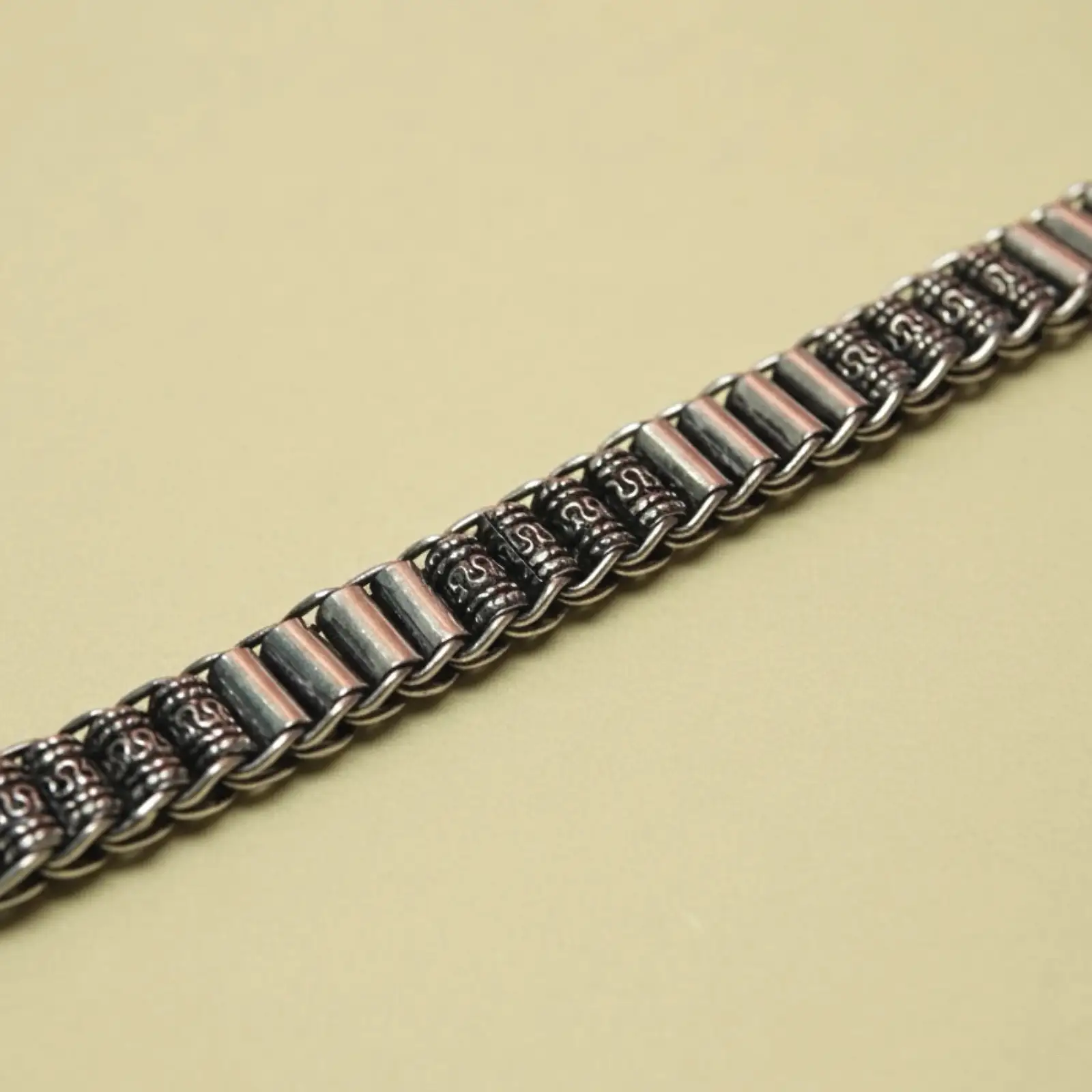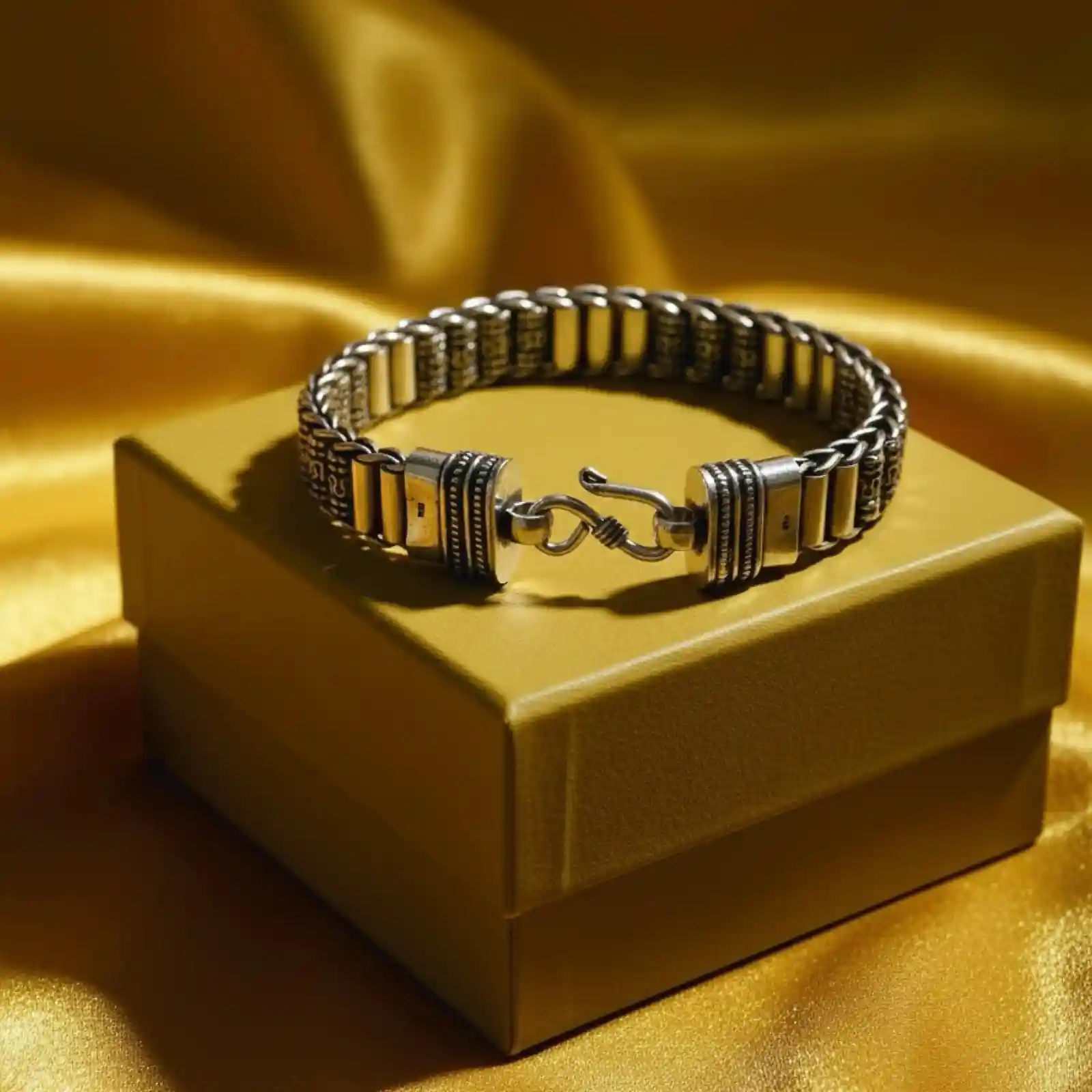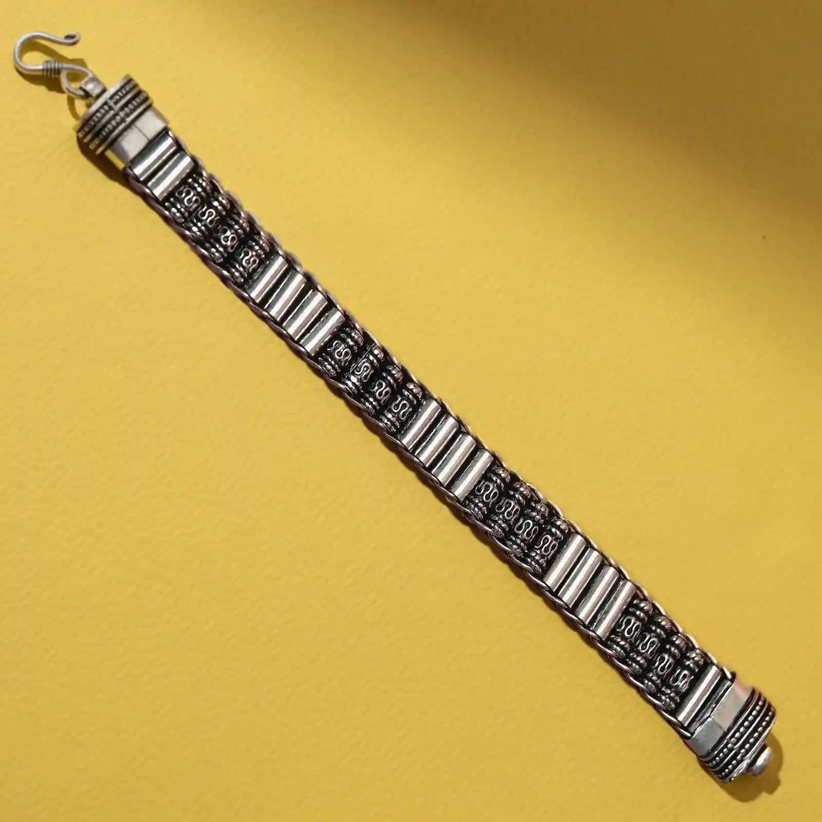 The Oxidized Silver Chain-Link Bracelet by Mahanam Jewellers showcases timeless craftsmanship with a bold and refined edge. Designed for the modern man, this bracelet features intricately carved chain links in oxidized silver, offering both strength and elegance. Its flexible structure ensures a comfortable fit while maintaining a masculine, statement-making appeal. Highlights: • Handcrafted oxidized silver bracelet with detailed chain-link design • Strong, flexible structure for lasting wear • Premium clasp for secure closure • Versatile accessory for both traditional and casual looks • Ideal for gifting or daily wear