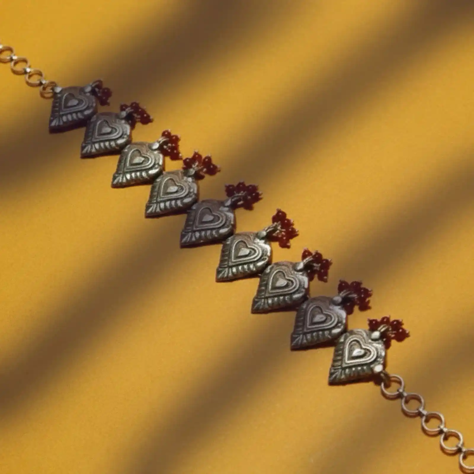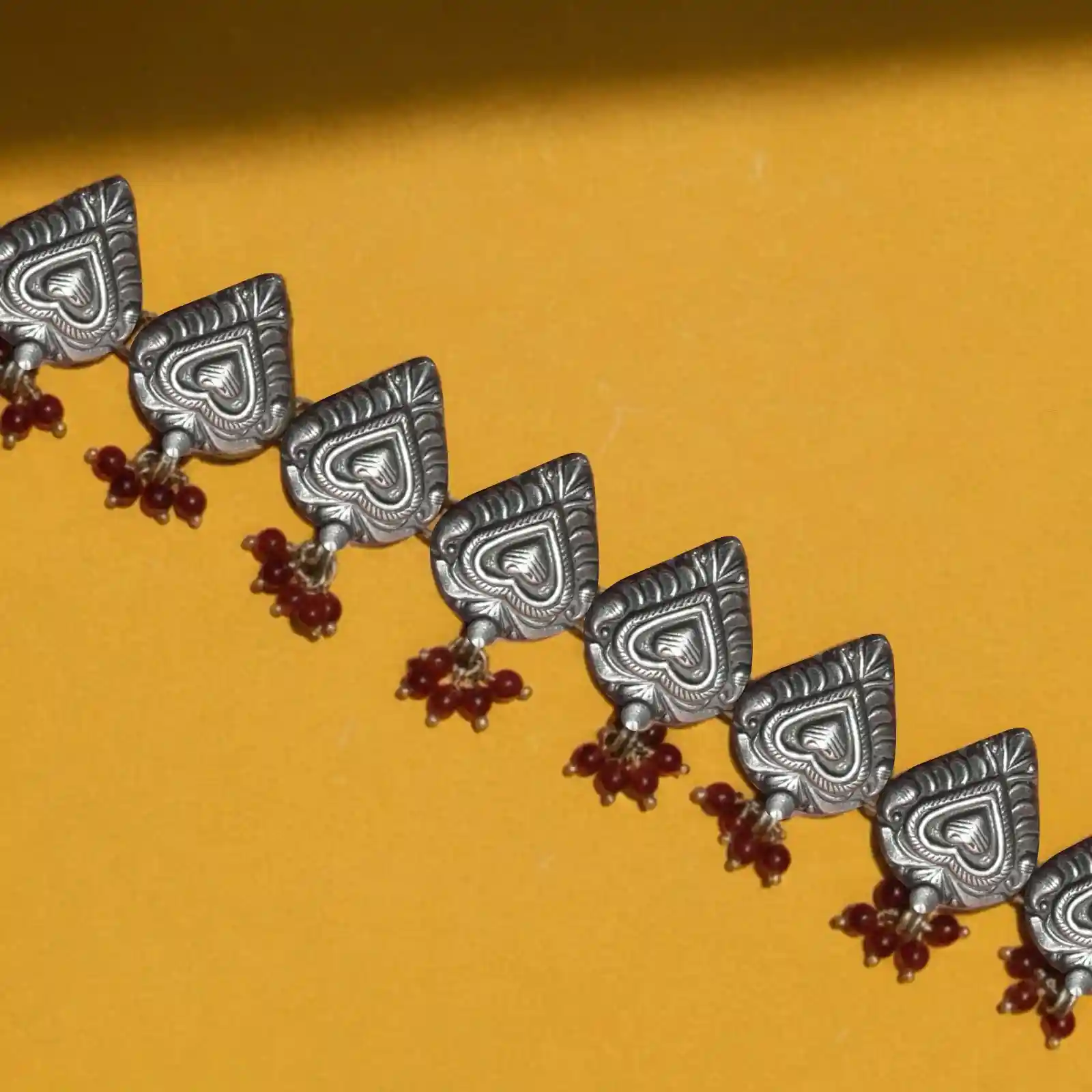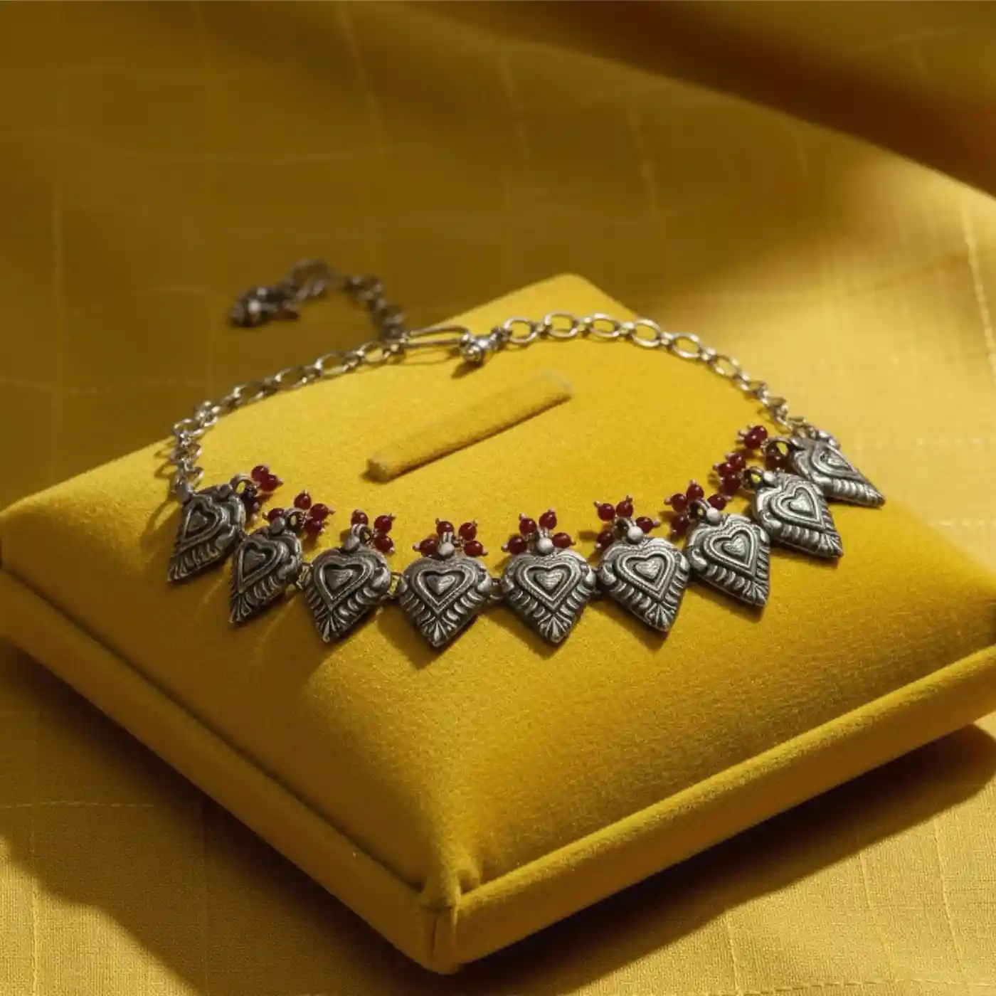 The Oxidized Silver Heart Motif Choker by Mahanam Jewellers is a perfect blend of tradition and artistry. Each triangular heart-shaped element is beautifully hand-engraved and finished with deep ruby-toned bead clusters that add a subtle touch of color. Designed for those who appreciate timeless ethnic jewellery, this choker complements both contemporary and traditional attire, making it a versatile piece for festive and cultural occasions. Highlights: • Handcrafted oxidized silver choker with intricate heart motifs • Adorned with ruby bead clusters for an elegant contrast • Lightweight and comfortable for long wear • Adjustable chain for a perfect fit • Ideal for festive celebrations, weddings, or gifting