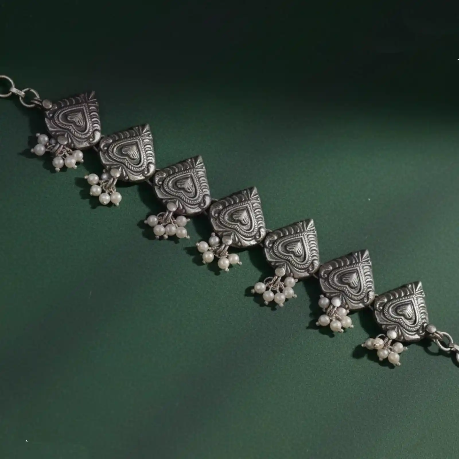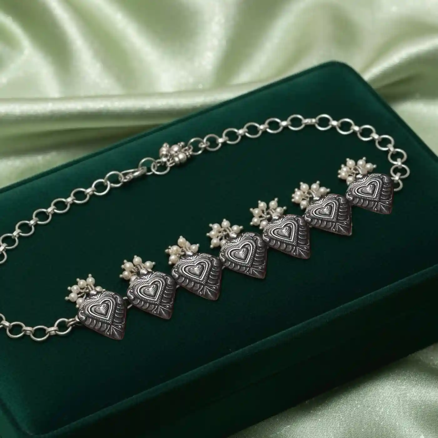 The Oxidized Silver Heart Motif Choker by Mahanam Jewellers radiates charm and heritage. Crafted with love, each heart-shaped design showcases intricate detailing that captures the essence of traditional artistry. The choker is finished with elegant pearl clusters, adding a touch of sophistication and movement. Perfect for festive occasions, this piece blends emotion, craftsmanship, and beauty in a timeless form. Highlights: • Handcrafted oxidized silver choker featuring heart motifs • Decorated with delicate pearl clusters for a graceful touch • Adjustable chain for a perfect fit • Lightweight and comfortable for long wear • Complements sarees, lehengas, and ethnic fusion attire