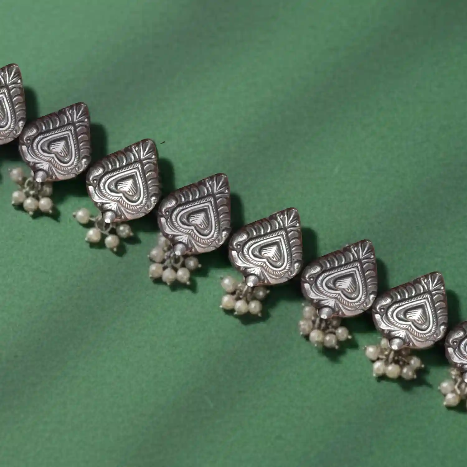 The Oxidized Silver Heart Motif Choker by Mahanam Jewellers radiates charm and heritage. Crafted with love, each heart-shaped design showcases intrica...