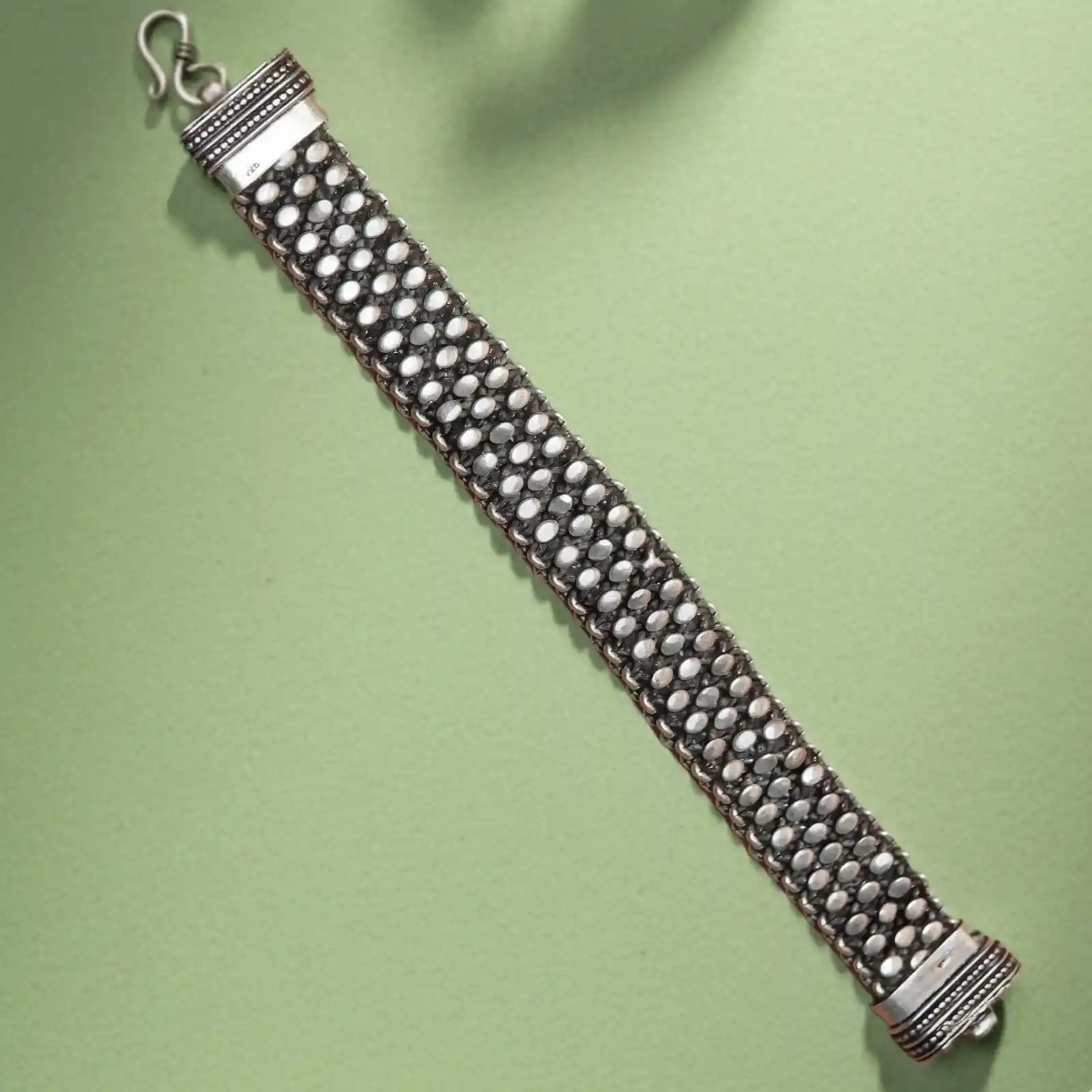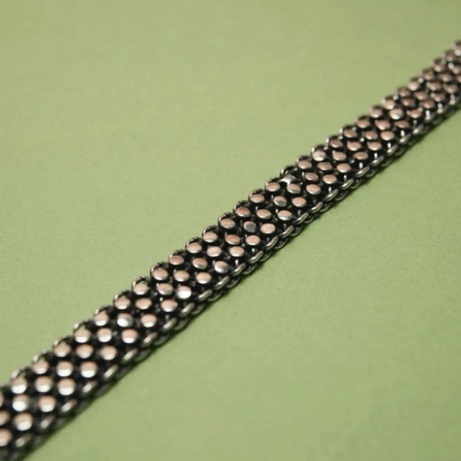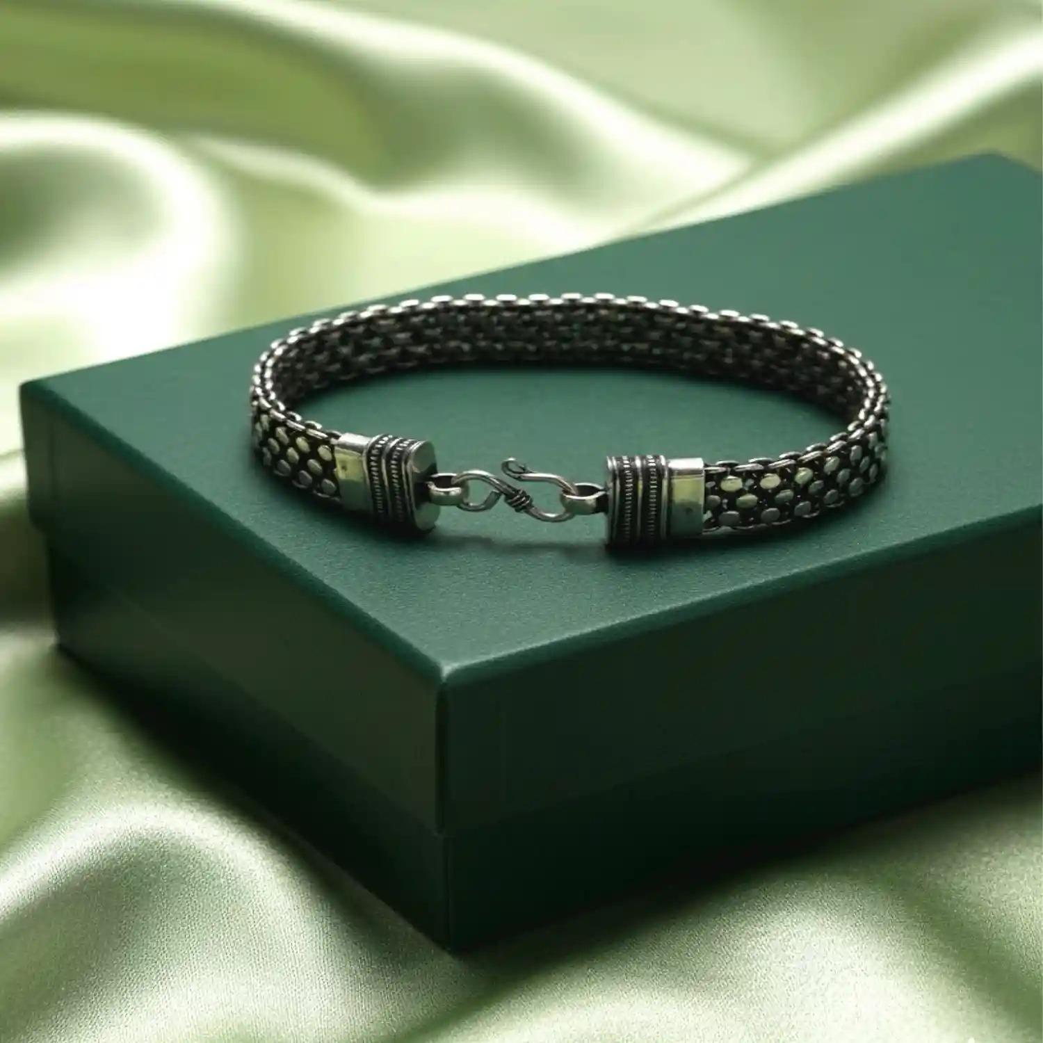 The Oxidized Silver Textured Bracelet by Mahanam Jewellers is a bold expression of strength and style. Handcrafted with precision, the bracelet features a unique dotted texture that reflects traditional craftsmanship blended with a modern edge. Its sturdy design and oxidized finish make it an ideal everyday accessory for men who appreciate refined yet rugged jewellery. Highlights: • Handcrafted oxidized silver bracelet for men • Distinctive textured pattern for a bold, masculine appeal • Durable and comfortable fit for daily wear • Secure clasp closure • Pairs perfectly with both casual and traditional looks
