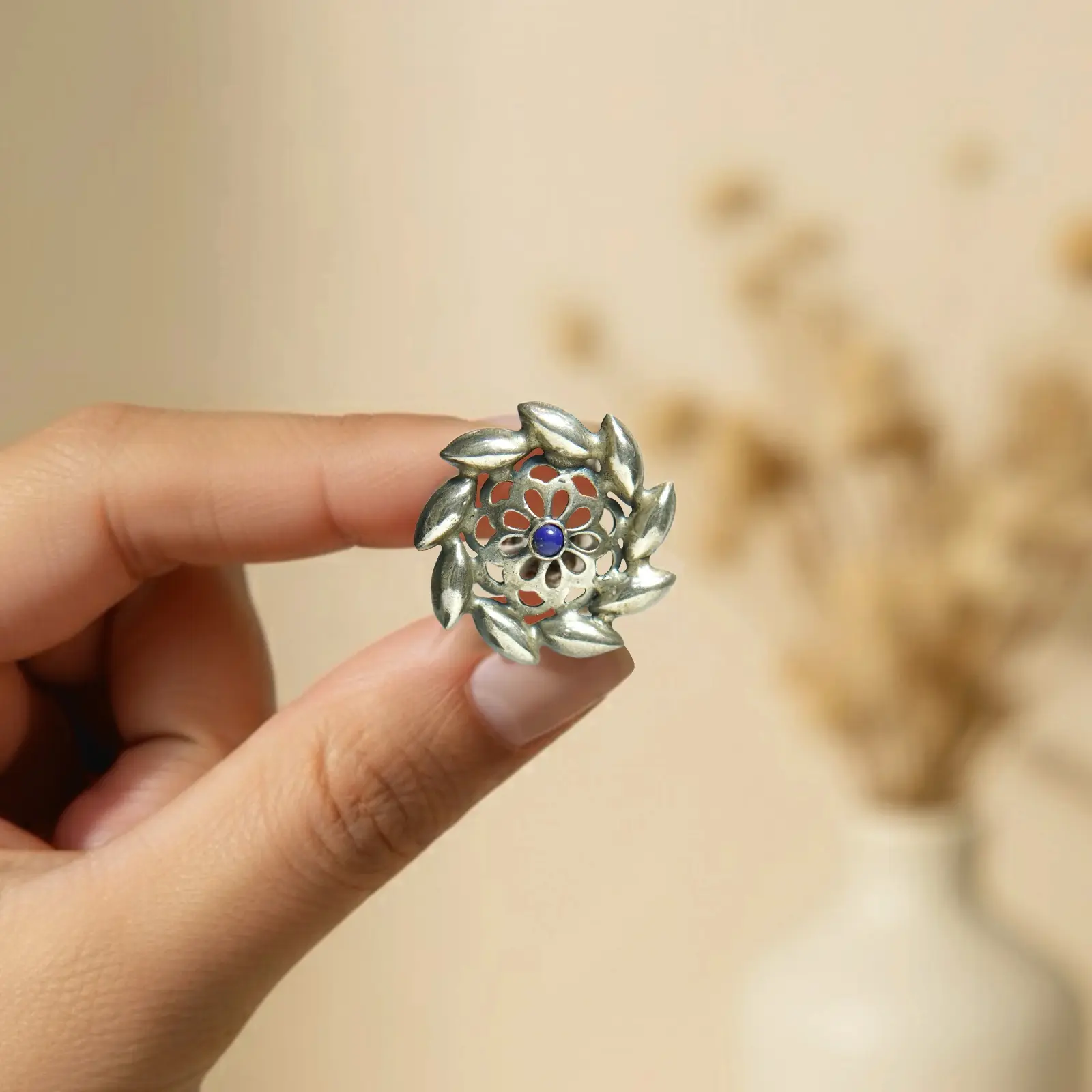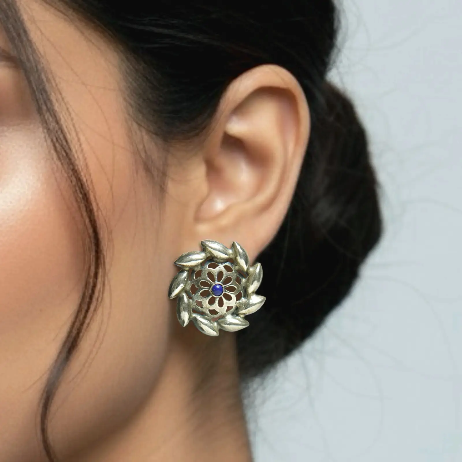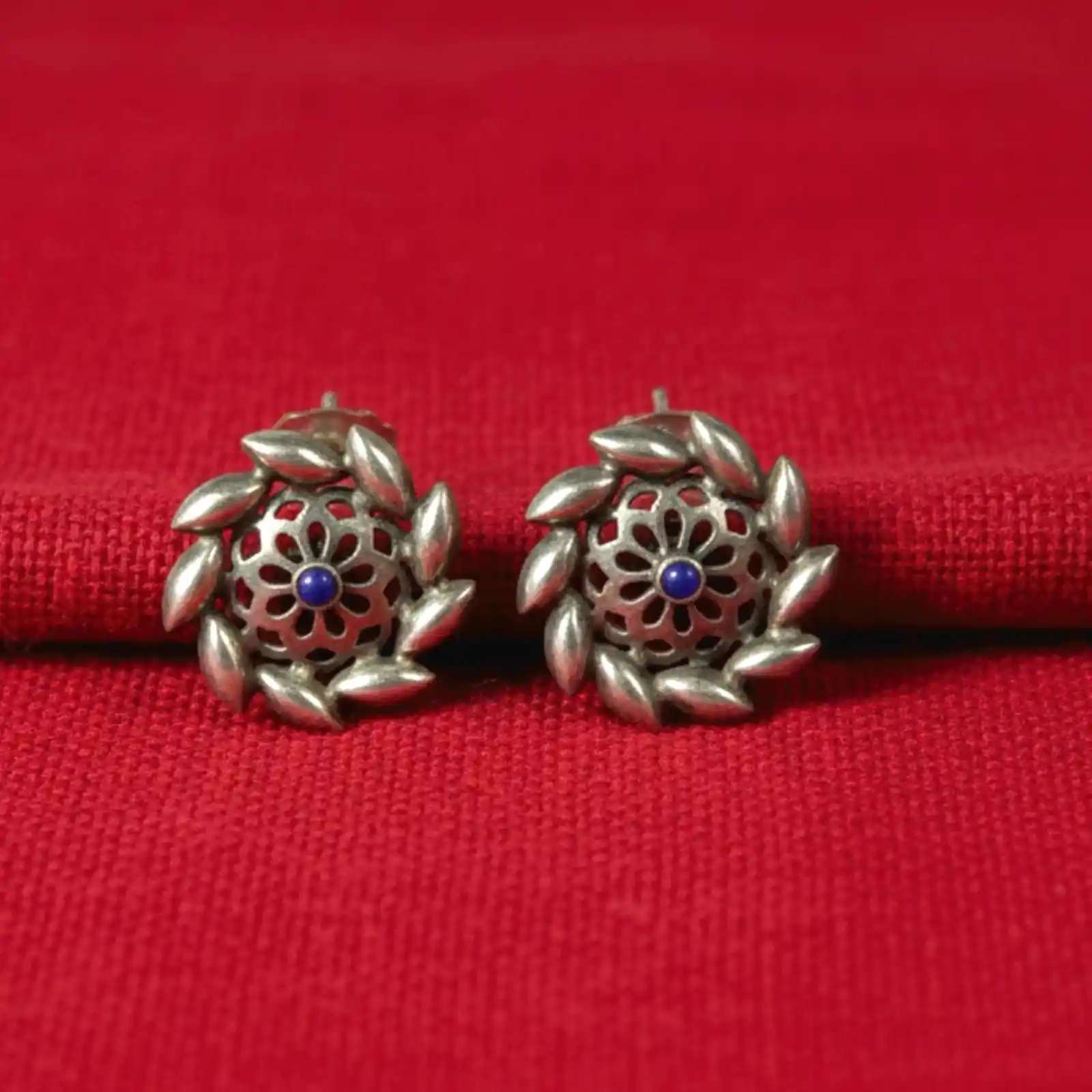 These round stud earrings feature a delicate floral center framed by layered petal motifs, giving them the look of a miniature wreath. A subtle blue accent stone sits at the core, adding a gentle touch of color without overpowering the refined silver finish. Lightweight and graceful, they bring a soft, feminine charm to both daily wear and special occasions. Dress-Pairing Suggestions • Pair with pastel kurtas, chiffon sarees or soft-tone salwar suits for a graceful daytime look. • Works beautifully with maroon, navy, lavender or cream dresses for an understated yet polished style. • For Western outfits, pair with flowy tops, linen dresses or elegant blouses to add a hint of artisanal charm.