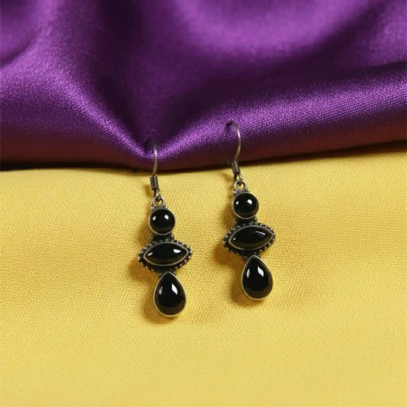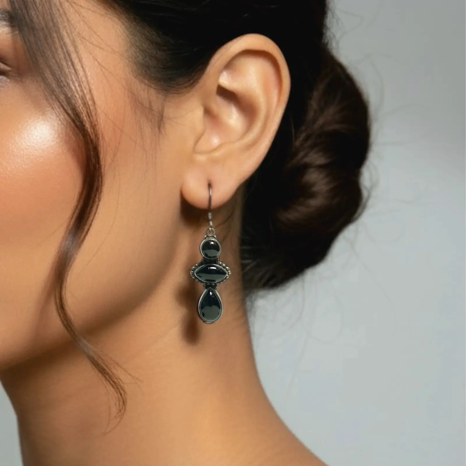 These elegant silver earrings feature a trio of glossy black stones in round, marquise, and teardrop shapes, creating a sleek and timeless silhouette. Their refined contrast makes them perfect for pairing with black sarees, evening gowns, solid kurta sets, or any monochrome outfit where you want a touch of understated sophistication.