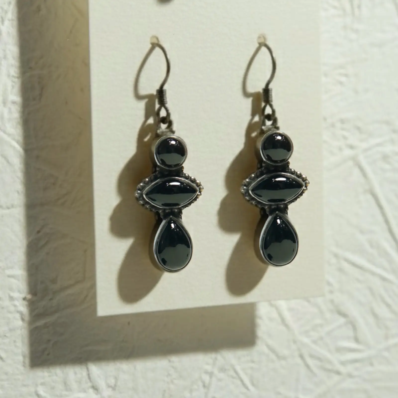 These elegant silver earrings feature a trio of glossy black stones in round, marquise, and teardrop shapes, creating a sleek and timeless silhouette....